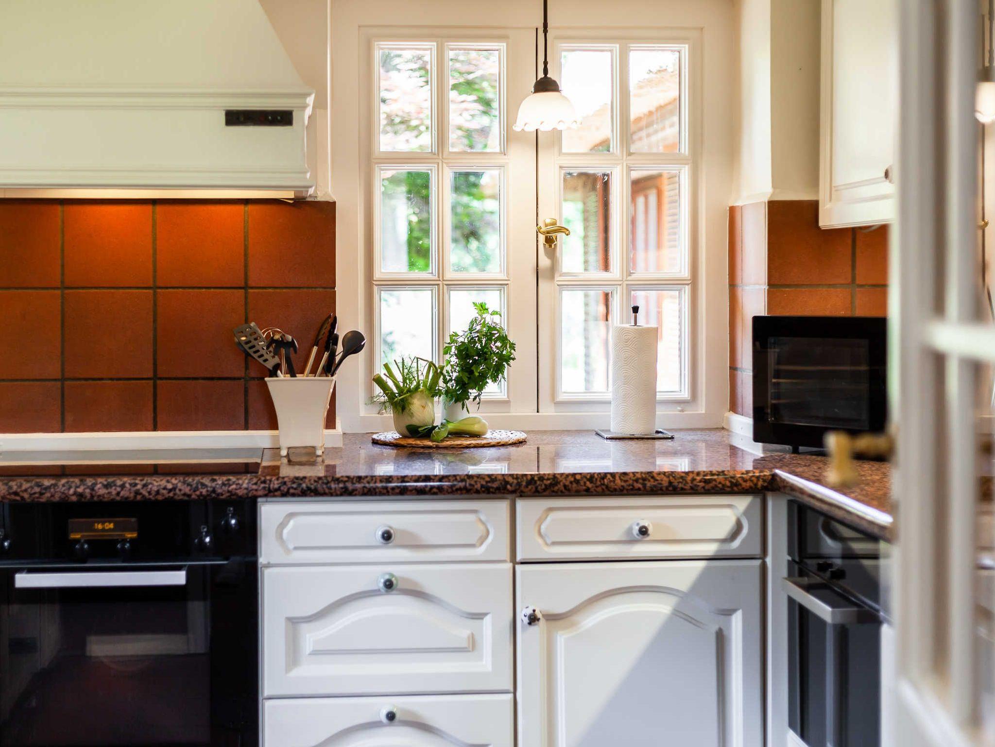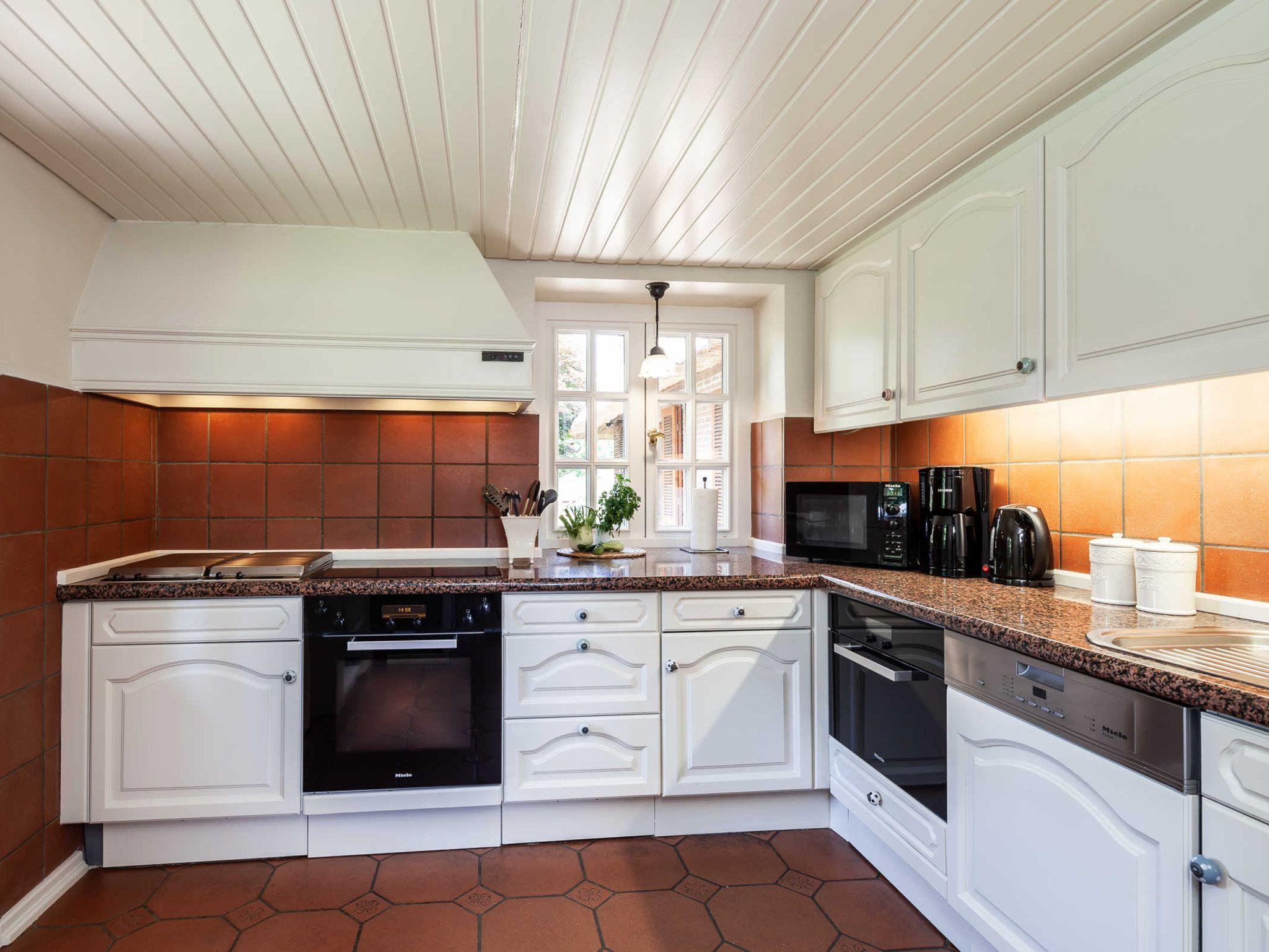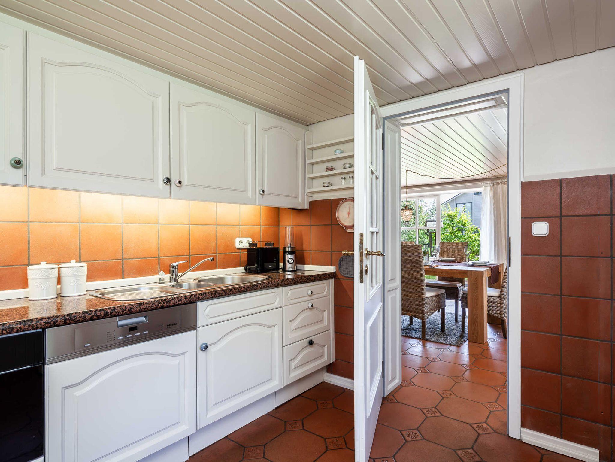 Die Küche ist rundum vollständig ausgestattet mit einer Kühl- Gefrierkombination, Geschirrspüler, Herd, Backofen, Wasserkocher, Mikrowelle, Kaffeemaschine und weiteres Zubehör. Über die Klöntür (oben und unten zu öffnen) gelangen die Gäste in den Garten zum schönen Poolbereich.