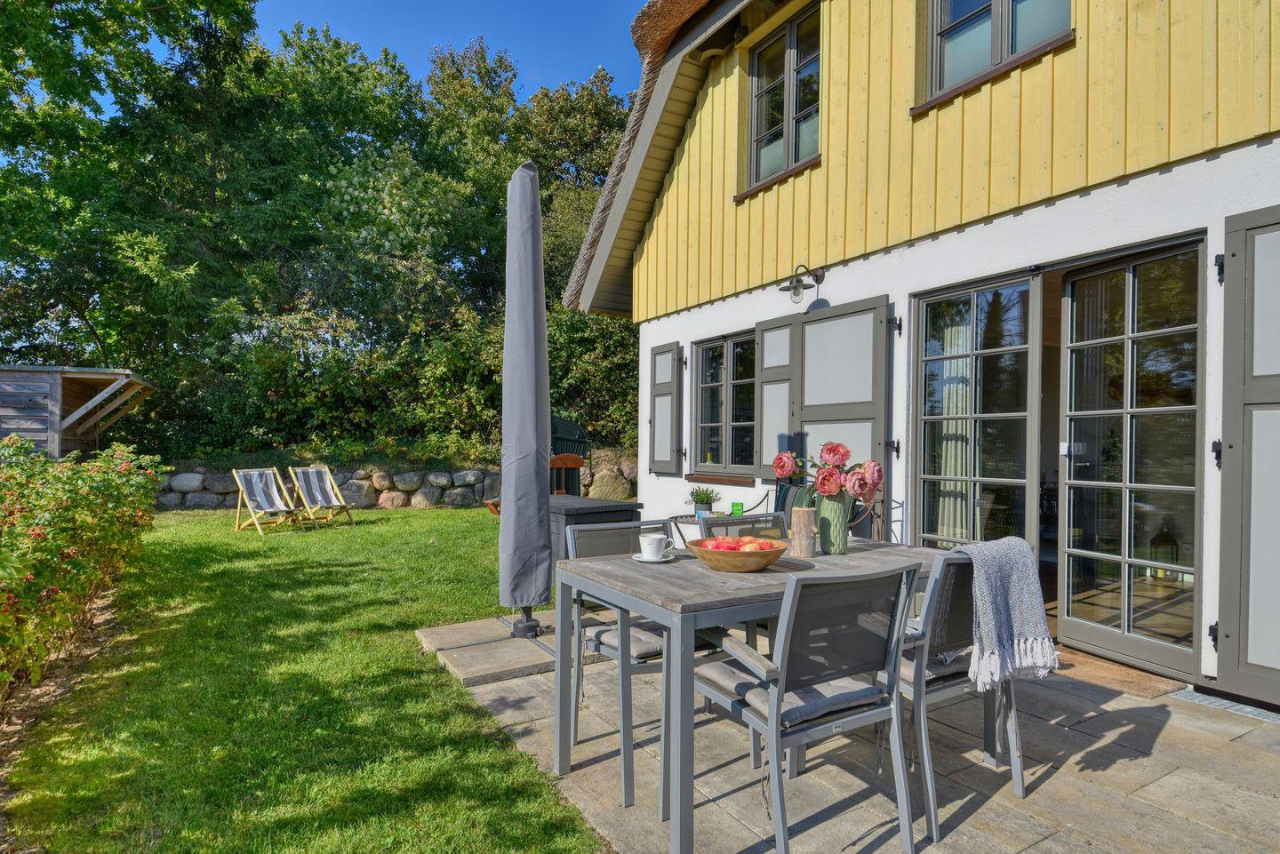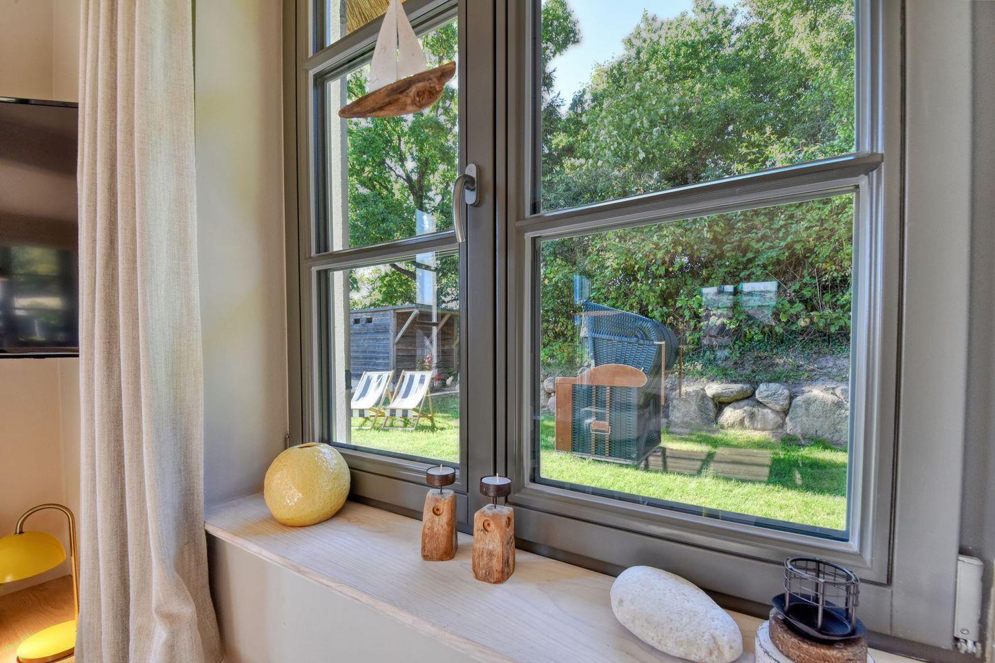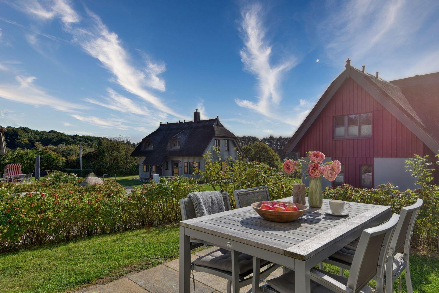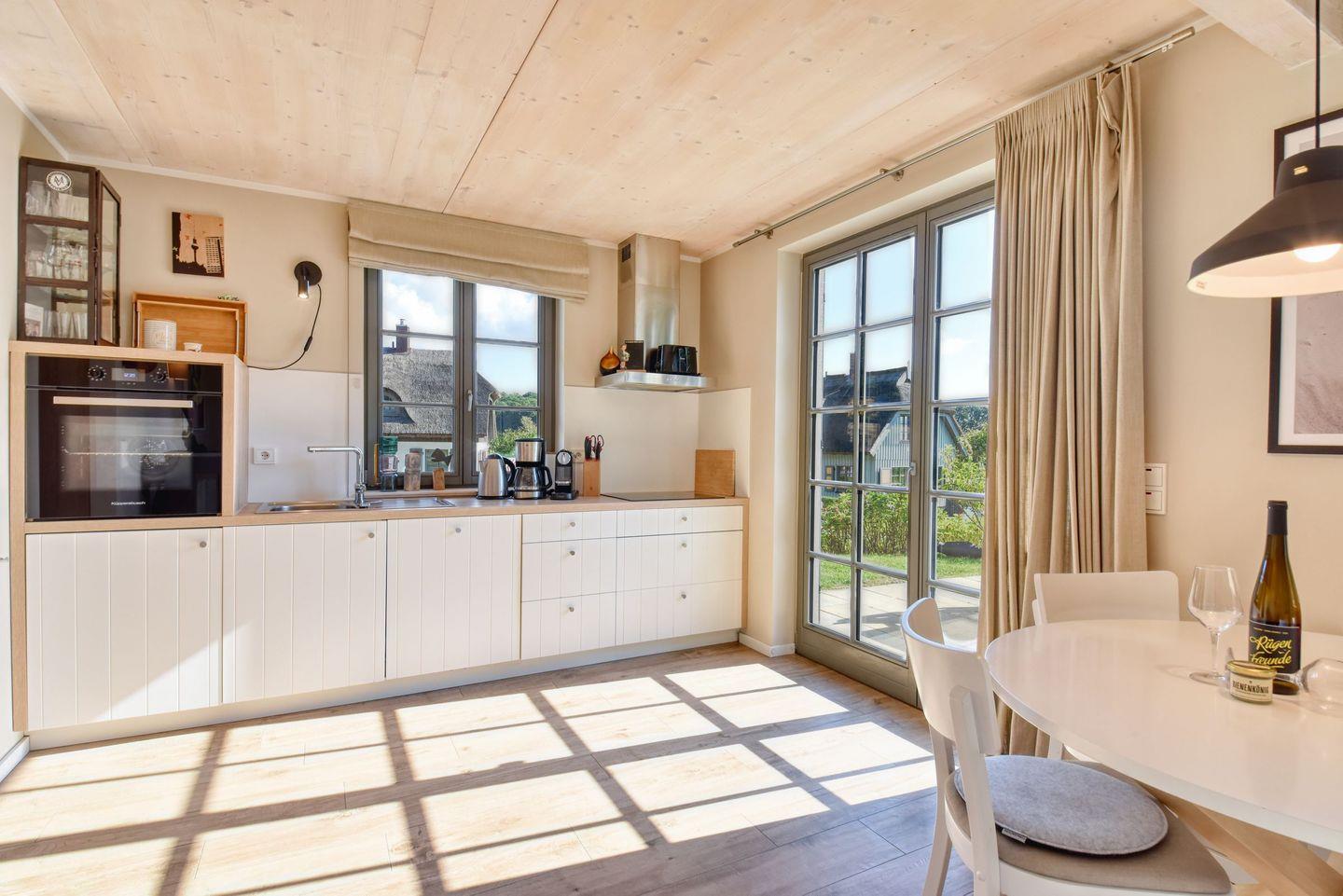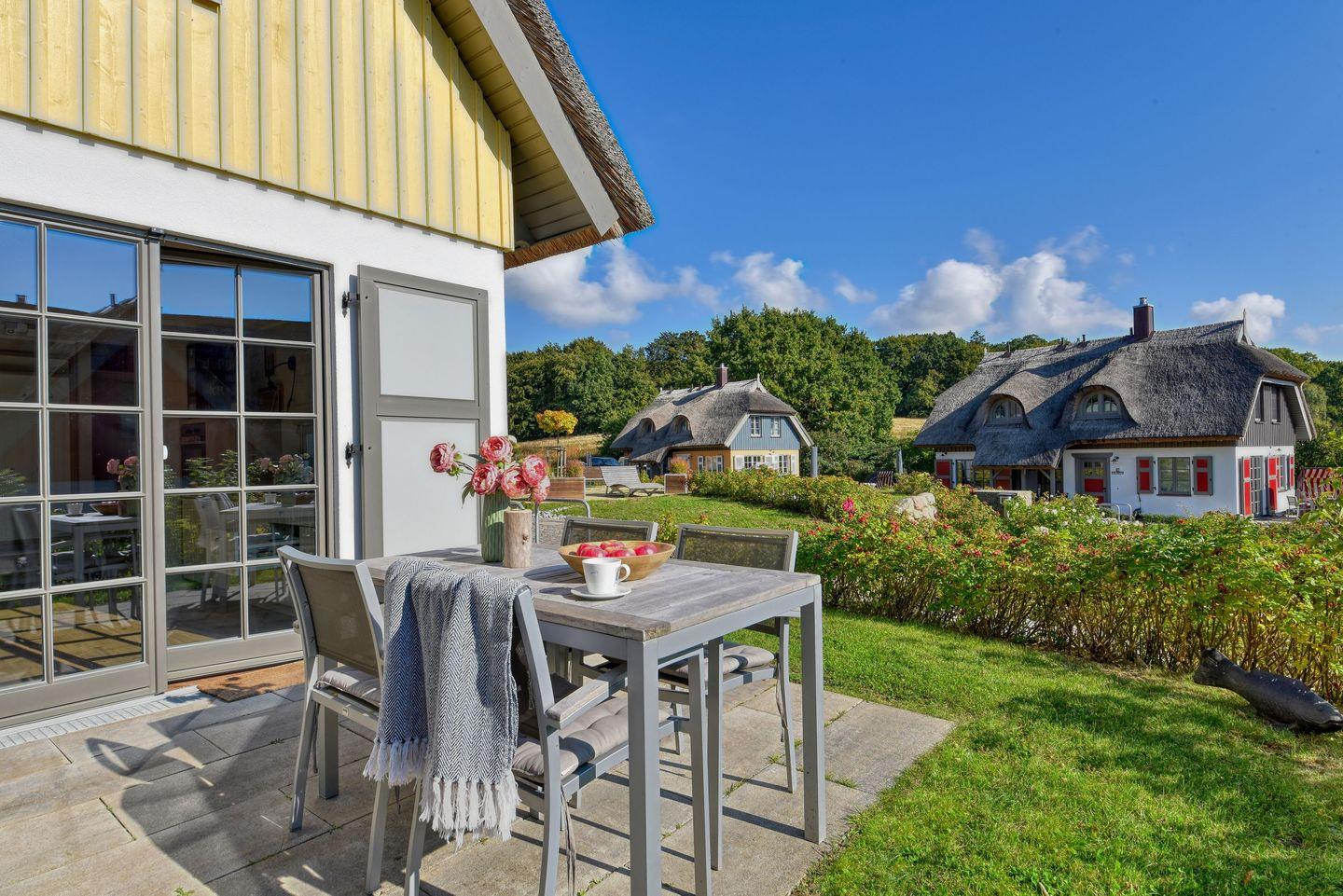 Im Feriendorf Klein Stresow werden Sie auf 60 Quadratmeter in Ihrer eigenen, stylischen Ferienhaushälfte mit Garten und Weitblick begrüßt. Hier beginnt der Urlaub für bis zu 4 Personen schon beim Eintreten. Wenn Sie es genau nehmen, schon beim Ankommen. Das Auto auf dem für Sie reservierten Stellplatz abgestellt, können Sie bei so viel sonniger Leichtigkeit erst einmal richtig durchatmen. Öffnen Sie die bodentiefen Fenster zu Ihrer Südterrasse weit und genießen Sie die frische Ostseebrise. Hier lässt es sich ausgezeichnet frühstücken. Das Innere Ihrer Ferienhaushälfte ist bis ins Detail aufs Feinste eingerichtet. Lampen, Möbel und Bilder sind nordisch nobel. Ein Sofa lädt zum Relaxen ein. Zur Ausstattung des Wohn-Esszimmers gehören ein Kamin und ein Flat-TV. Das WLAN können Sie kostenfrei nutzen. Ein schöner Esstisch mit vier Stühlen eignet sich bestens für die Mahlzeiten.
