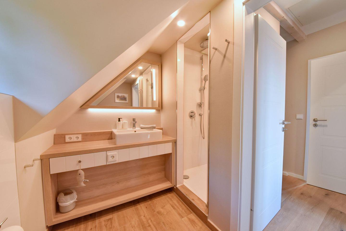 Zubereiten können Sie sie in der offenen und modernen Küche. Alle Geräte sind hochwertig. Ein komplettes Geschirr-Service befindet sich in den Schränken. Abwaschen muss hier zum Glück niemand. Es gibt einen Geschirrspüler. Weiter geht’s mit den beiden komfortablen Schlafzimmern. Ein bequemes Boxspringdoppelbett (180 x 200) und zwei Boxspringeinzelbetten (90 x 200) versprechen erholsame Träume. Die Zimmer verfügen über je einen Kleiderschrank und ebenfalls einen Flat-TV. Zwei Bäder mit Dusche und WC sorgen für genügend Raum zum Frischmachen. Das Bad im EG ist zudem mit einer Finnischen Sauna ausgestattet. Bei Anreise liegen Handtücher für Sie bereit und die Betten sind bezogen.
