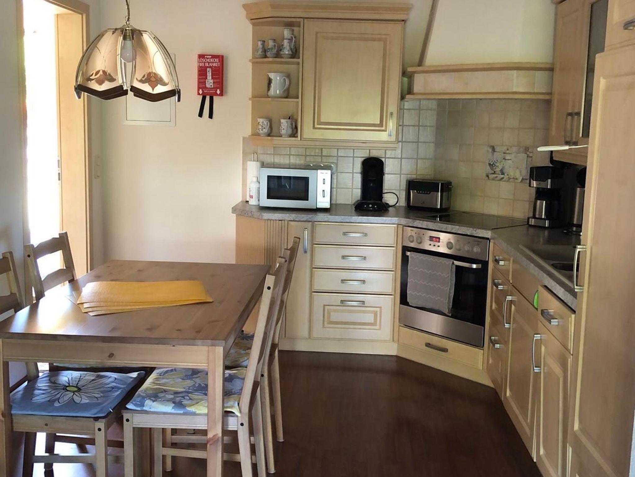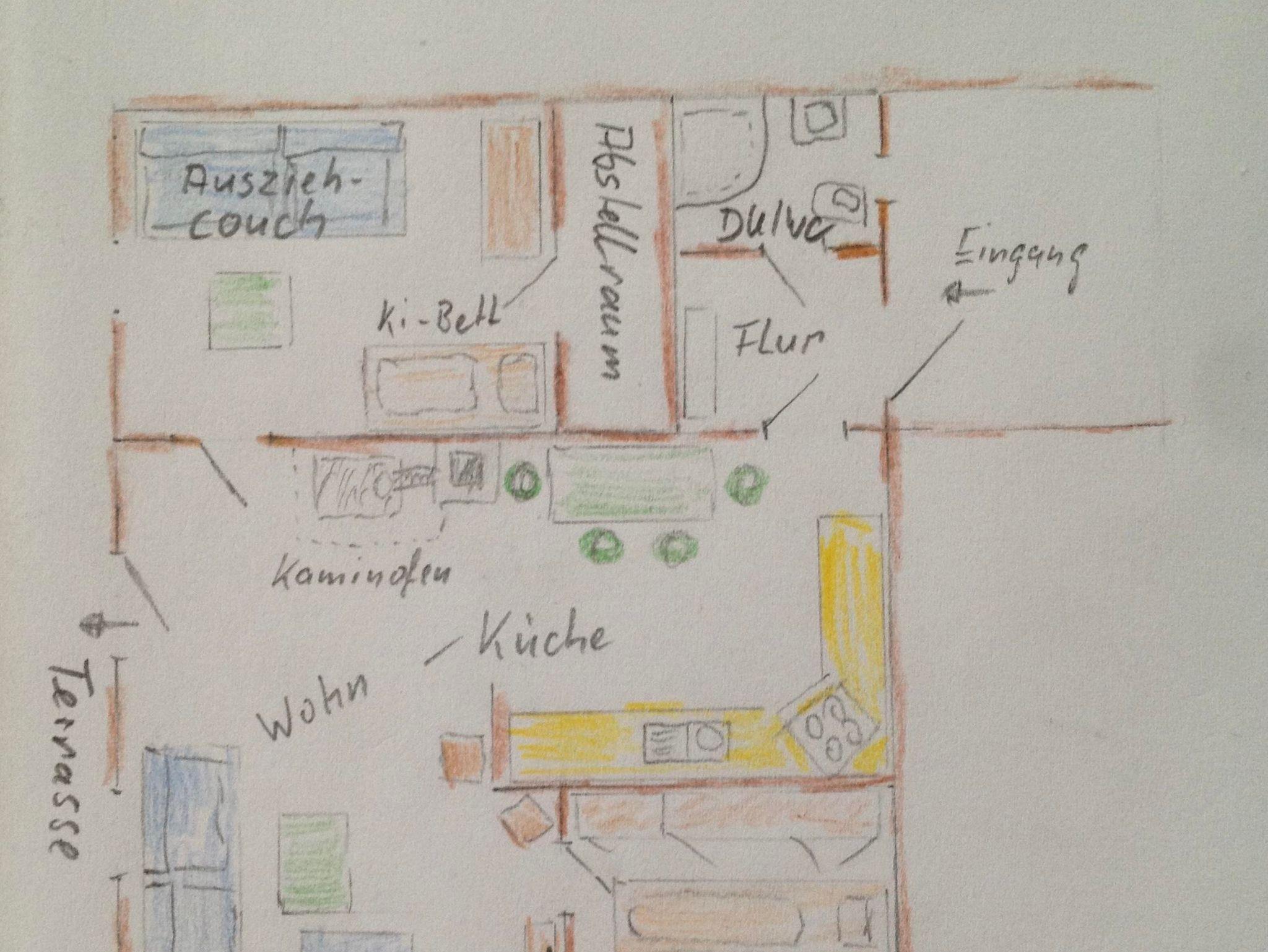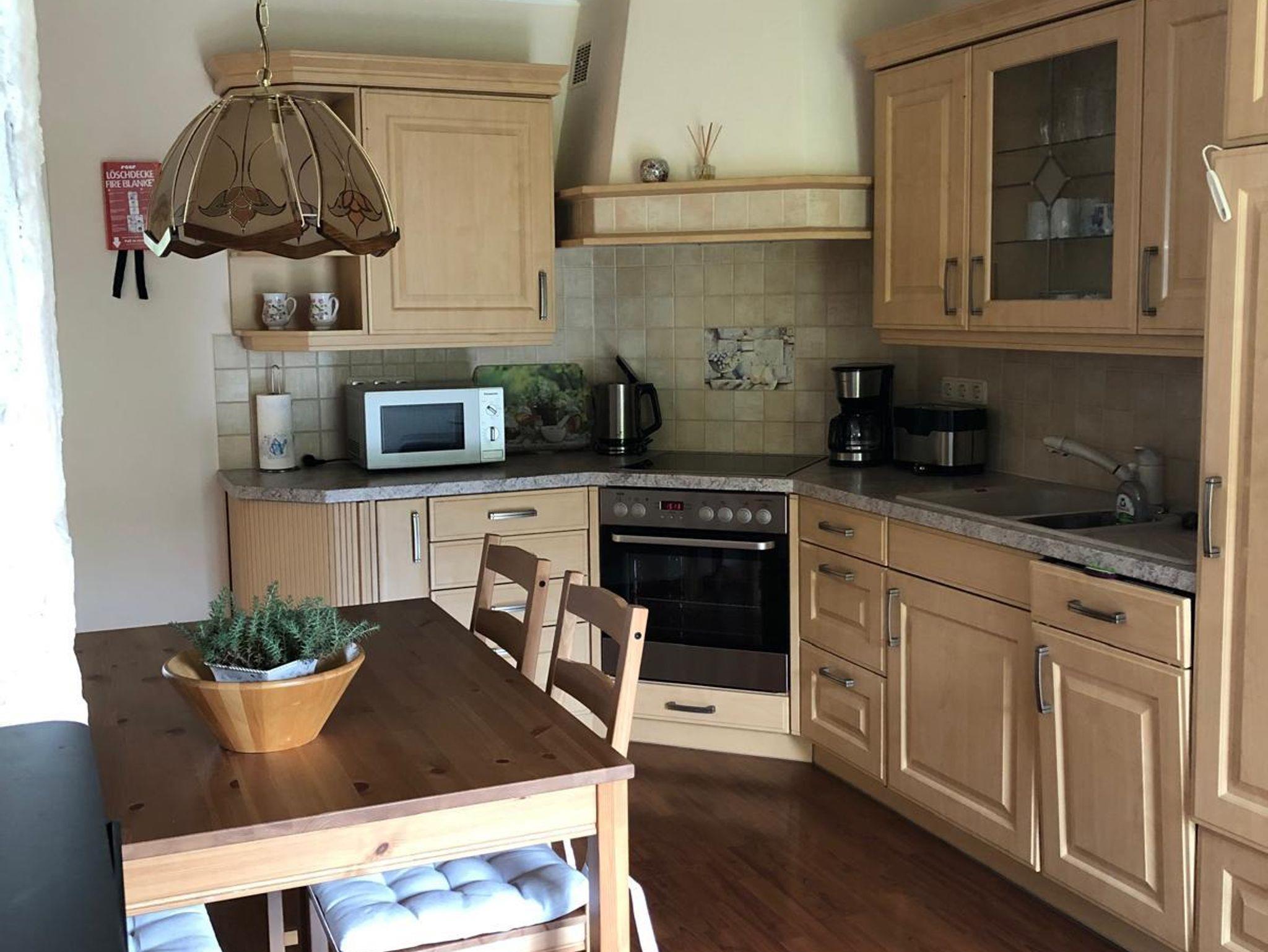 • Küchenbereich- Eßplatz für 4 Personen, komplette Einbauküche mit Gefrier-Kühlkombination, Spülmaschine und vielen nützlichen Küchenutensilien sowie einigen Kochbücher aus dem Vogtland