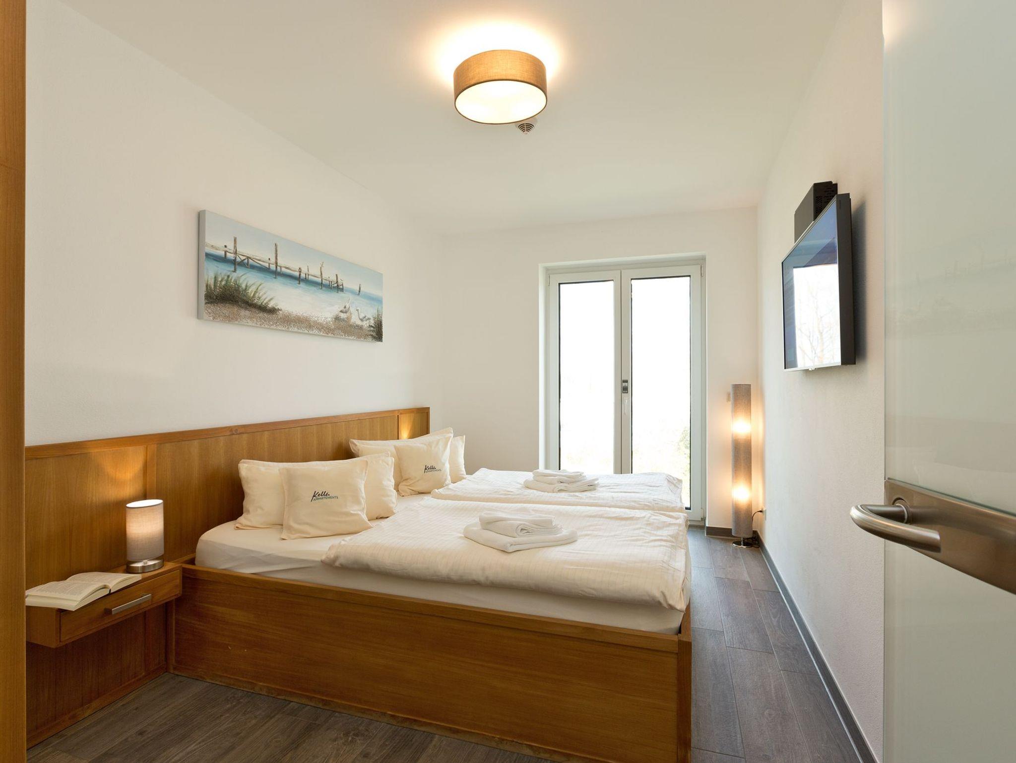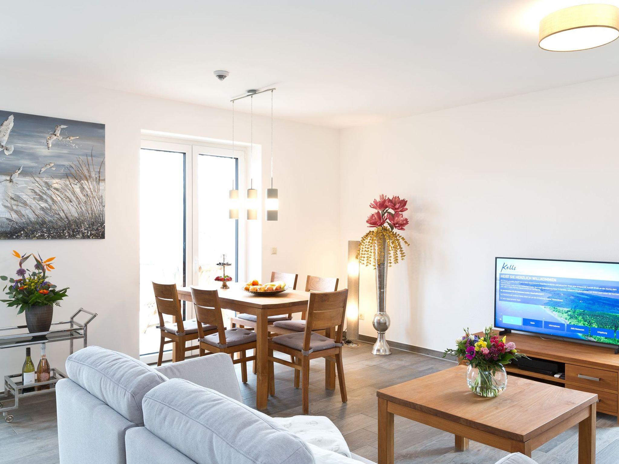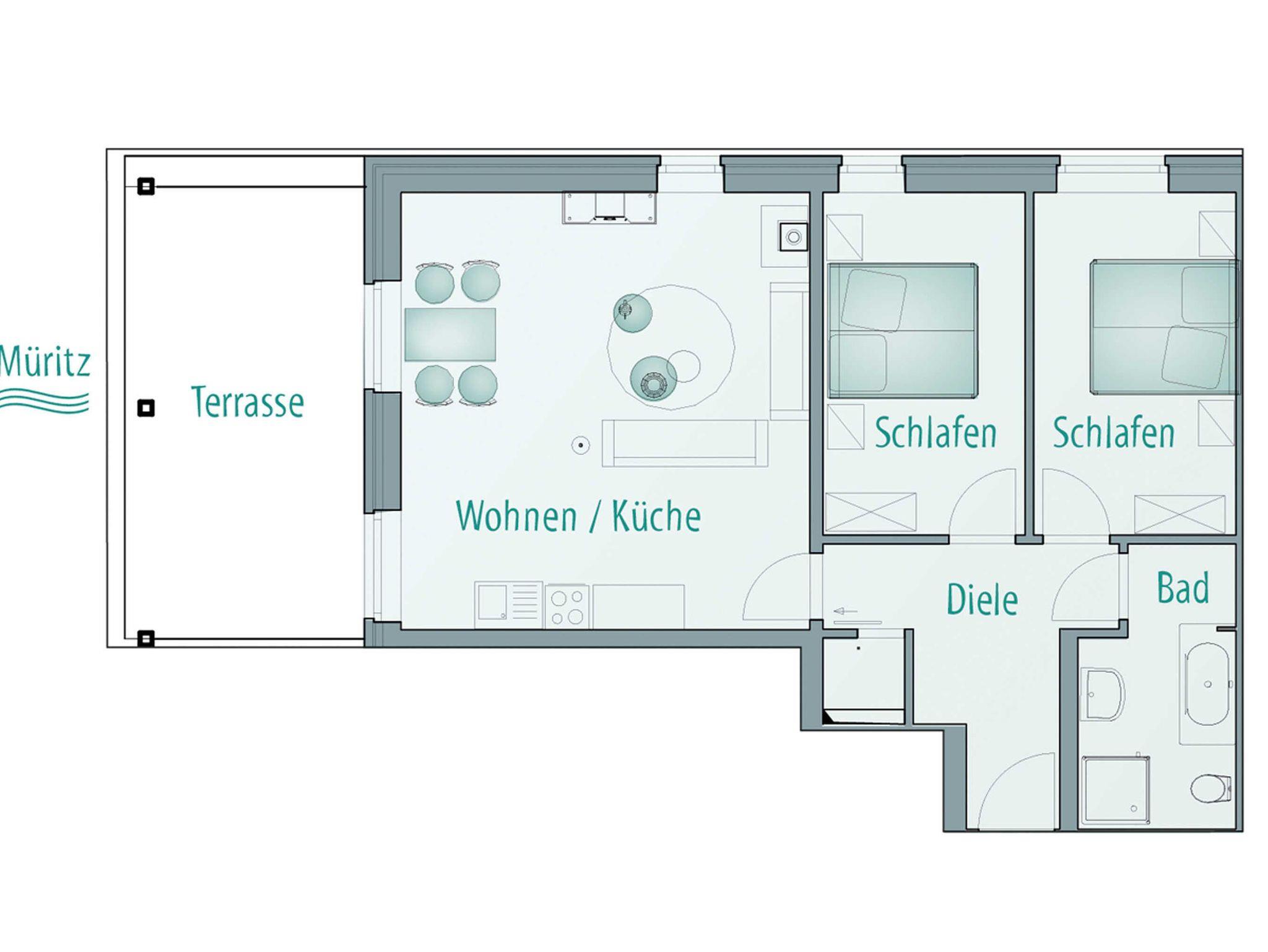Ein großes Wohnzimmer mit offener Küchenzeile und gemütlichem Essbereich, zwei gleich große Schlafzimmer, eine Schlafcouch im Wohnzimmer für zwei weitere Gäste, eine Vollbad mit Wanne und separater Dusche und ein 20 m² großer Balkon / eine 20 m² große Terrasse: Das ist unser Appartement „Großes Meer“ mit direktem Müritzblick ? ein Urlaubs-Zuhause für die ganze Familie. Bei Anreise sind die Betten bereits bezogen und ein Handtuchpaket (3 Handtücher, 1 Bademantel) liegt für jeden Gast bereit. Nach 7 Übernachtungen werden Handtücher und Bettwäsche kostenlos gewechselt.