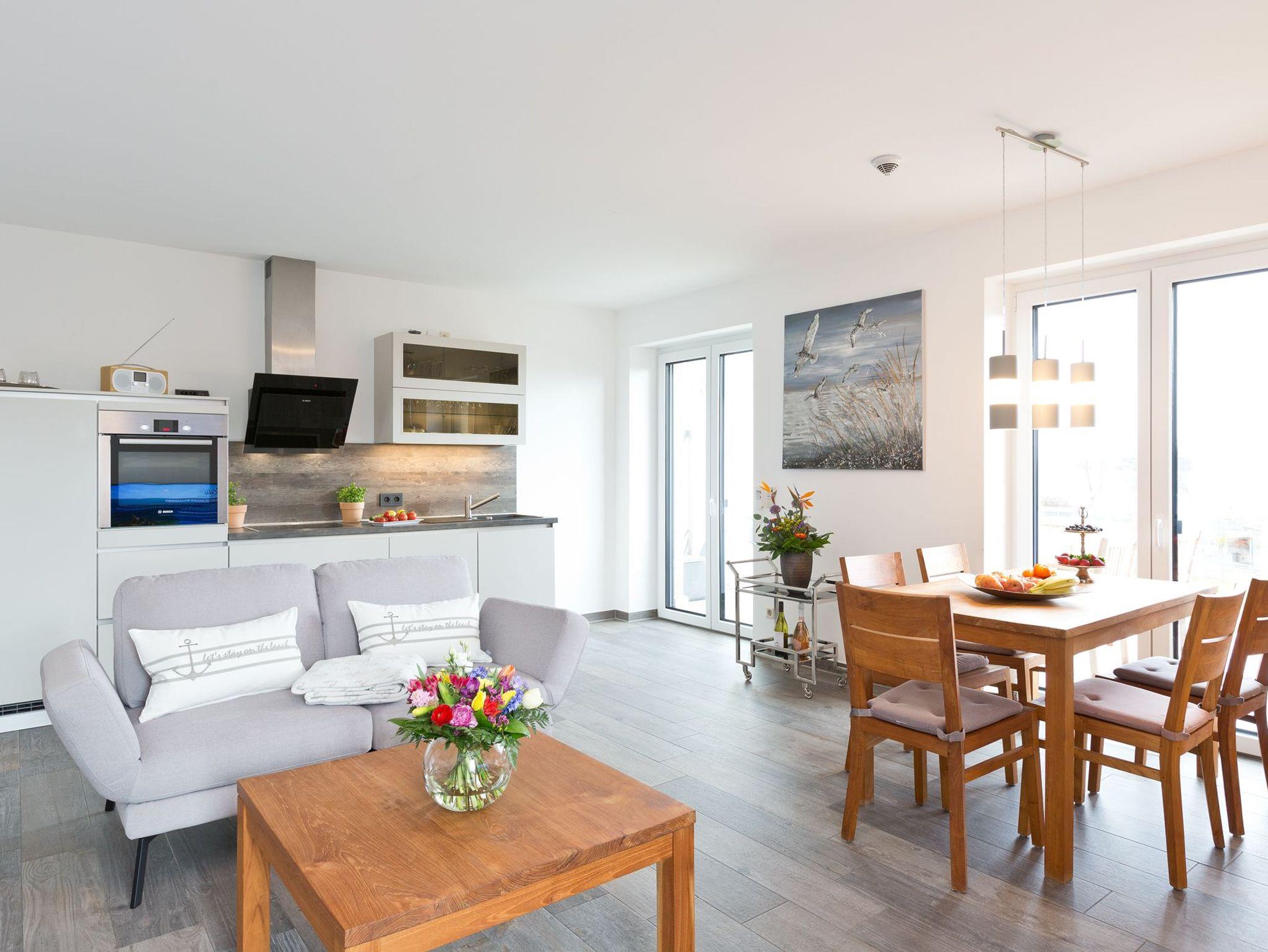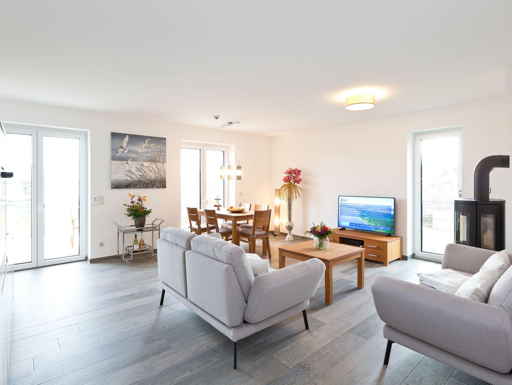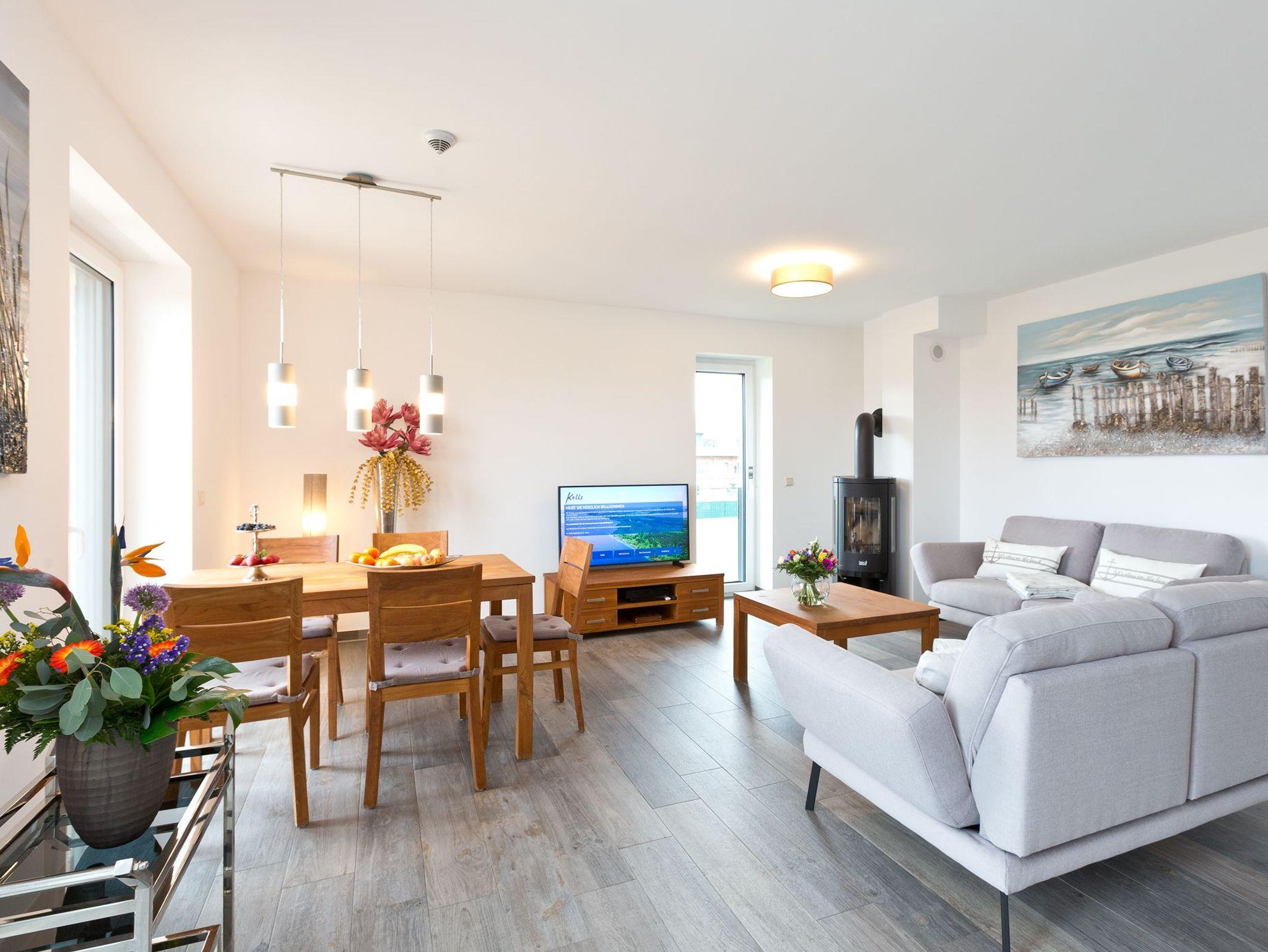 Ein großes Wohnzimmer mit offener Küchenzeile und gemütlichem Essbereich, zwei gleich große Schlafzimmer, eine Schlafcouch im Wohnzimmer für zwei weitere Gäste, eine Vollbad mit Wanne und separater Dusche und ein 20 m² großer Balkon / eine 20 m² große Terrasse: Das ist unser Appartement „Großes Meer“ mit direktem Müritzblick ? ein Urlaubs-Zuhause für die ganze Familie. Bei Anreise sind die Betten bereits bezogen und ein Handtuchpaket (3 Handtücher, 1 Bademantel) liegt für jeden Gast bereit. Nach 7 Übernachtungen werden Handtücher und Bettwäsche kostenlos gewechselt.