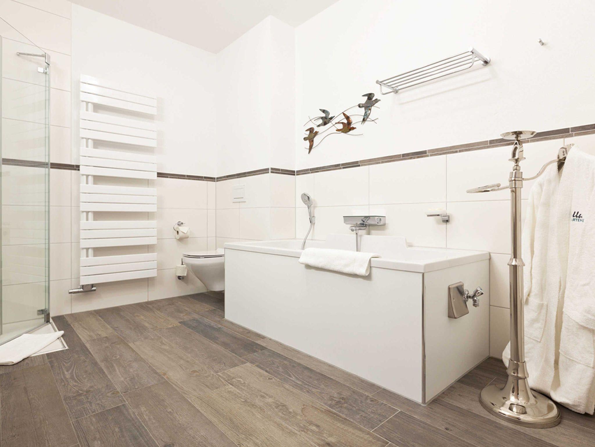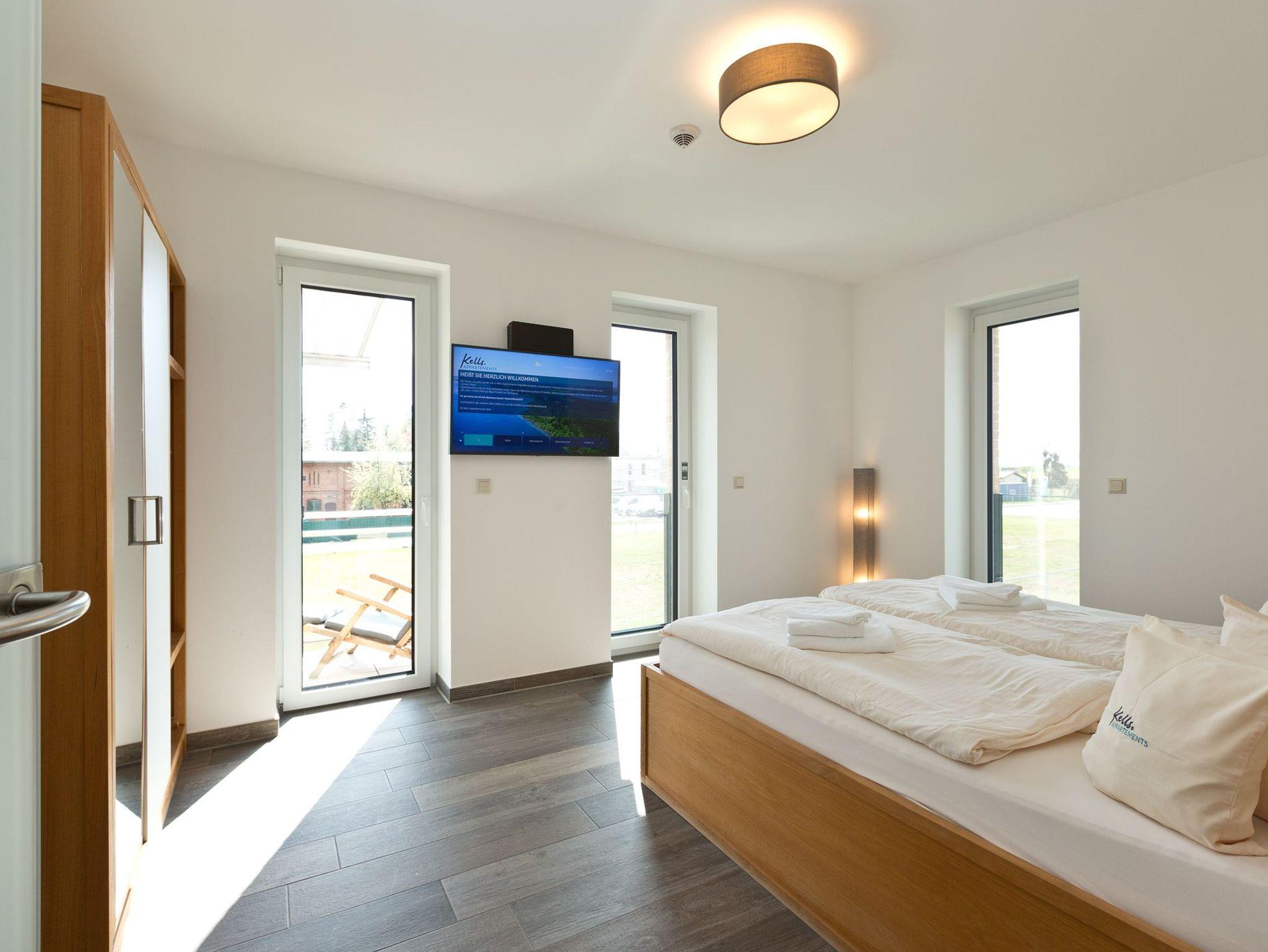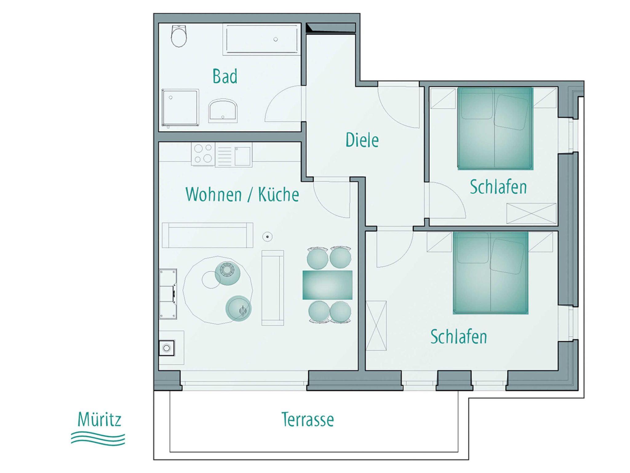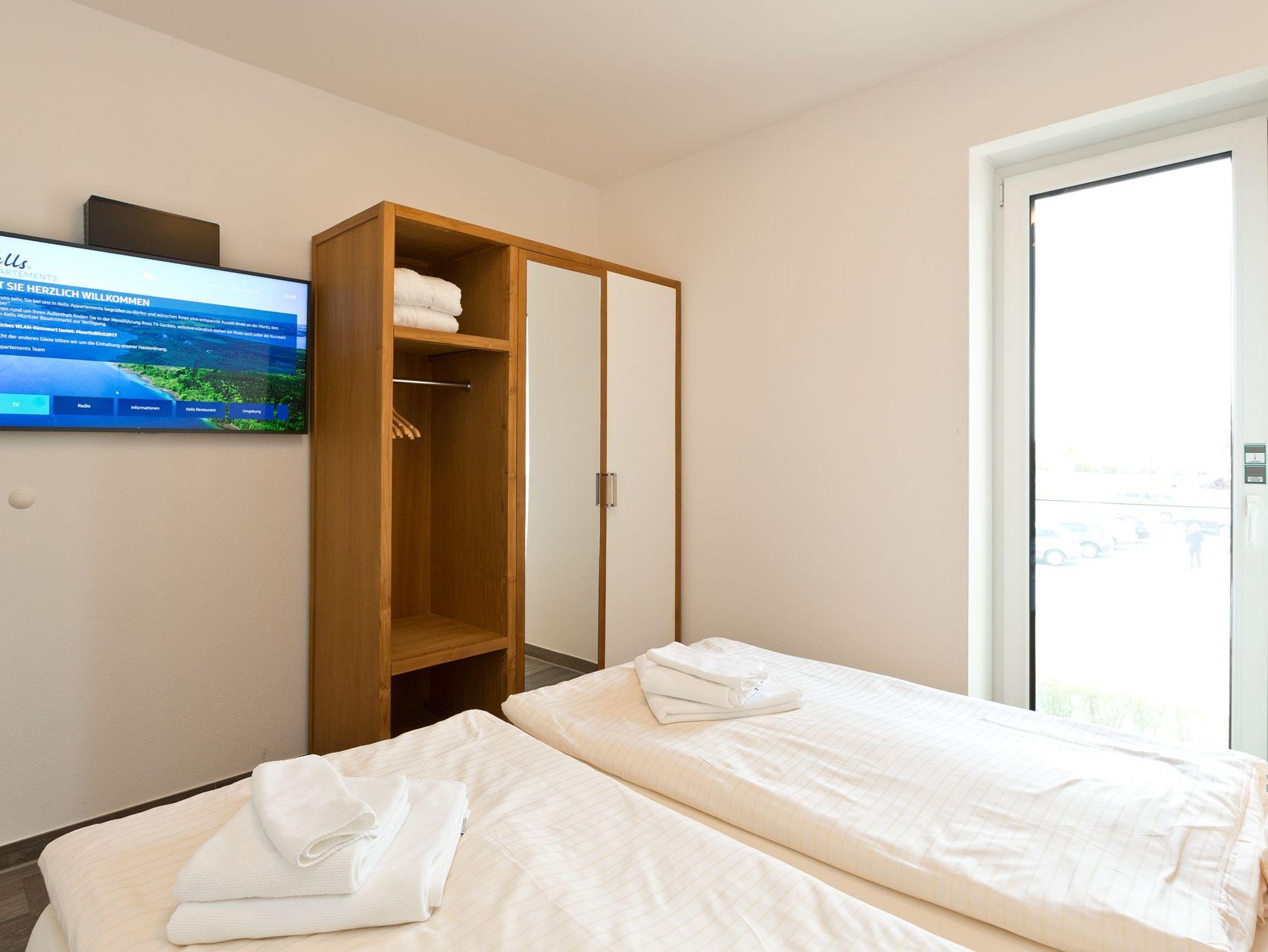 Ein extra großes Wohn-/Esszimmer mit offener Küchenzeile, ein großes und ein kleines Schlafzimmer, ein Badezimmer mit großer Wanne und extra Dusche, ein kleiner Abstellraum und ein 10 m² großer Balkon / eine 10 m² große Terrasse: Das ist unser „Mittelmeer“ mit seitlichem Müritzblick, das Appartement für die Familie oder für zwei befreundete Paare. Bei Anreise sind die Betten bereits bezogen und ein Handtuchpaket (3 Handtücher, 1 Bademantel) liegt für jeden Gast bereit. Nach 7 Übernachtungen werden Handtücher und Bettwäsche kostenlos gewechselt.