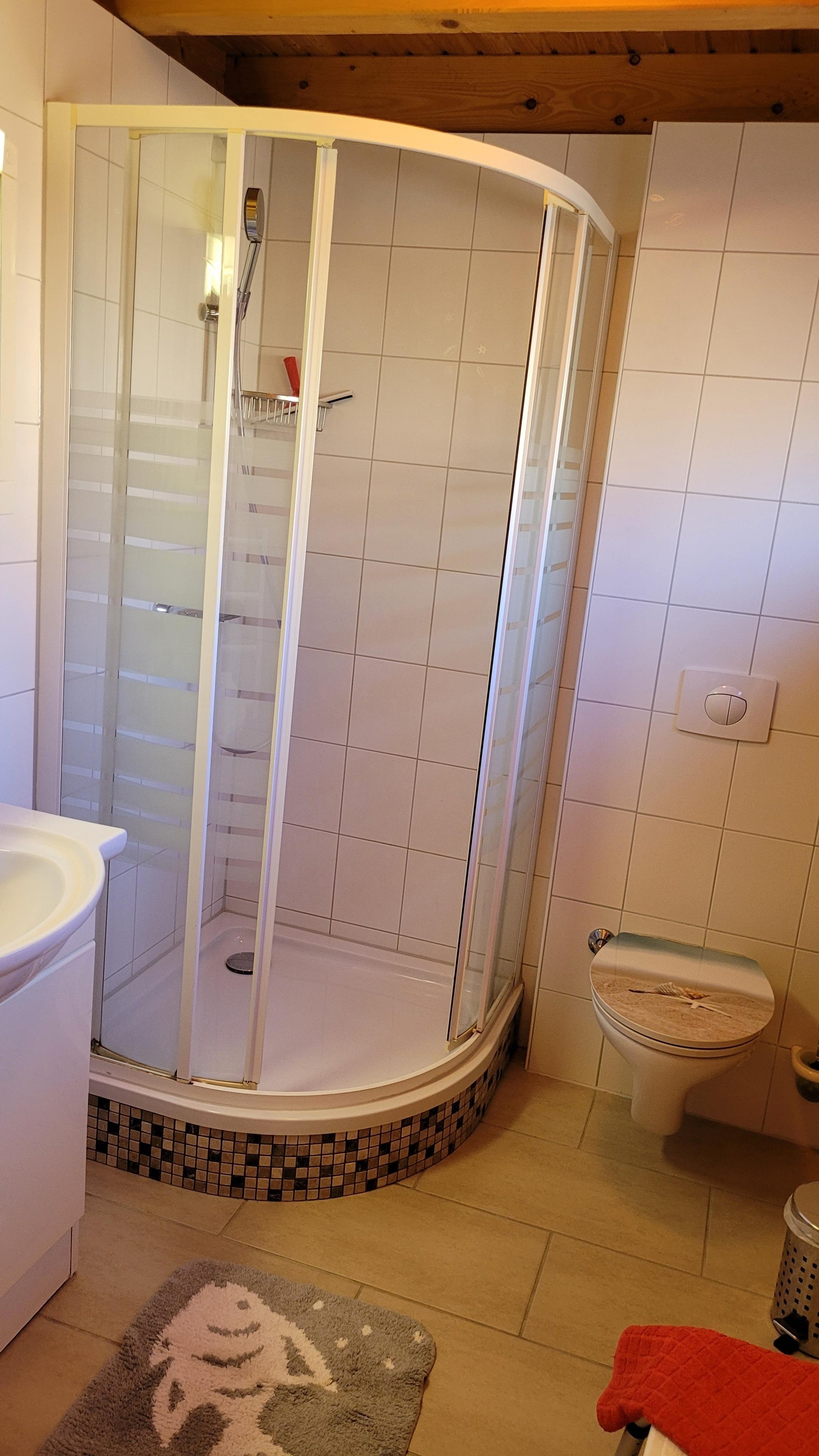 Die Ferienwohnung erstreckt sich über 2 Etagen. Im Erdgeschoß befindet sich der Wohnraum, die Küche mit Eßecke und das Bad mit Dusche/WC und Waschtisch. Durch eine Balkontür gelangen Sie zur Außenterrasse. Wohnraum, Küche und Eßecke sind als offene Bereiche miteinander verbunden. Der Wohnbereich ist mit einem Sat-TV, CD-Player, Radio und einer gemütlichen Couch ausgestattet.