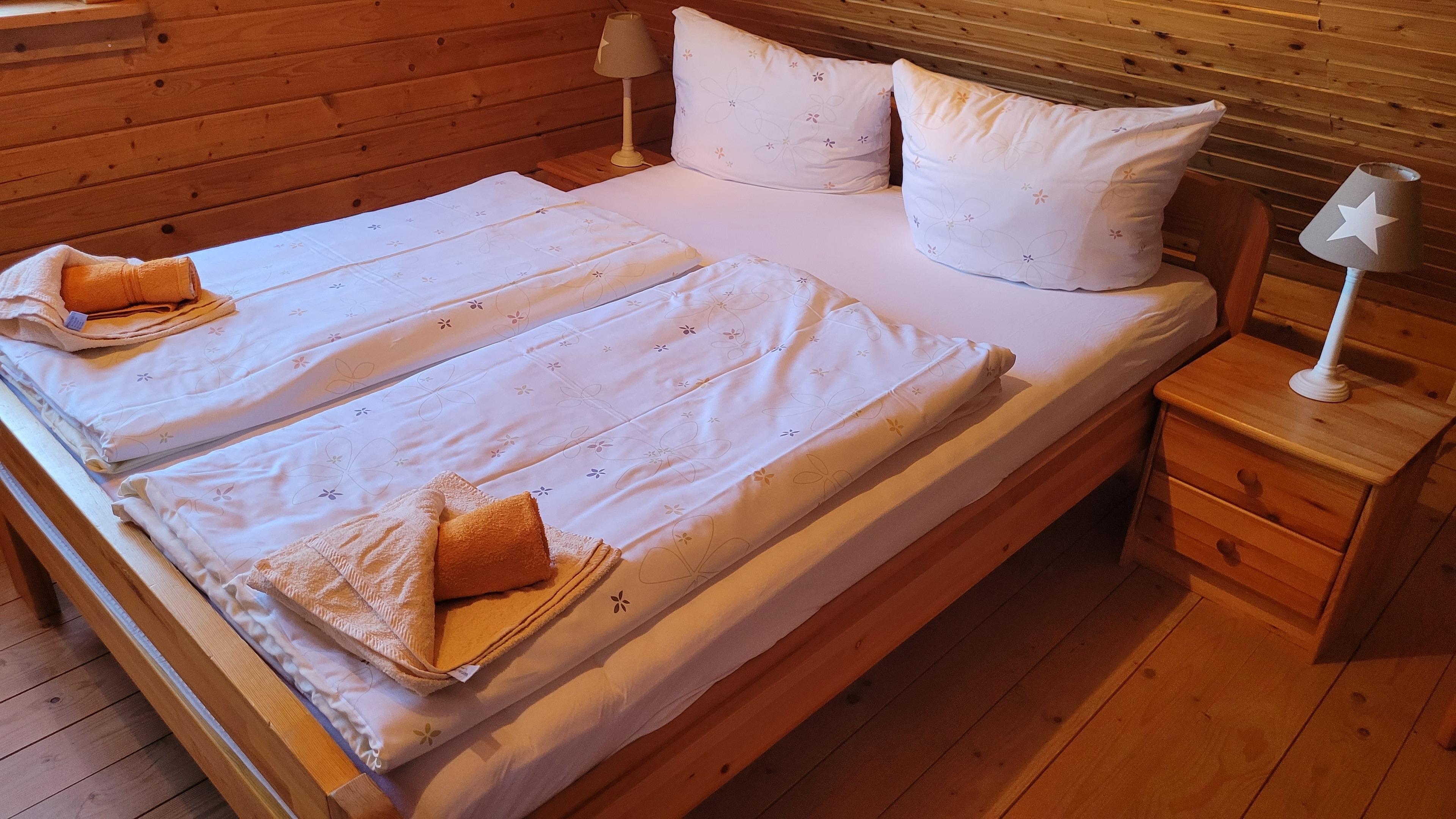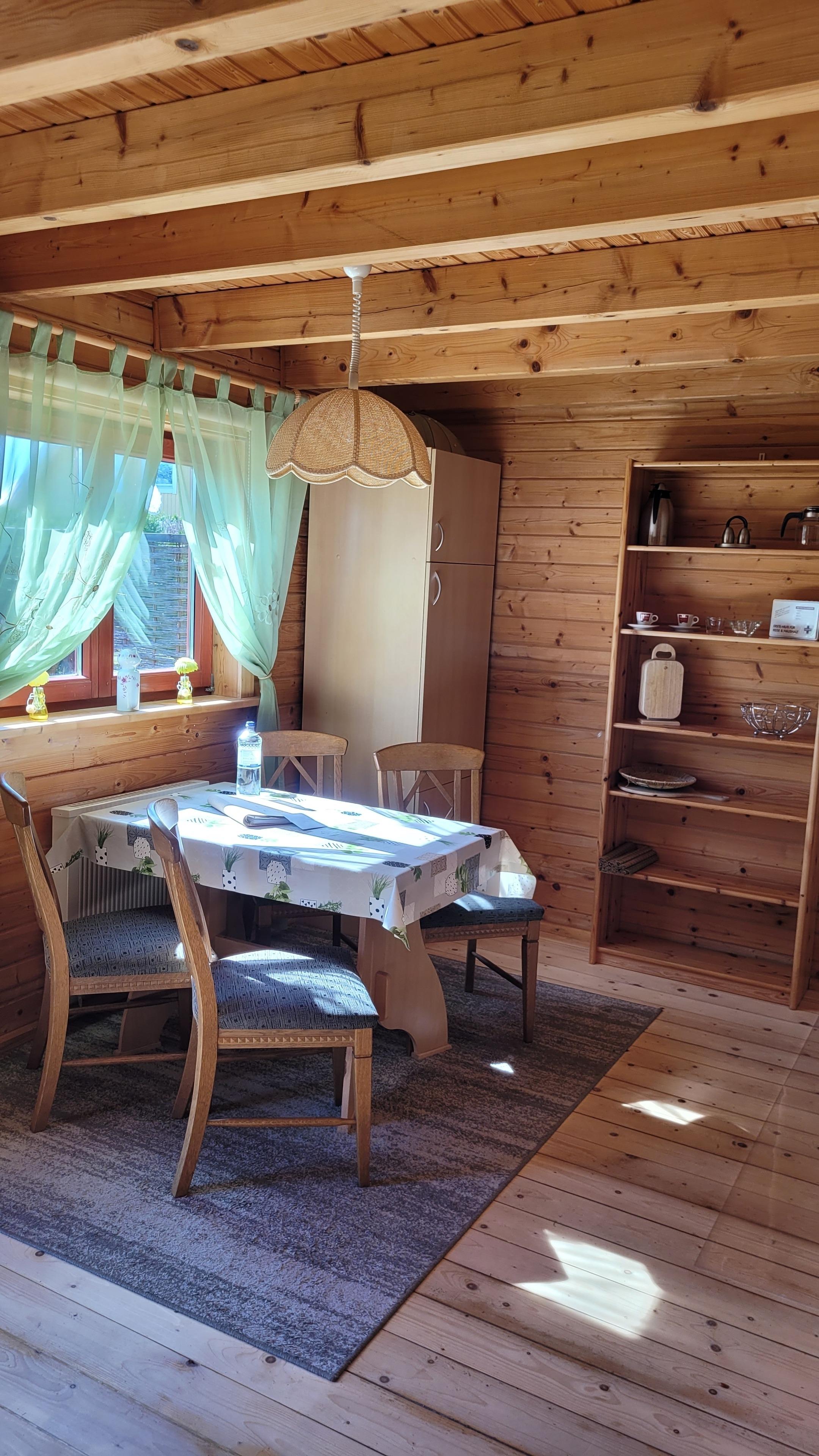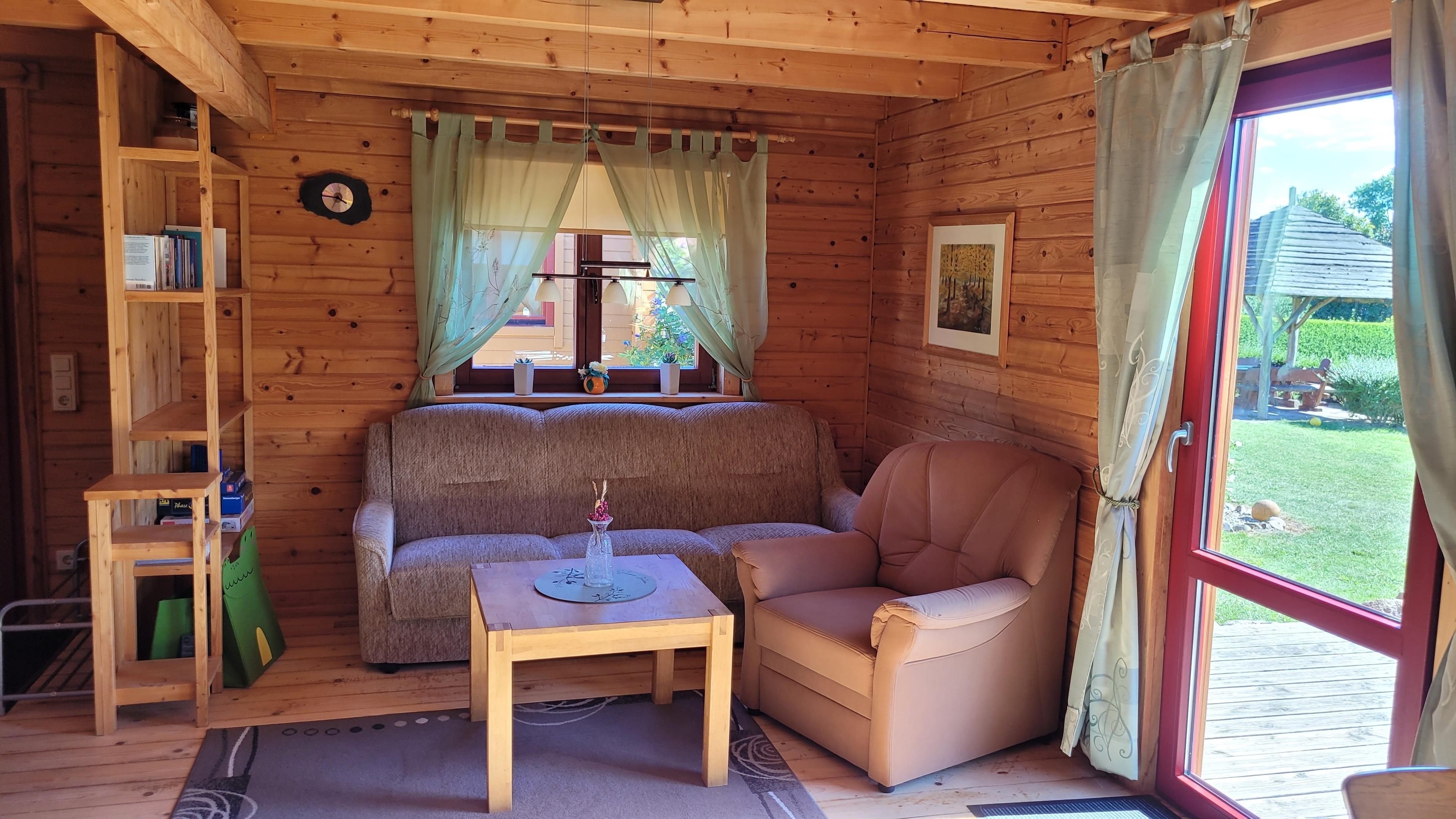 Gemütliches Ferienhaus als Doppelhaushälfte, im Blockbohlenstil, 1, 5-geschossig für 4 Personen möglich plus Baby. Sie können unsere Ferienhäuser, sowie das gesamte Grundstück mit dem Teich genießen.