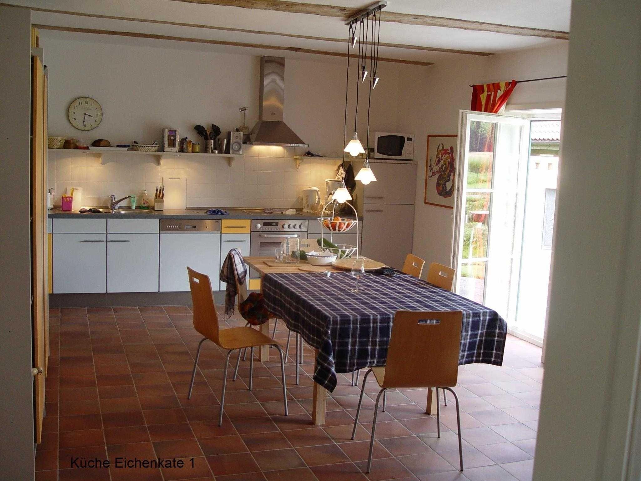 • große Küche mit Spülmaschine, Cerankochfeld, Backofen und großem Esstisch für 6 Personen