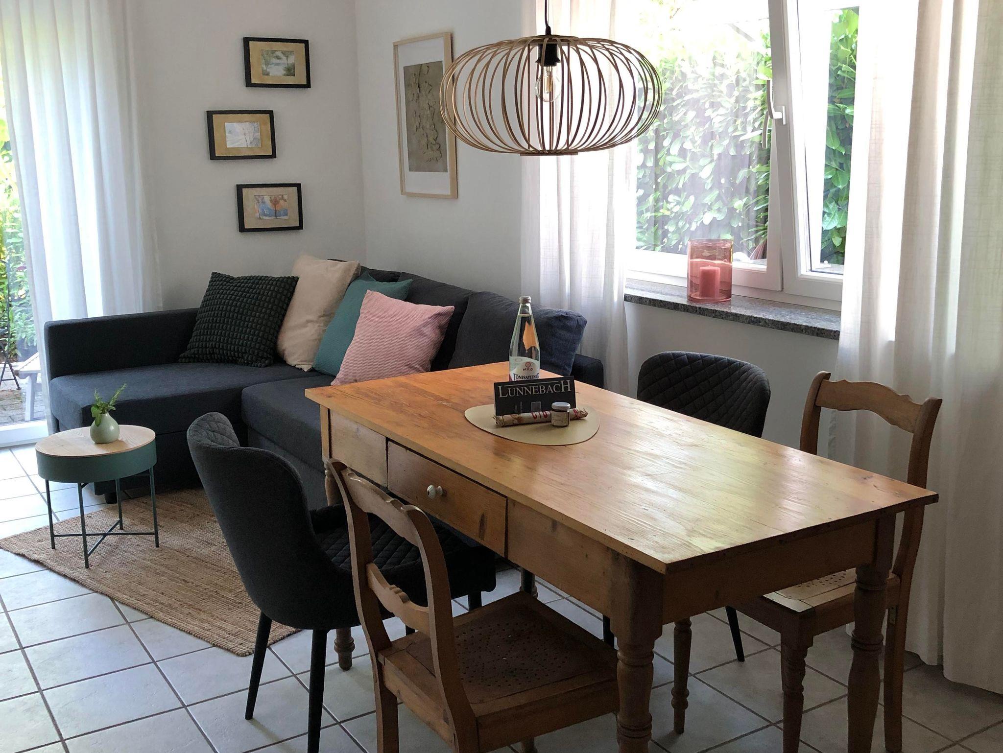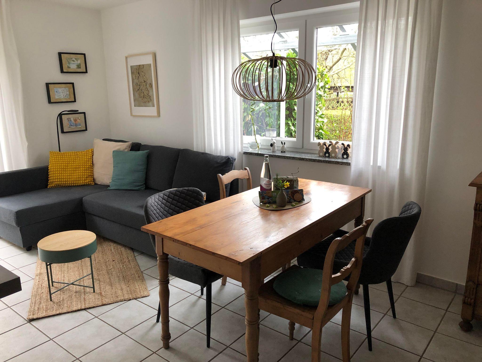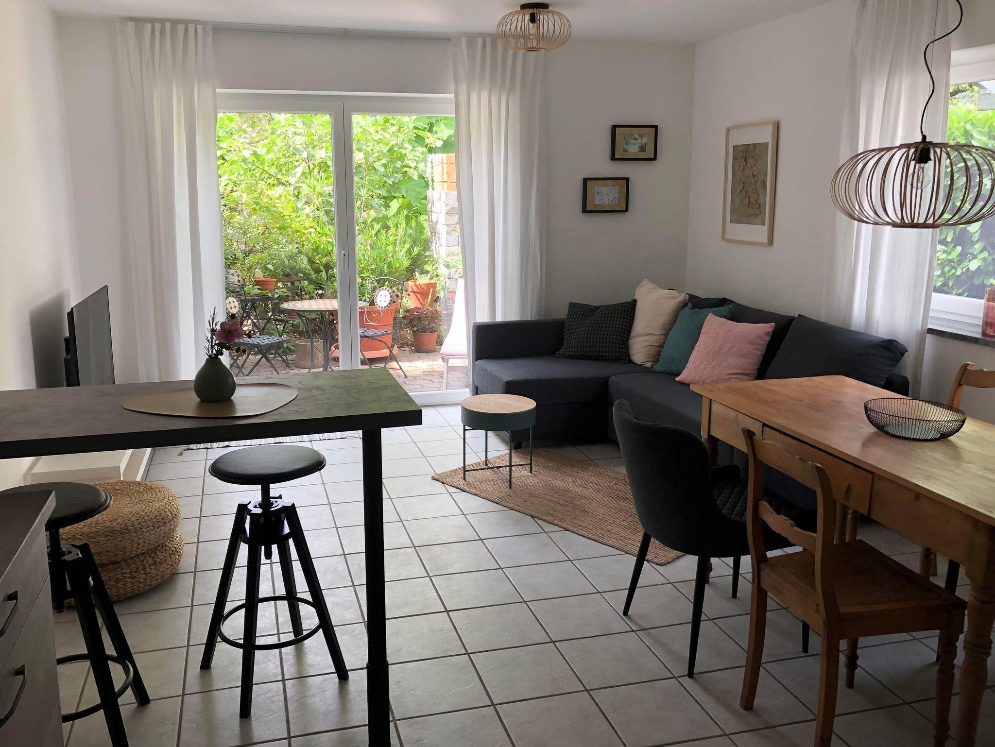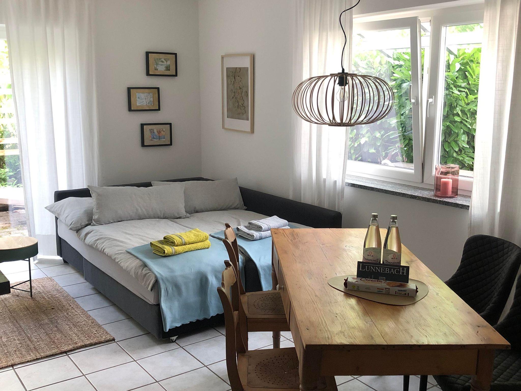 Ein Schlafzimmer mit Doppelbett, ein Bad mit Dusche und Badewanne, ein großes Wohnzimmer mit Schlafcouch und eine vollständig eingerichtete Küche, sowie eine Terrasse zum Garten und eine Terrasse vor der Eingangstür laden zum Entspannen und Wohlfühlen ein. Öffentliche, kostenfreie Parkplätze gibt es in unmittelbarer Nähe (15 m), auf Anfrage reservieren wir Ihnen einen Stellplatz am Haus.