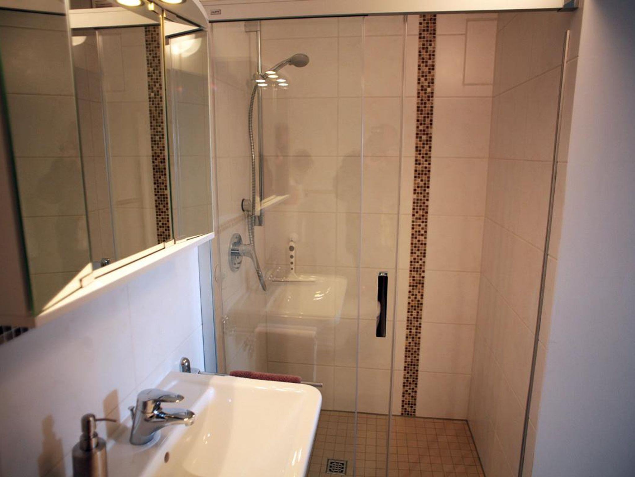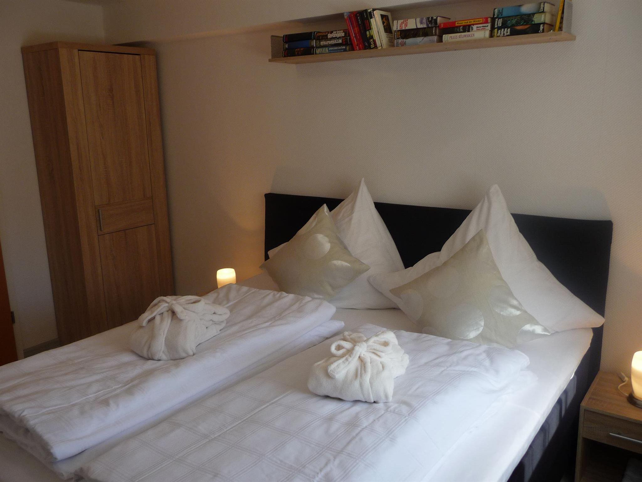 Im lichtdurchfluteten Wohnzimmer, befindet sich eine gemütliche Sitzecke, die eine Schlaffunktion für die dritte Person bietet. Der Wohnbereich ist mit einem SAT-TV-Gerät und Musikanlage ausgestattet. Eine Schreibgelegenheit (Sekretär) steht zur Verfügung. Die Küchenzeile ist mit einem Cerankochfeld, Backofen, Kühlschrank, Mikrowelle, Kaffeemaschine, Toaster und Wasserkocher ausgestattet. Die Essecke ist integriert in der Küche. Im hellen Schlafzimmer befindet sich neben einem Boxspringbett (180 x 200 cm) auch ein Kleiderschrank. Das Bad verfügt über eine barrierefreie Dusche, zur Einrichtung gehört einen beleuchteten Spiegelschrank, Handtuchheizkörper und WC. Im Dieleneingangsbereich befindet sich eine Garderobe, mit Schuhschranke und großen Spiegel.