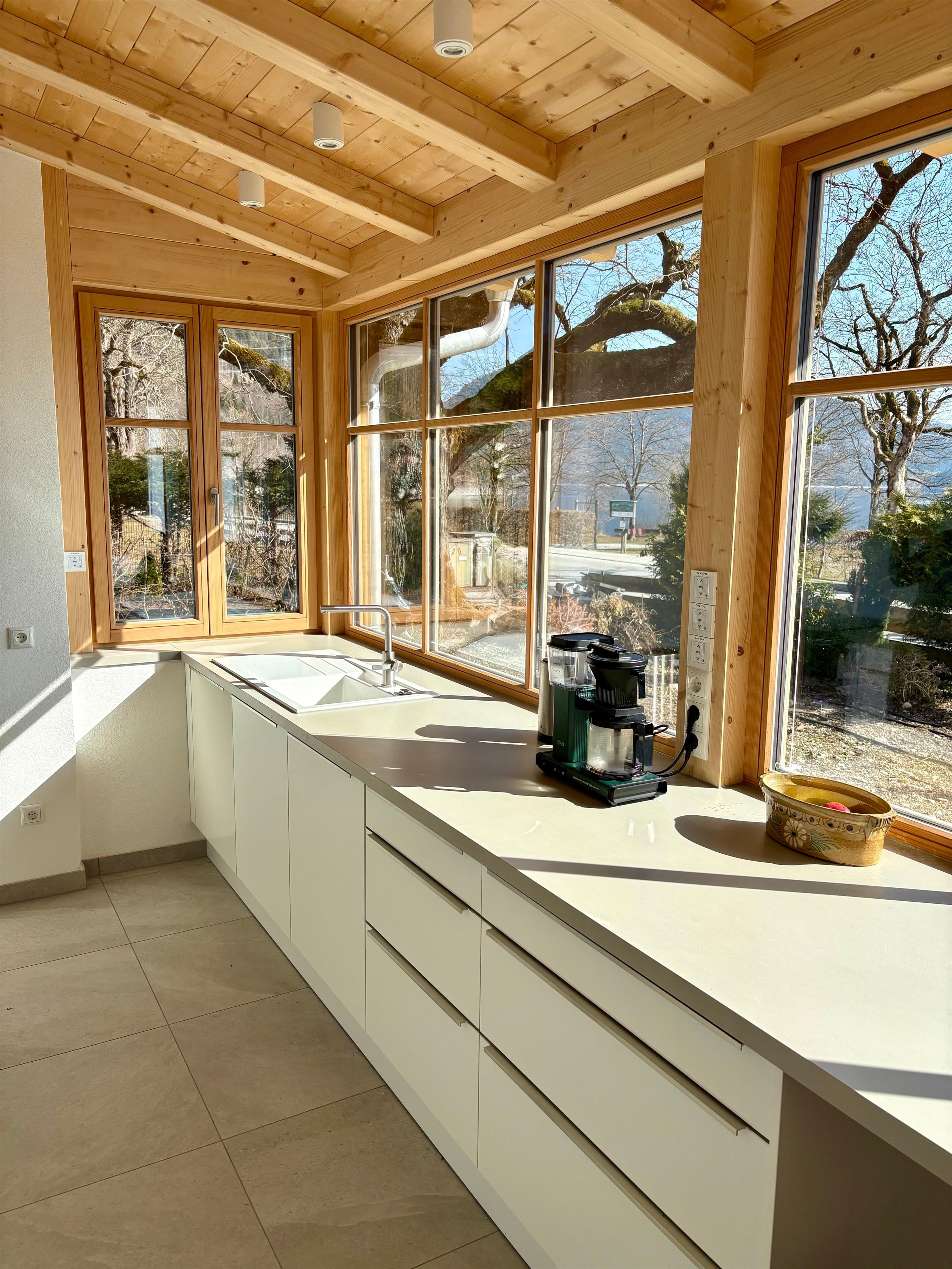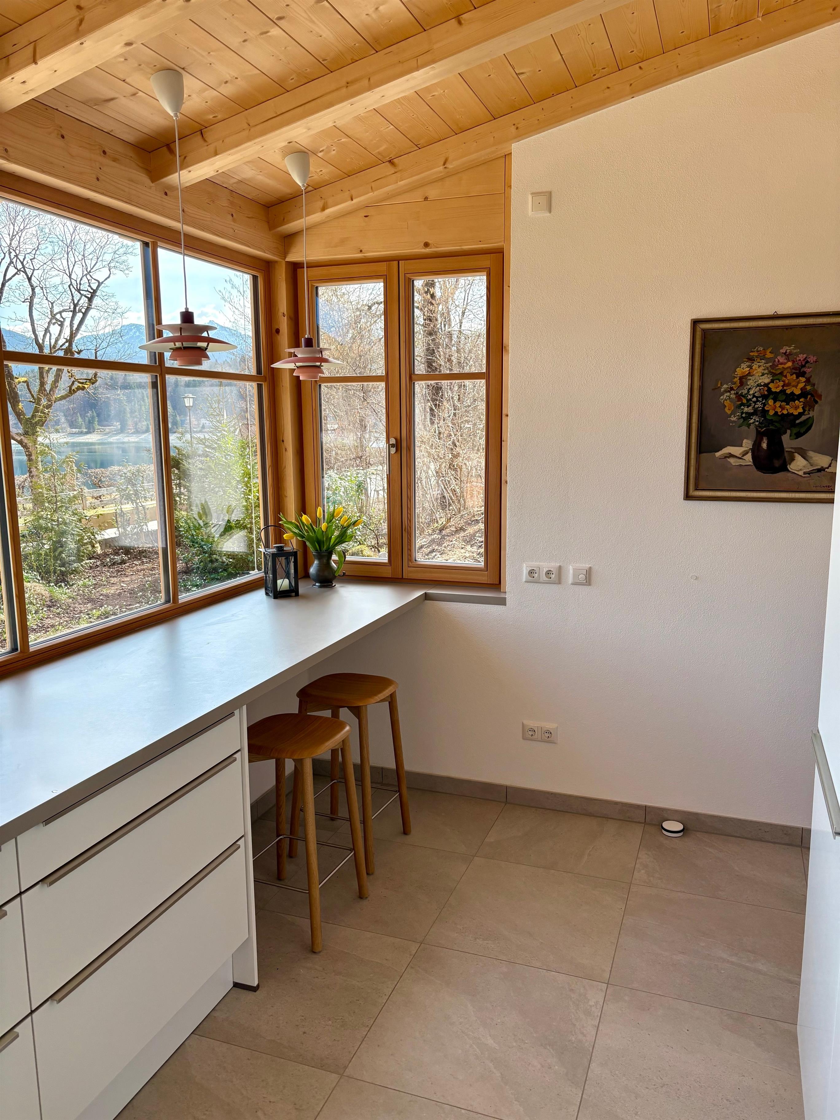 Die moderne Küche mit atemberaubendem Seeblick ist perfekt ausgestattet und lädt zum Kochen ein, gegessen wird jedoch im Wohn-/Essbereich, wo große Fenster den Blick in den Garten freigeben.