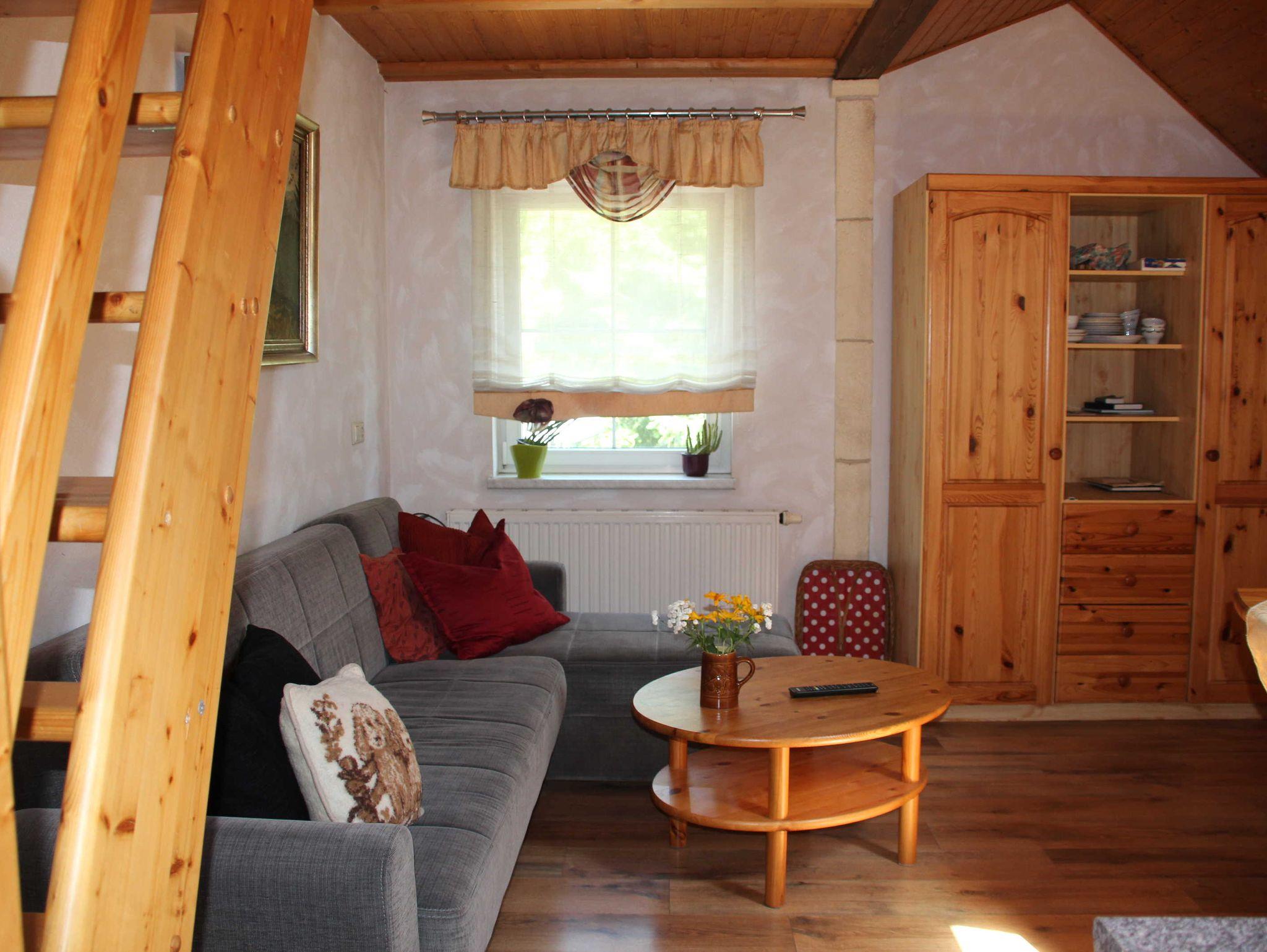 Die Ferienwohnung befindet sich in der 1. Etage und hat einen separaten Eingang.Der kombinierte Wohn- und Schlafraum mit den gemütlichen Sitzmöbeln bietet Möglichkeit zum Fernsehen (SAT-TV), zum Frühstücken oder wonach der Sinn steht.