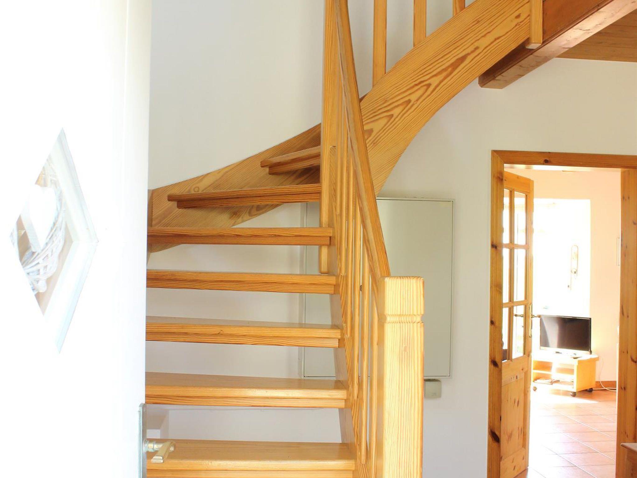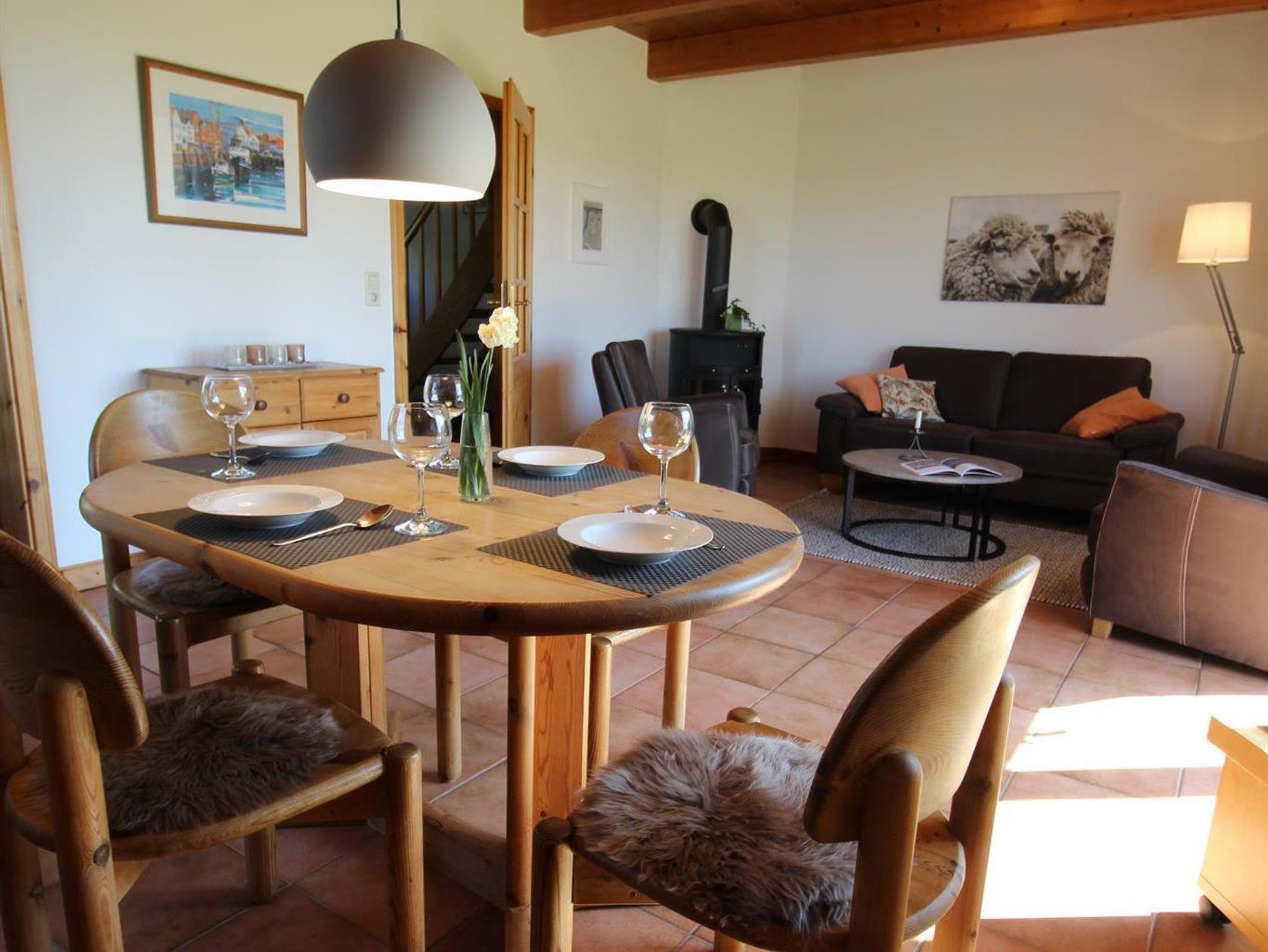 Die Ferienwohnung ist 72 qm groß. Der großzügige Wohn/Essbereich mit Kaminofen ist gemütlich eingerichtet und verfügt über eine Holzbalkendecke. Sie haben aus der Ferienwohnung einen schönen Blick nach Süden und Westen. Die separate Küche mit Geschirrspüler ist komplett ausgestattet. Es befindet sich neben dem Flur ein WC/Waschbecken. Im 1. Stock liegen ein Schlafzimmer mit nebeneinander stehenden Betten und 1 Schlafzimmer mit hintereinander stehenden Betten, jeweils unter einer Dachschräge. Ebenso liegt das Badezimmer mit Dusche/WC und einer Waschmaschine im Obergeschoss.
