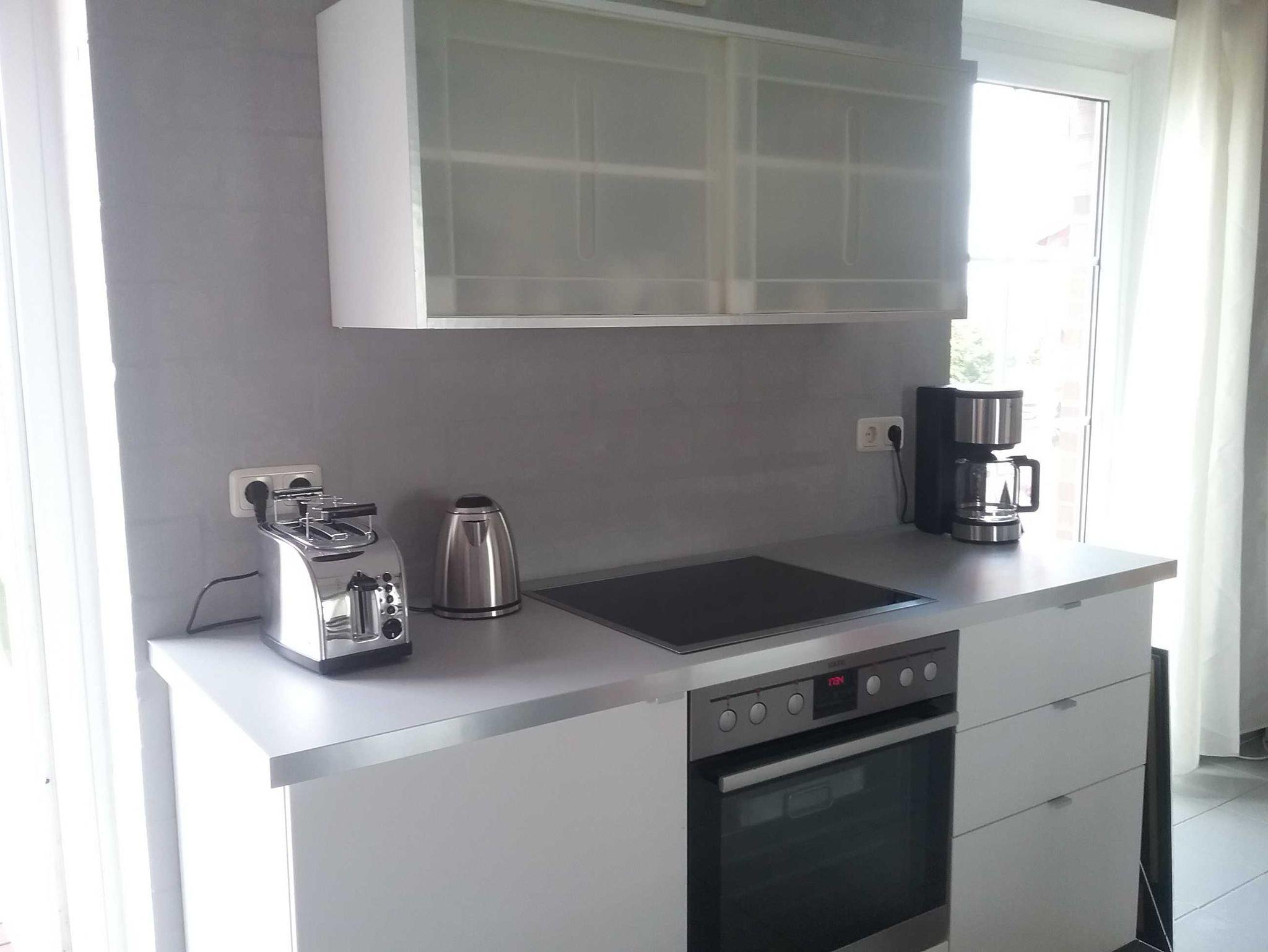 Wohnbereich mit perfekt eingerichteter Küche: Induktionsherd, Dampfgarer, Wasserkocher, Mikrowelle, Kaffeemaschine, Kühlschrank mit Gefrierfach, Toaster, Töpfe und Pfanne, Geschirr, diverse Gewürze.