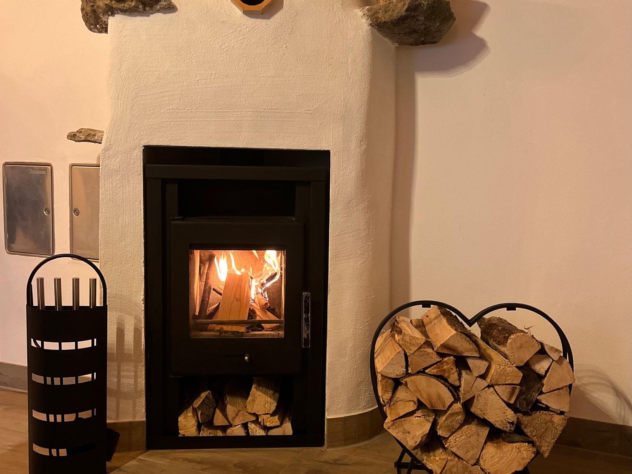 Im Wohnzimmer sorgt ein gemauerter Kaminofen mit Sichtfeuer für eine gemütliche Atmosphäre und lädt zum Verweilen ein.