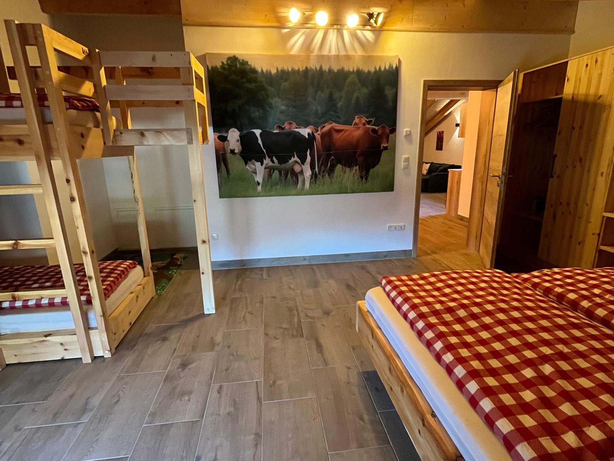 Die Bergherzalm umfasst ein Familienschlafzimmer mit Doppelbett und Stockbett. Zusätzlich kann die Couch im