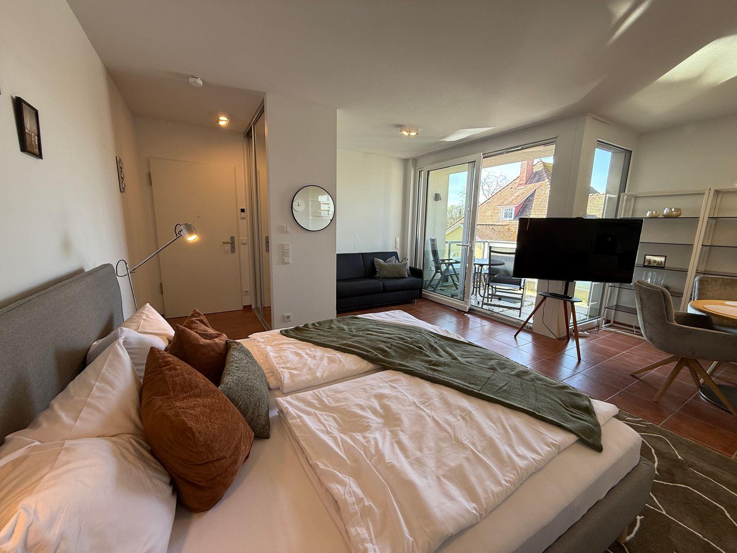 Die Wohnung verfügt über ein helles und einladendes Zimmer, das mit einem bequemen Sofa und einem Essbereich ausgestattet ist. Hier können Sie entspannte Abendessen oder gesellige Frühstücke in gemütlicher Atmosphäre genießen. Das offene Küchendesign ermöglicht eine harmonische Verbindung zwischen Wohnraum und Küche, sodass das Kochen für Sie zum Vergnügen wird. Ihre Küche ist vollkommen ausgestattet: Sie finden einen 4-Platten-Herd, eine Spülmaschine, einen Backofen und alle notwendigen Küchenutensilien sowie eine Kaffeemaschine und einen Wasserkocher. Ein Kühlschrank mit Gefrierfach sorgt dafür, dass Sie immer frische Lebensmittel zur Verfügung haben.