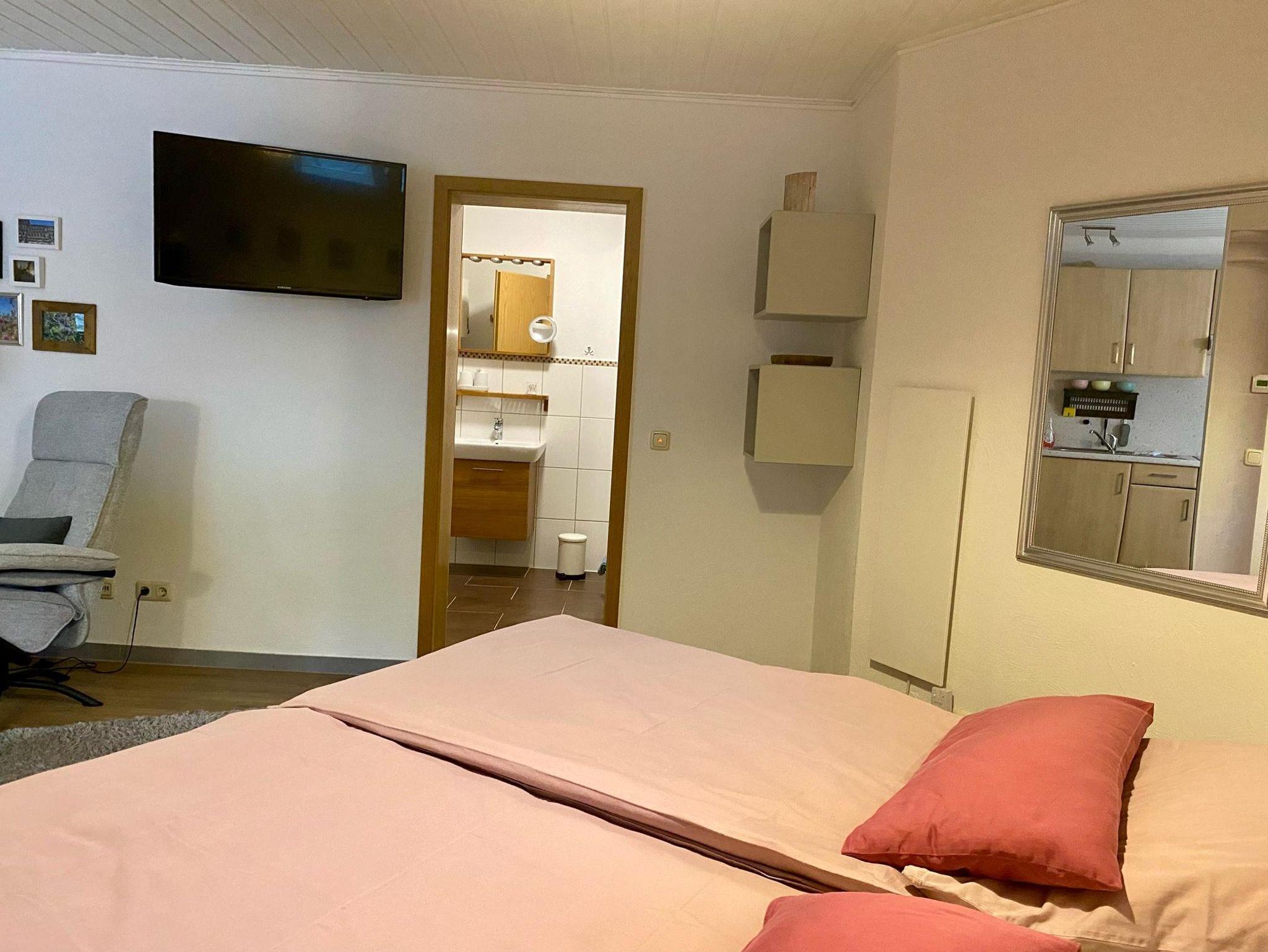 Das Ferienappartement verfügt über einen kombinierten Wohn- Schlafraum. Küche mit Kaffeemaschine, Backofen, Toaster, Wasserkocher. Wohnbereich mit SAT-TV, Doppelbett 180 x 200 cm. Terrasse zum Garten, WLAN inklusive.