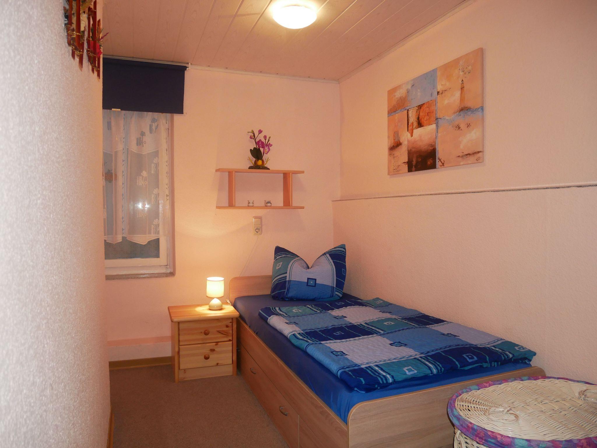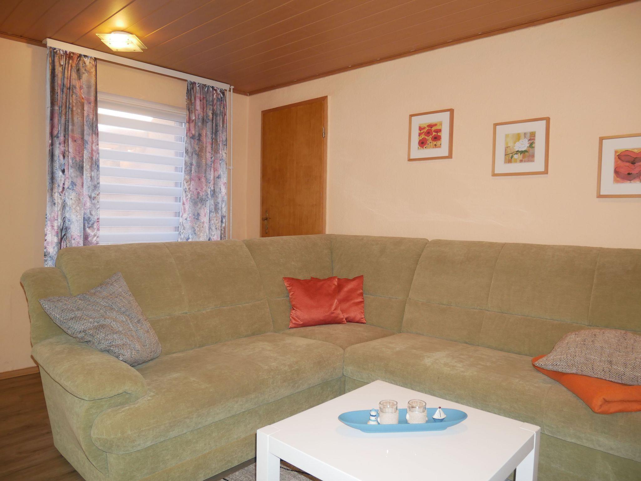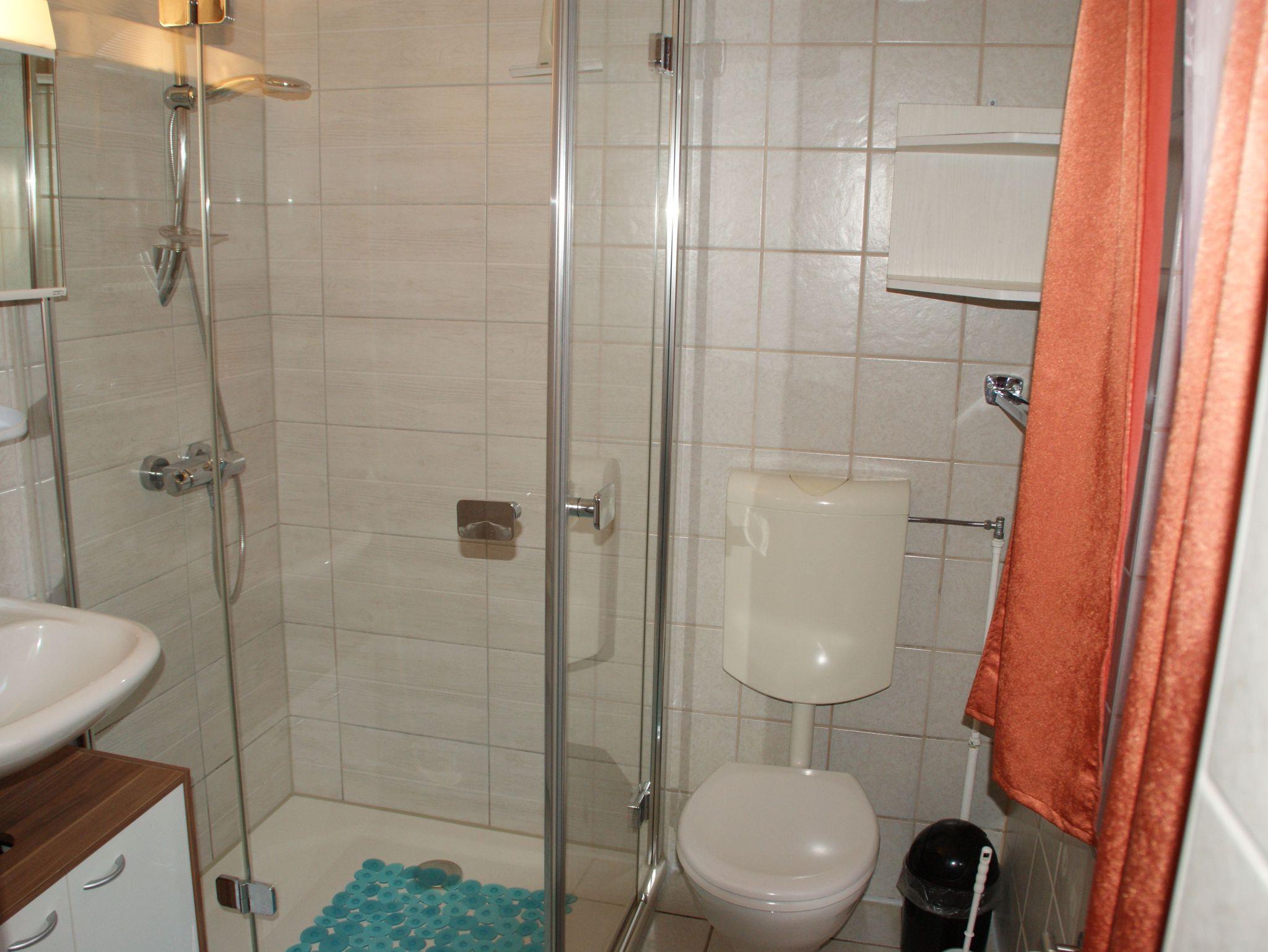 Die Ferienwohnung 1 ist ca. 40m² groß und verfügt über ein Wohnzimmer mit einem Sofa, Flat-TV und Radio. Die offene Küche ist ausgestattet mit einem Mini-Backofen, 2-Platten-Herd, Kühlschrank mit Gefrierfach, Kaffeemaschine, Toaster und Wasserkocher. Das große Schlafzimmer verfügt über ein Doppelbett und über einen Kleiderschrank. Im kleineren Schlafzimmer befindet sich ein Einzelbett. Das Badezimmer ist mit einer ebenerdigen Dusche ausgestattet. Vor der Wohnung befindet sich eine möblierte Terrasse. Zusätzlich finden Sie auf dem Grundstück eine überdachte Laube, die zum Grillen oder gemütlichen Beisammensein geeignet ist.