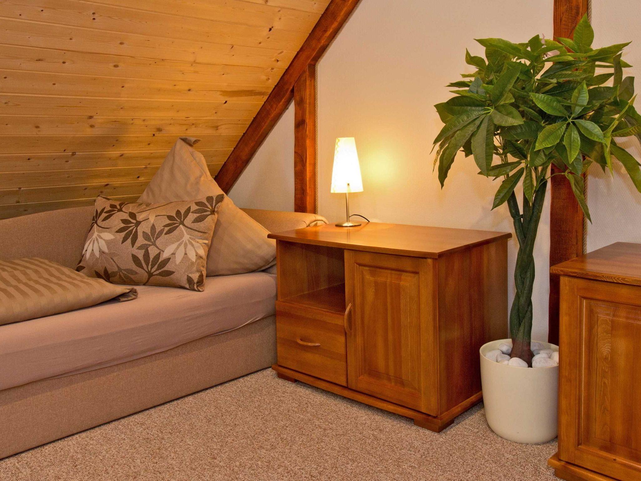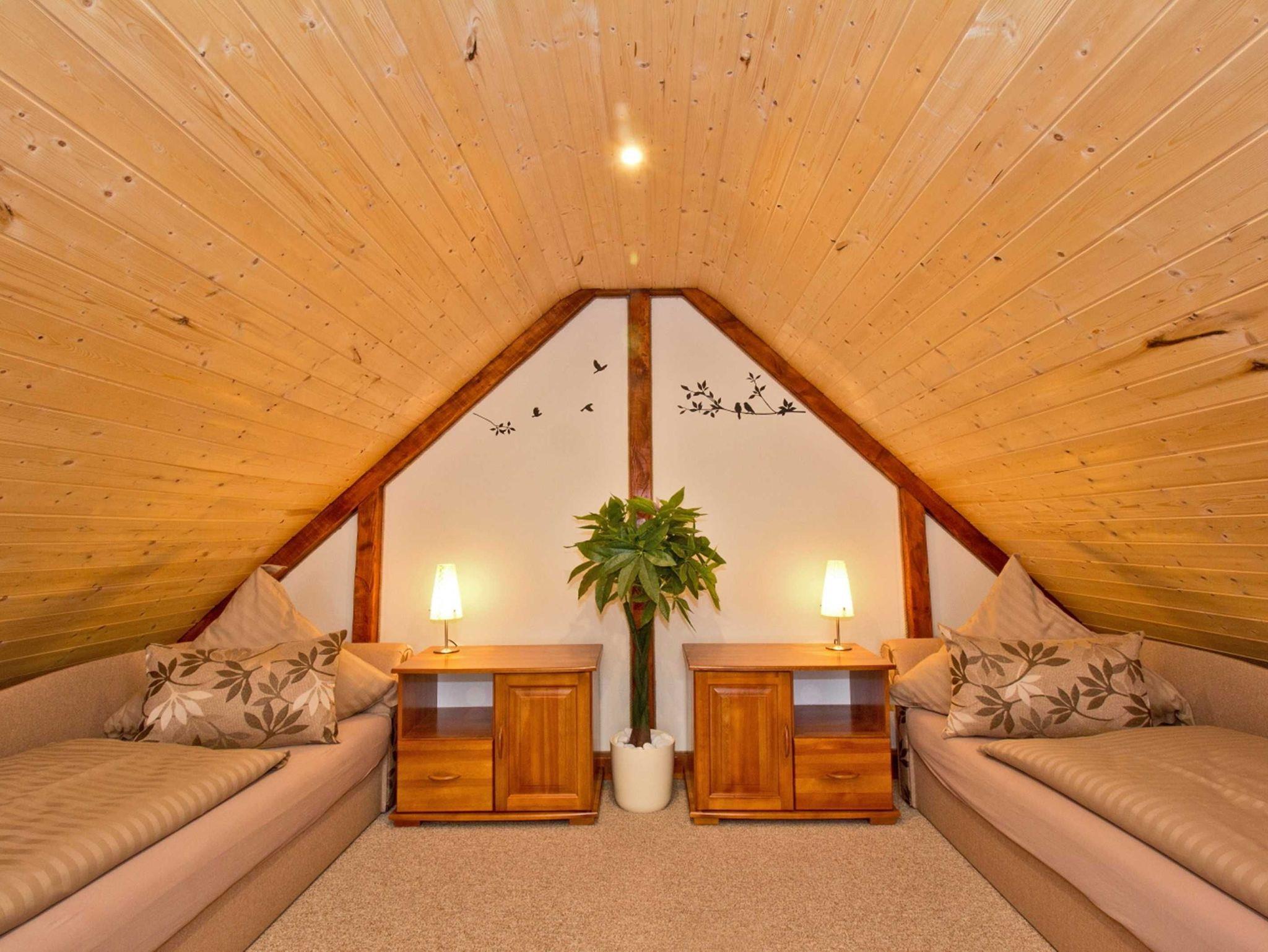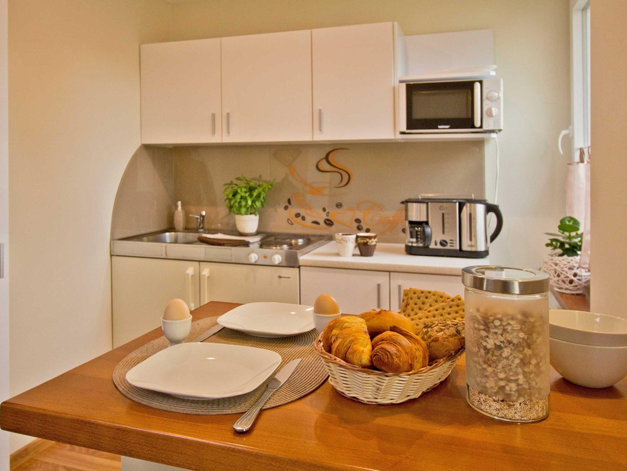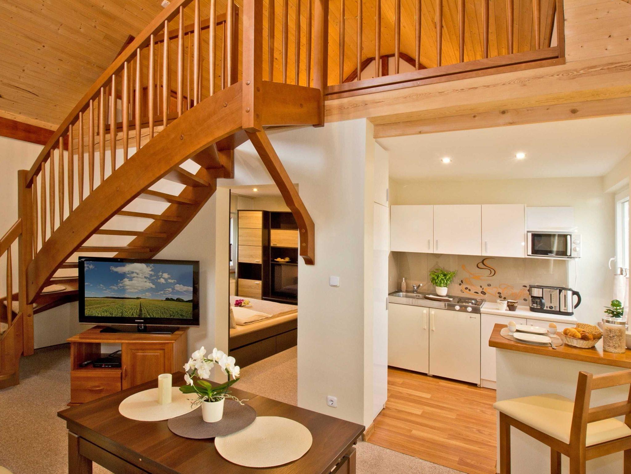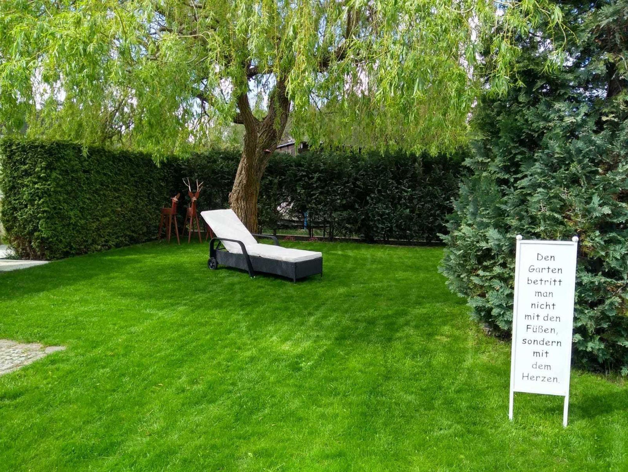 Das Ferienhaus, welches teilweise zur Strassenseite des Grundstücks gelegen ist, verfügt über 3 stilvoll und modern eingerichtete Zimmer (1 Wohn- und 2 Schlafzimmer), sowie ein Bad mit Dusche/WC (durch das Schlafzimmer zu erreichen) und eine offene Küche. Das Wohnzimmer mit Eckcouch und HDTV-Fernseher inkl. Radiofunktion lädt zum gemütlichen Verweilen ein. Das Schlafzimmer im Erdgeschoss verfügt über ein breites Doppelbett (Breite 160 cm) und eine Wohnwand inkl. Kleiderschrank. Die Loggia im Wohnzimmer ist ausgestattet mit zwei Einzelbetten und drei Kommoden. Klein, geräumig und gut ausgestattet- die offene Küche verfügt über eine Kochstelle mit 2 Herdplatten, Spüle, Kühlschrank, Toaster, Kaffeeautomat, Wasserkocher, Mikrowelle, sowie Geschirr und Kochuntensilien. Der Eingang befindet sich auf der ruhigen Hofseite. Direkt vor dem Ferienhaus befindet sich eine eigene gemütliche Sitzecke im ruhig gelegenen Garten der Ferienanlage inklusive Grill welcher zum Ferienhaus gehört.