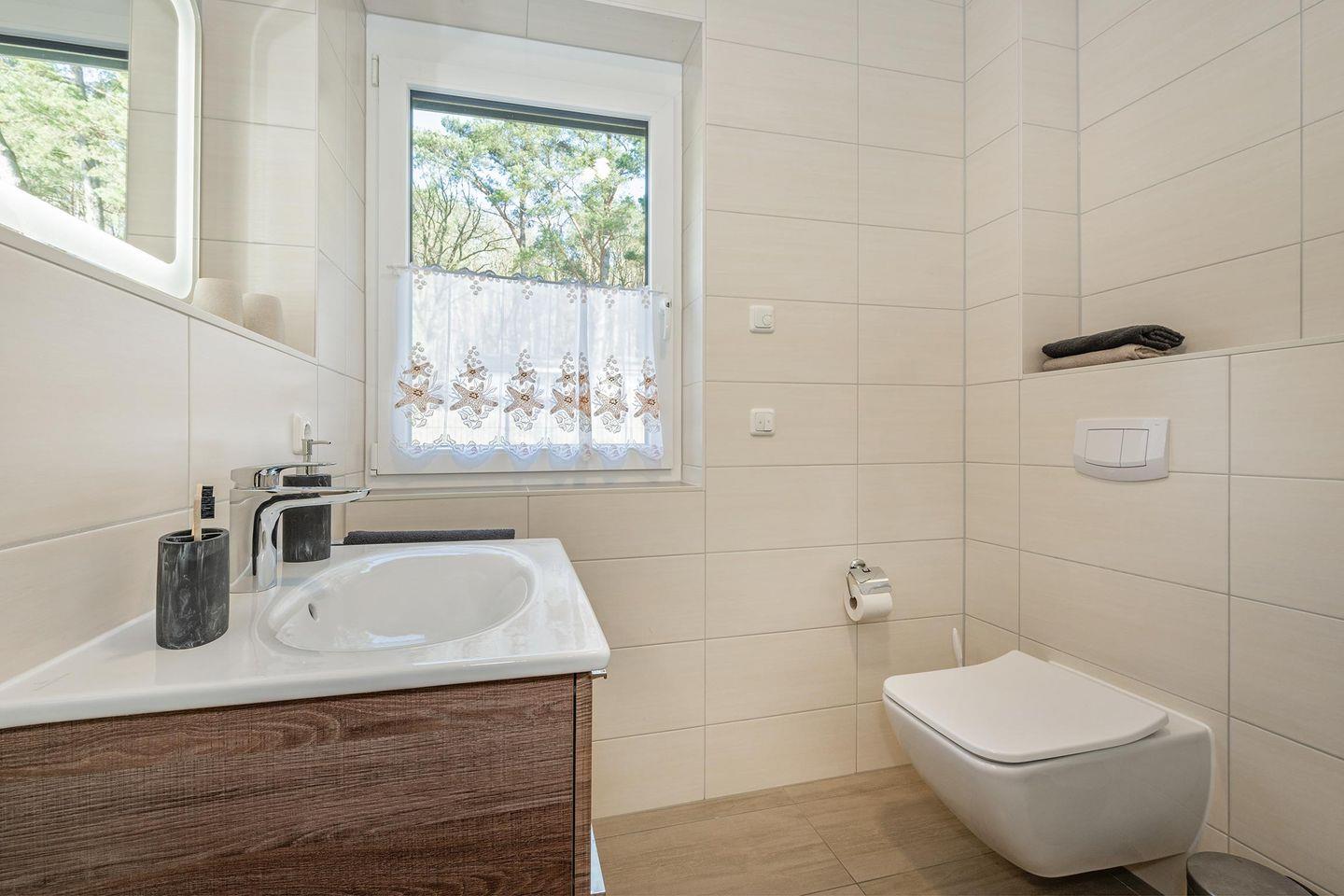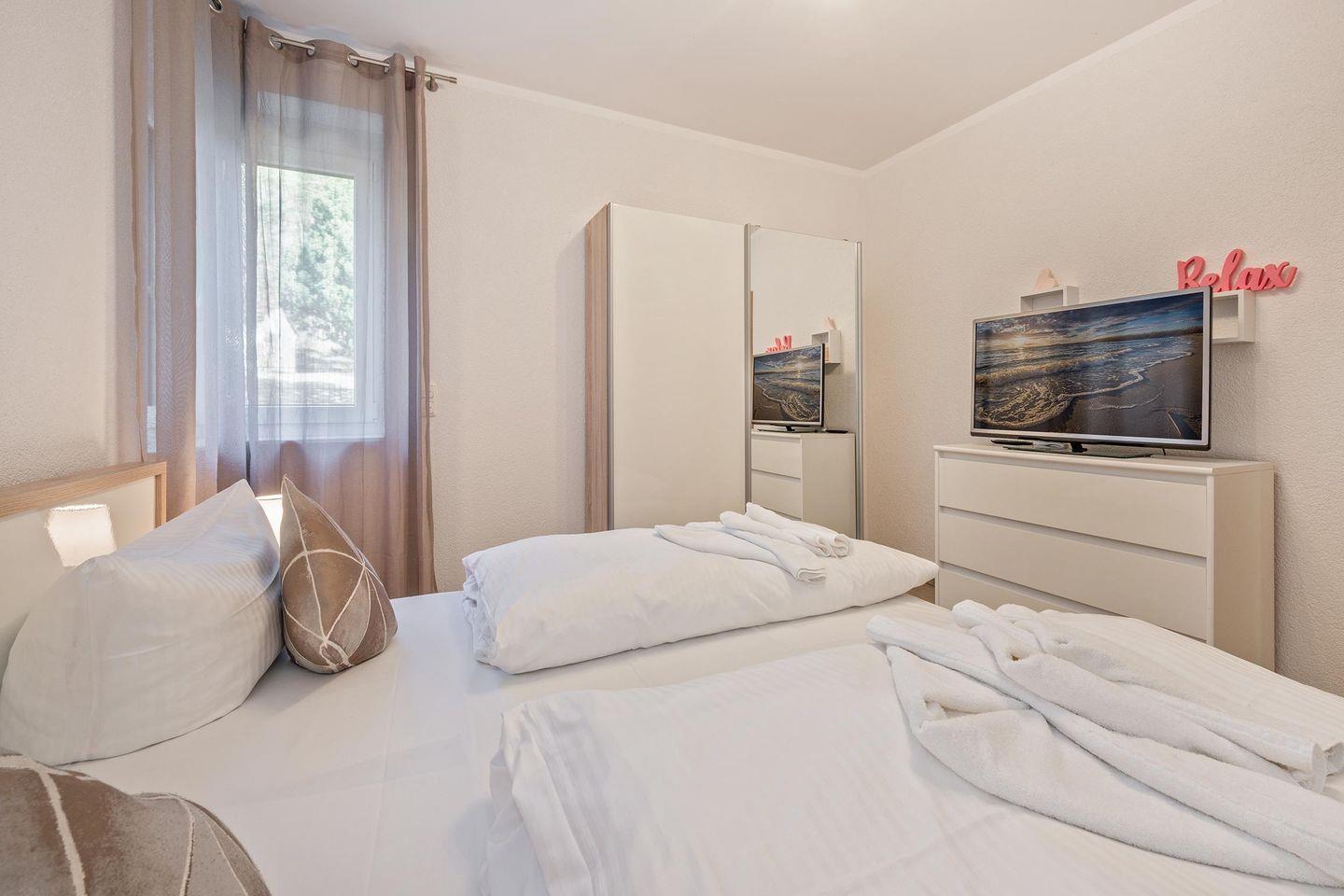 Die möblierte Terrasse ist der ideale Ort, um gesellige Stunden mit Familie und Freunden zu verbringen und die frische Waldluft zu genießen. Die Wohnung verfügt über zwei komfortable Schlafzimmer. Das Hauptschlafzimmer ist mit einem großen Doppelbett, einem Kleiderschrank, verstellbaren Lattenrosten und Verdunkelungsmöglichkeiten ausgestattet. Ein zusätzlicher TV sorgt für Komfort. Das zweite Schlafzimmer ist ebenfalls mit einem Doppelbett und Verdunkelungsmöglichkeiten ausgestattet. Ein helles Badezimmer mit bodentiefer Dusche rundet das Angebot ab. Haustiere sind in dieser Ferienwohnung herzlich willkommen.