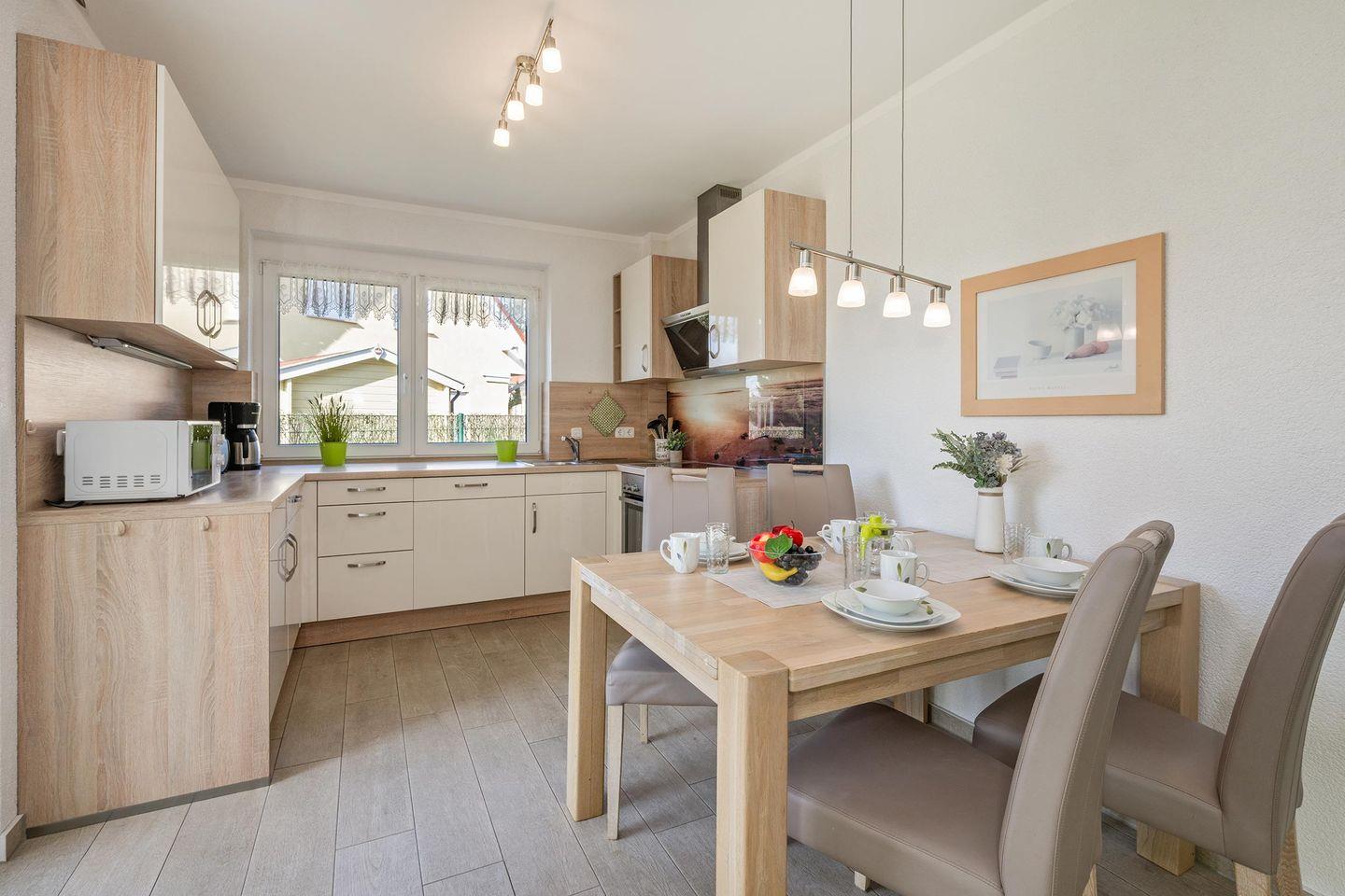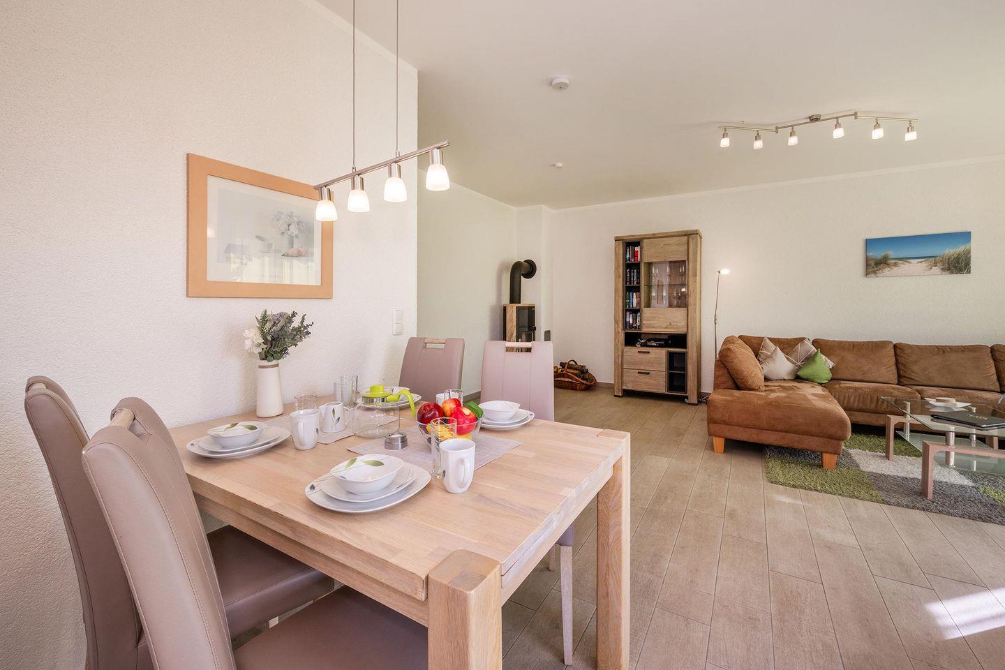 Entfliehen Sie dem Alltag und genießen Sie unvergessliche Urlaubstage in der liebevoll eingerichteten Ferienwohnung "Sonnenpark 02". Gelegen in idyllischer Waldrandlage in Korswandt, bietet diese familienfreundliche Unterkunft den perfekten Rückzugsort für Naturliebhaber und Erholungssuchende. Die 80 Quadratmeter große Ferienwohnung im Erdgeschoss empfängt Sie mit einem hellen und großzügigen Wohnbereich, der durch eine offene Küche ergänzt wird. Hier finden Sie alle Annehmlichkeiten für einen komfortablen Aufenthalt: Backofen, Spülmaschine, Cerankochfeld, Mikrowelle und einen Kühlschrank mit Gefriereinheit. Ein separater Esstisch lädt zu gemeinsamen Mahlzeiten ein. Der stilvoll eingerichtete Wohnbereich mit einem Kaminofen als Highlight verspricht Gemütlichkeit und Entspannung, besonders in den kühleren Monaten. Ein TV-Gerät steht für Ihre Unterhaltung bereit.