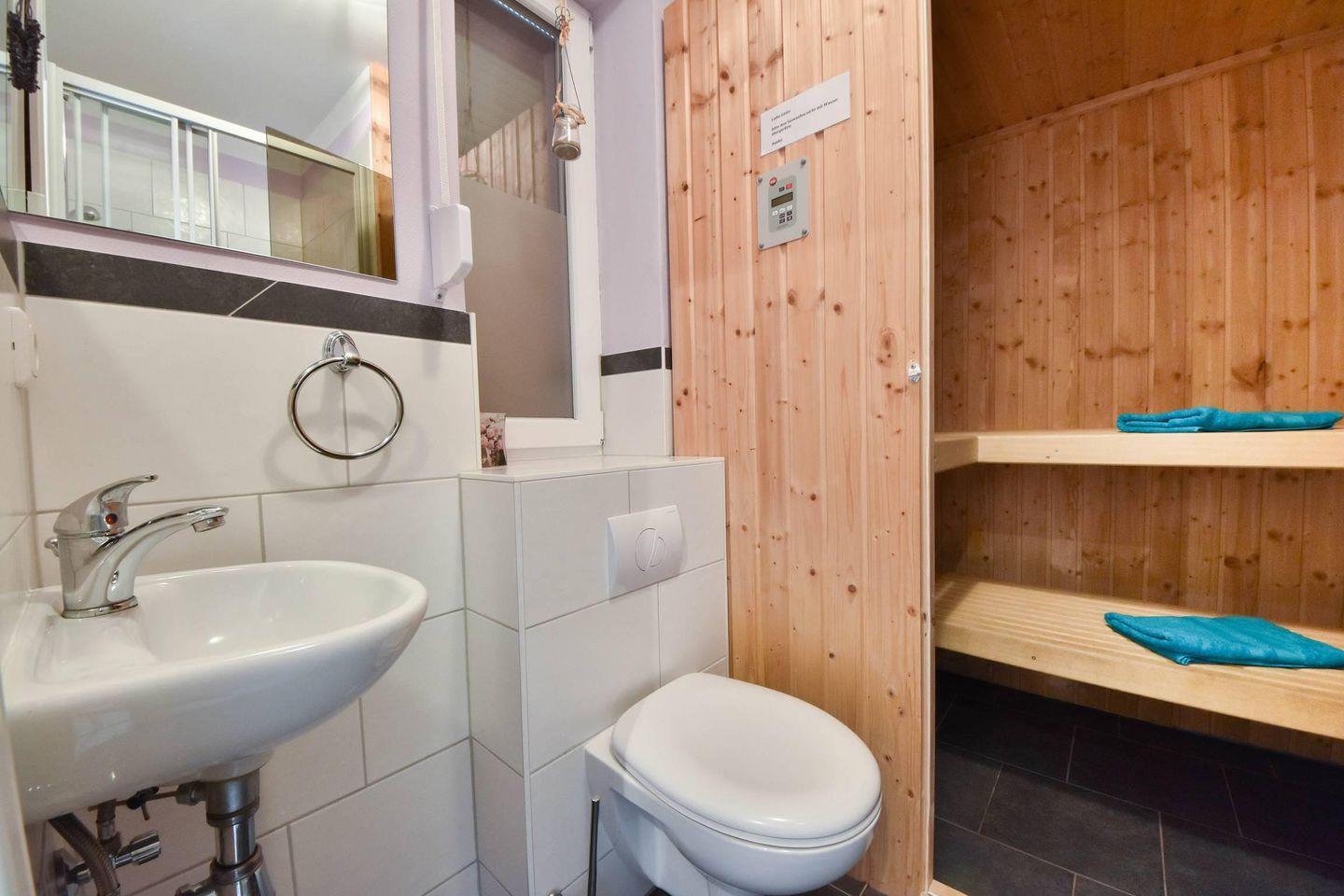 Im Erdgeschoss erwartet Sie der großzügige Wohn- und Essbereich mit integrierter Küchenzeile. Ein Flachbild-TV sowie eine gemütliche Sitzecke sind vorhanden. Die große Sonnenterrasse ist dank der bodentiefen Fenster vom Wohnraum begehbar. Das Highlight des Hauses ist die eigene Sauna im Gäste-WC - ebenfalls im Erdgeschoss - die sowohl über einen Kaminofen verfügt, als auch als Infrarot-Sauna genutzt werden kann.