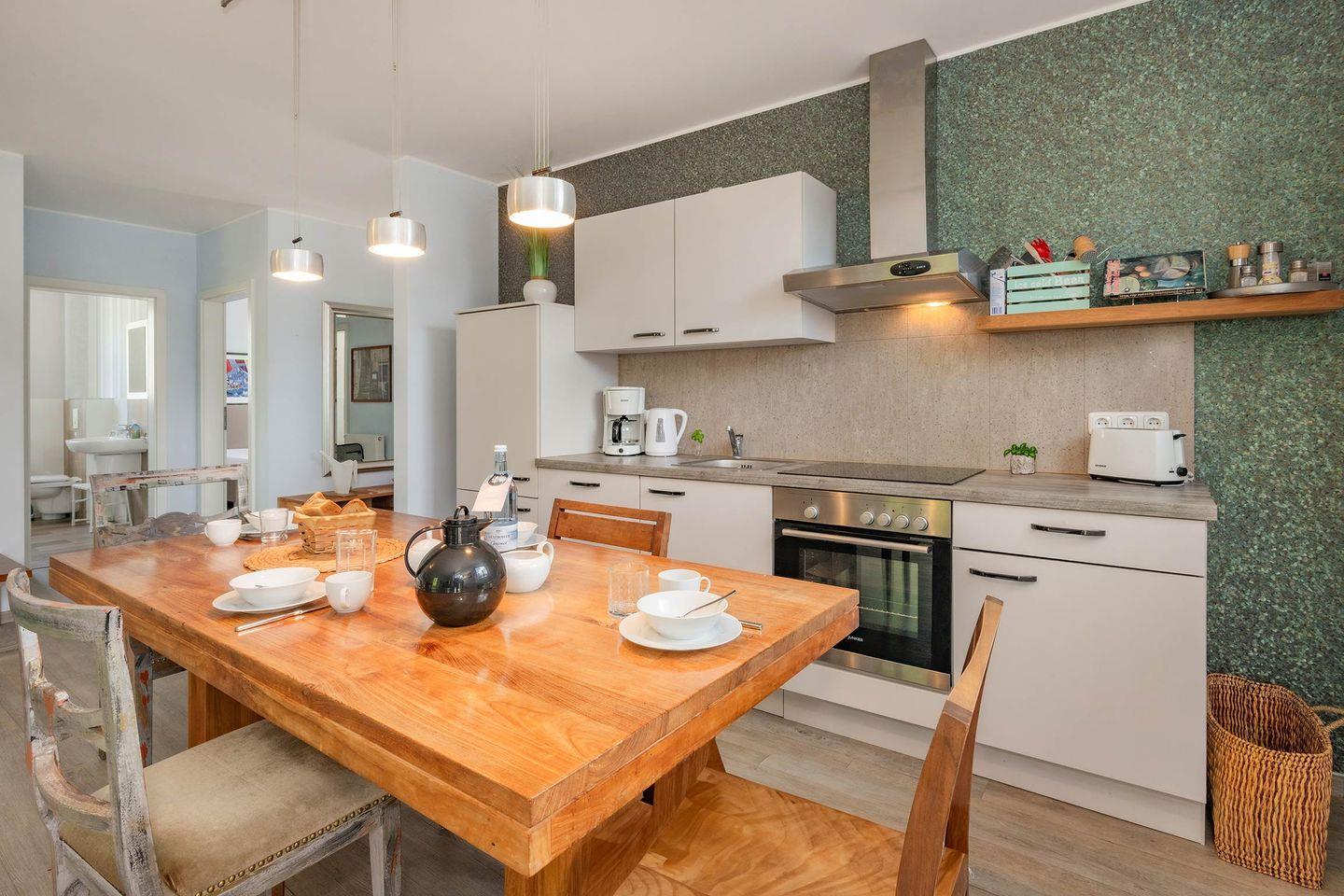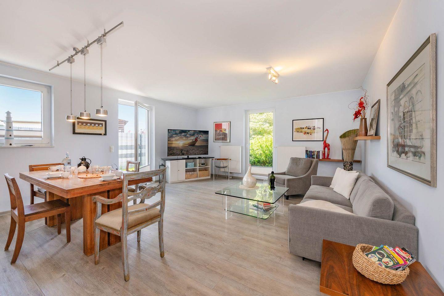 Das Herzstück des Hauses bildet die moderne, offen gestaltete Wohnküche, die keine Wünsche offenlässt. Ausgestattet mit hochwertigen Geräten wie Backofen, Spülmaschine, Ceranfeld und Mikrowelle, lädt sie zu kulinarischen Genüssen ein. Der Übergang zum gemütlichen Wohnbereich ist fließend, hier finden Sie einen Esstisch für gemeinsame Mahlzeiten und einen Flat-TV, der sogar Netflix mit Ihrem eigenen Account ermöglicht – perfekt für entspannte Abende. Vom Wohnbereich gelangen Sie direkt auf die sonnige Südwest-Terrasse, die mit bequemer Bestuhlung zum Verweilen im Freien einlädt. Hier können Sie Ihr Frühstück unter freiem Himmel genießen oder den Tag bei einem Glas Wein ausklingen lassen, während die Abendsonne die Umgebung in goldenes Licht taucht.