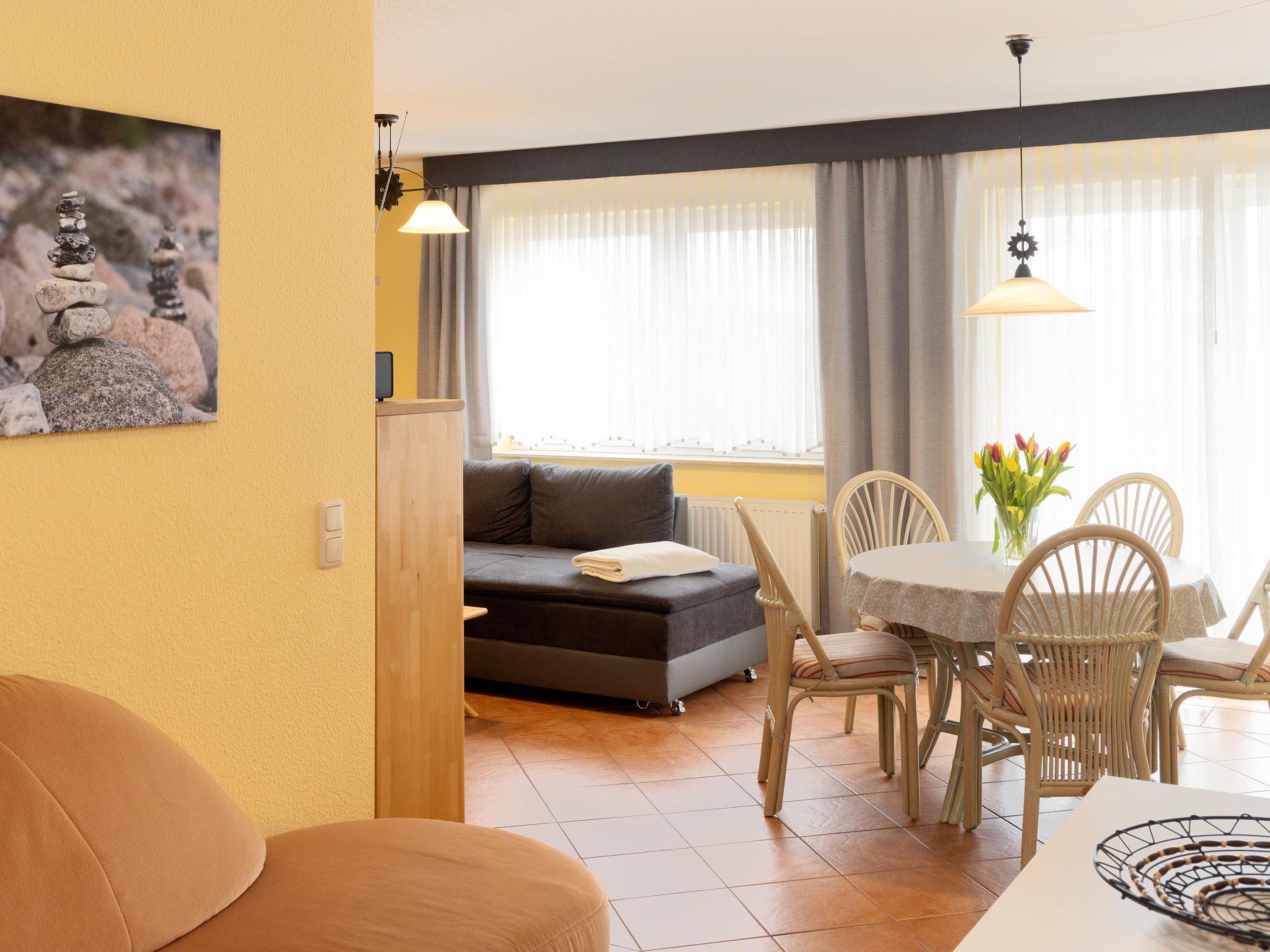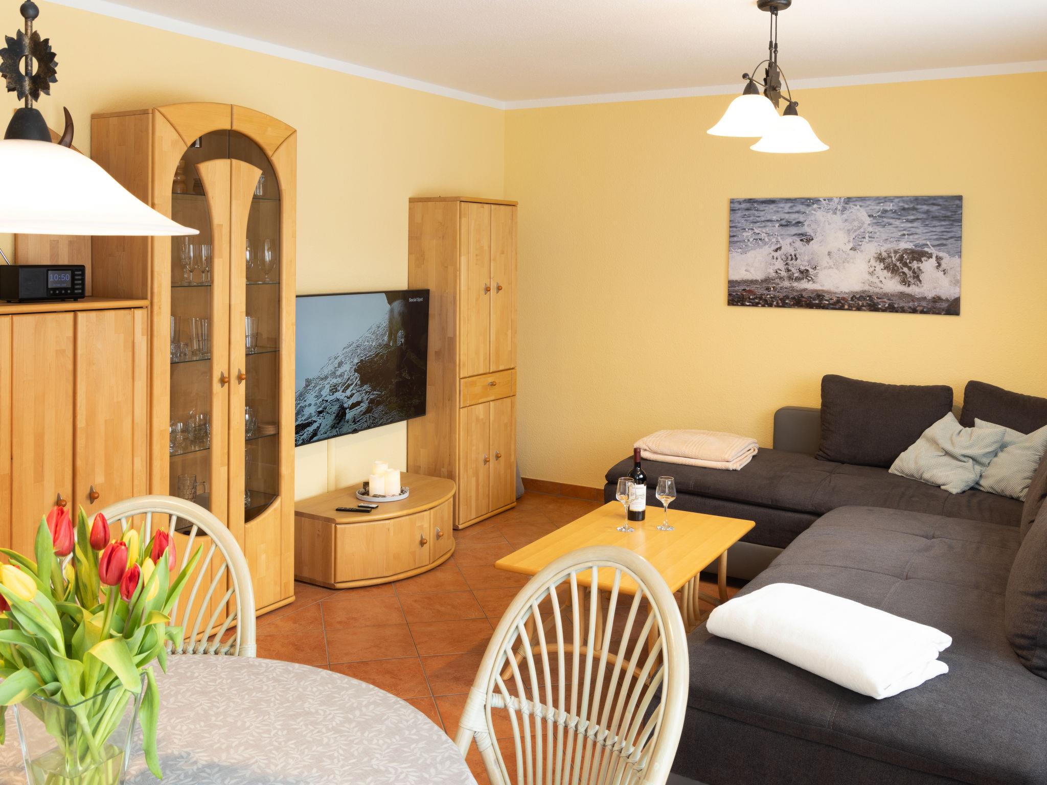 "Ritter", 2-room apartment 75 m2, on the ground floor. Cosy furnishings: living/dining room with 1 double sofabed and cable TV (flat screen), radio. Exit to the terrace. 1 room with 1 double bed (200 cm, length 200 cm). Kitchen (oven, dishwasher, 4 induction hot plates, toaster, kettle, microwave, electric coffee machine). Bath/shower/WC, double hand-basin, Sauna. Terrace. Terrace furniture. Facilities: children's high chair, baby cot. Internet (WiFi, free). Please note: non-smokers only. Smoke alarm.