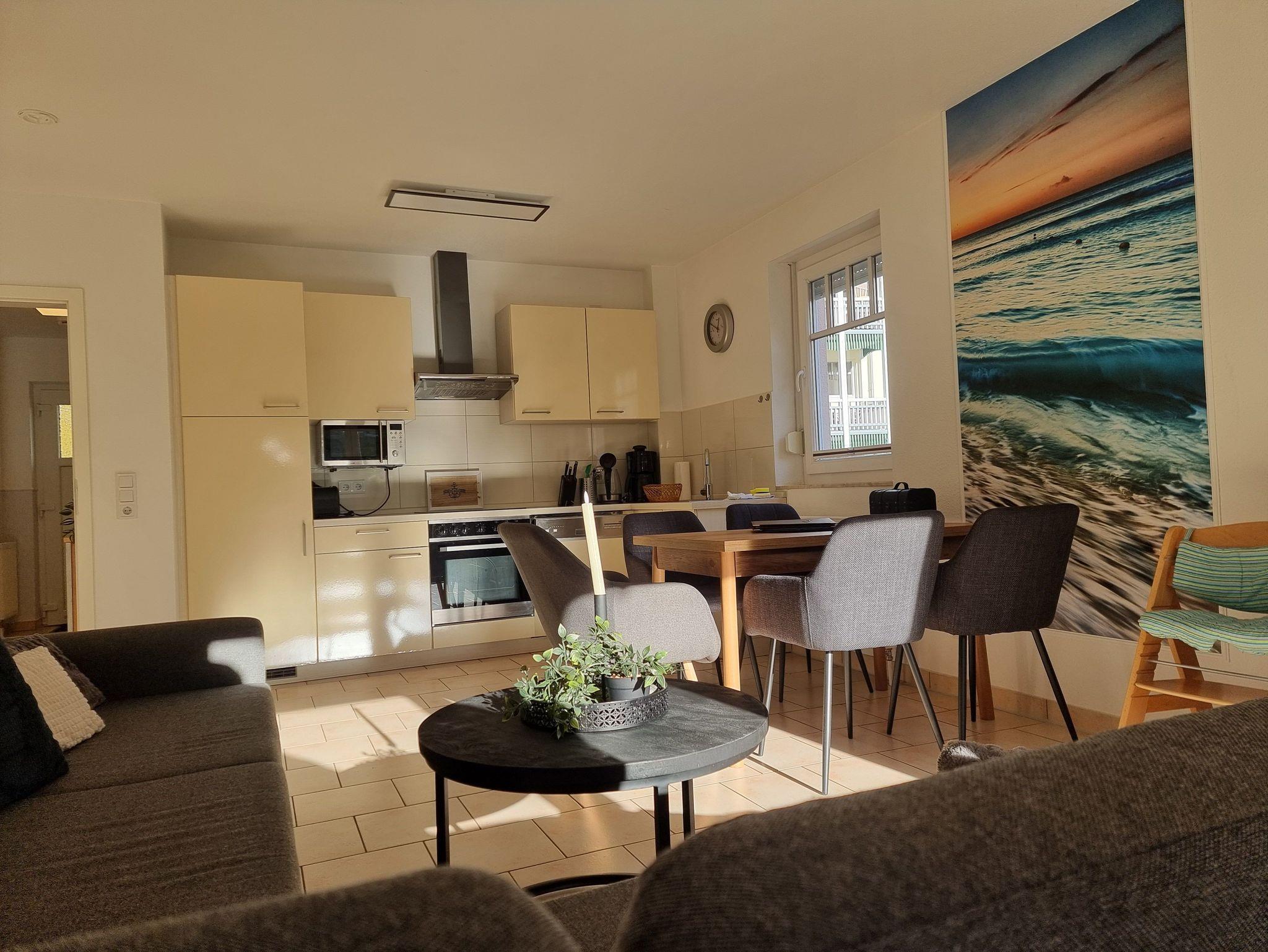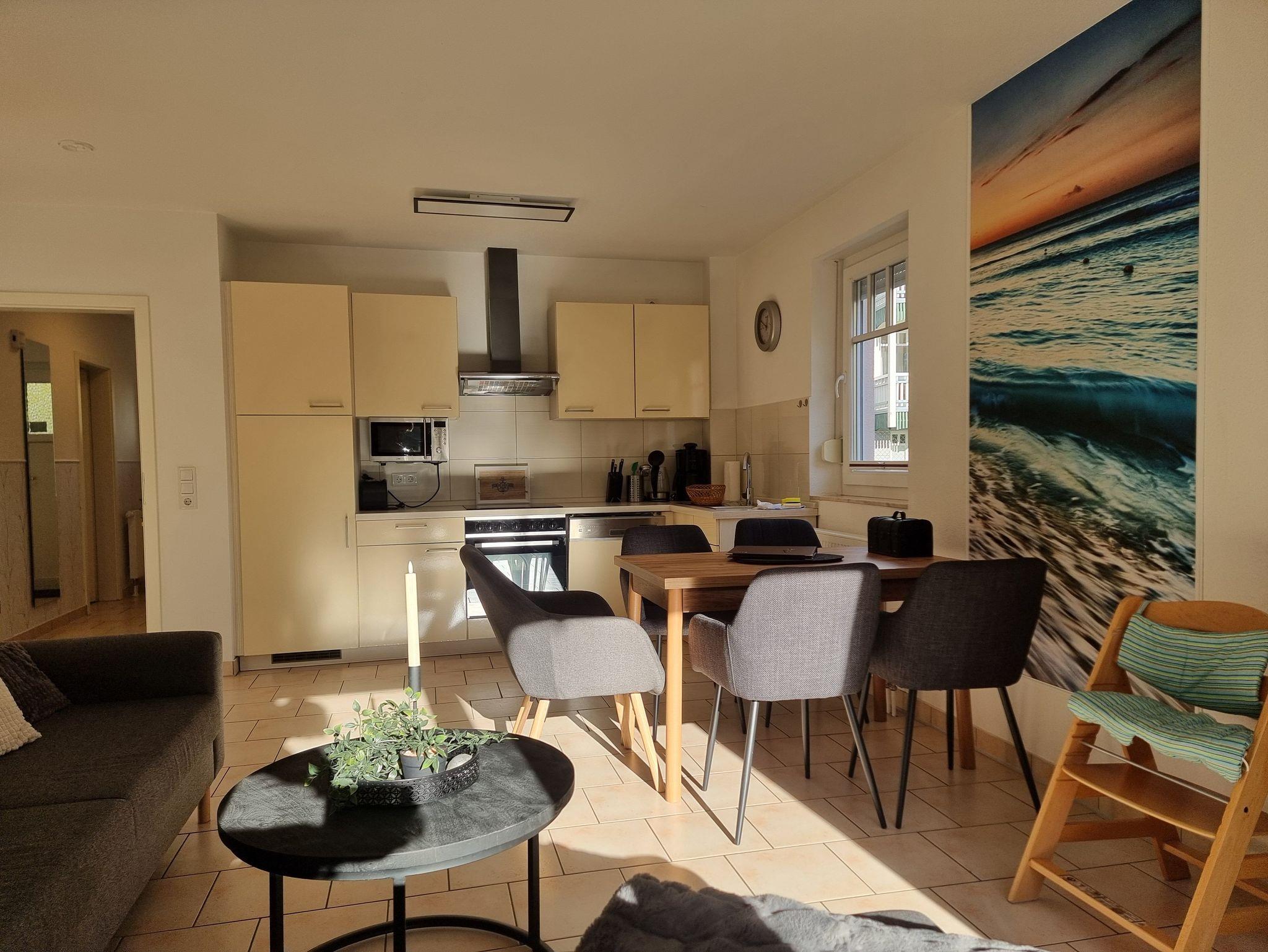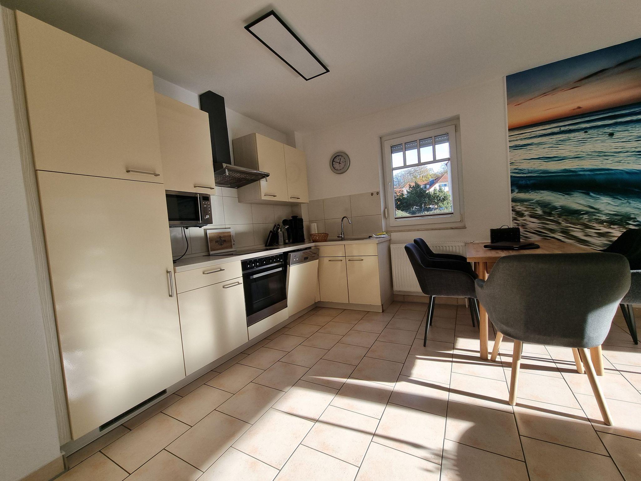 Die Ferienwohnung liegt im Erdgeschoß des Ferienhauses. Sie besteht aus Wohnzimmer, kompl. ausgestatteter Küche, Schlafzimmer und Tageslichtbad. Die Ausstattung der Einbauküche ist neuwertig funktional und qualitativ hochwertig unter anderem mit Toaster, Kaffeemaschine, Backofen mit Heißluft, Kochfeld, Geschirrspüler, Gefrierfach. Große Süd-Terrasse mit Blick auf den Küstenwald, große Spielwiese.