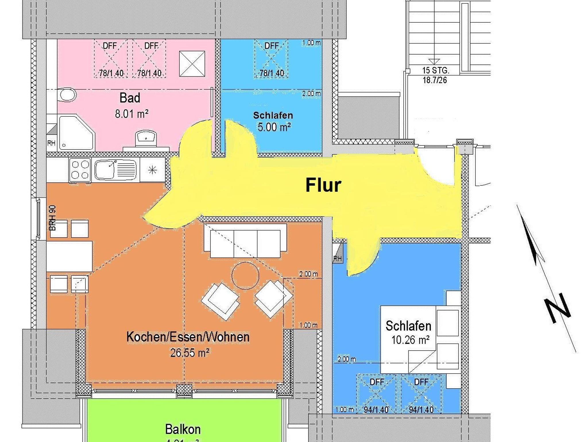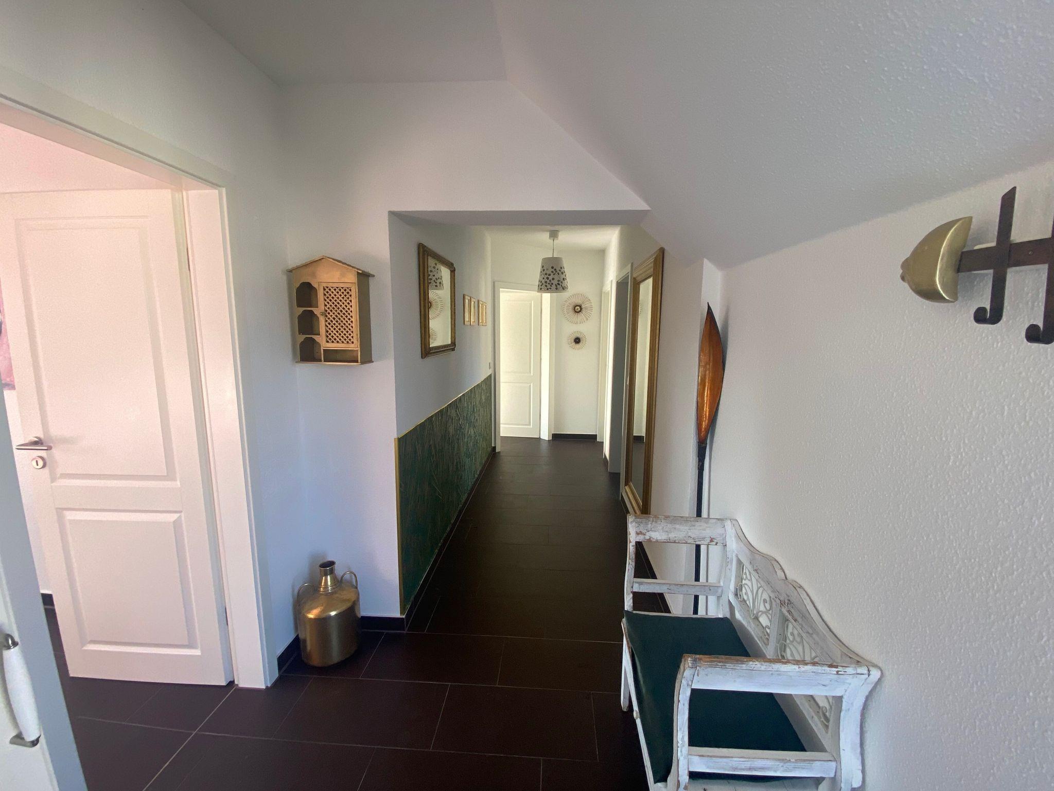 Die Wohnung liegt im Dachgeschoß des Ferienhauses. Sie verfügt über ein Schlafzimmer mit Doppelbett sowie ein weiteres Zimmer mit Einzelbett. Im Wohnzimmer steht alternativ eine Schlafcouch zur Verfügung.