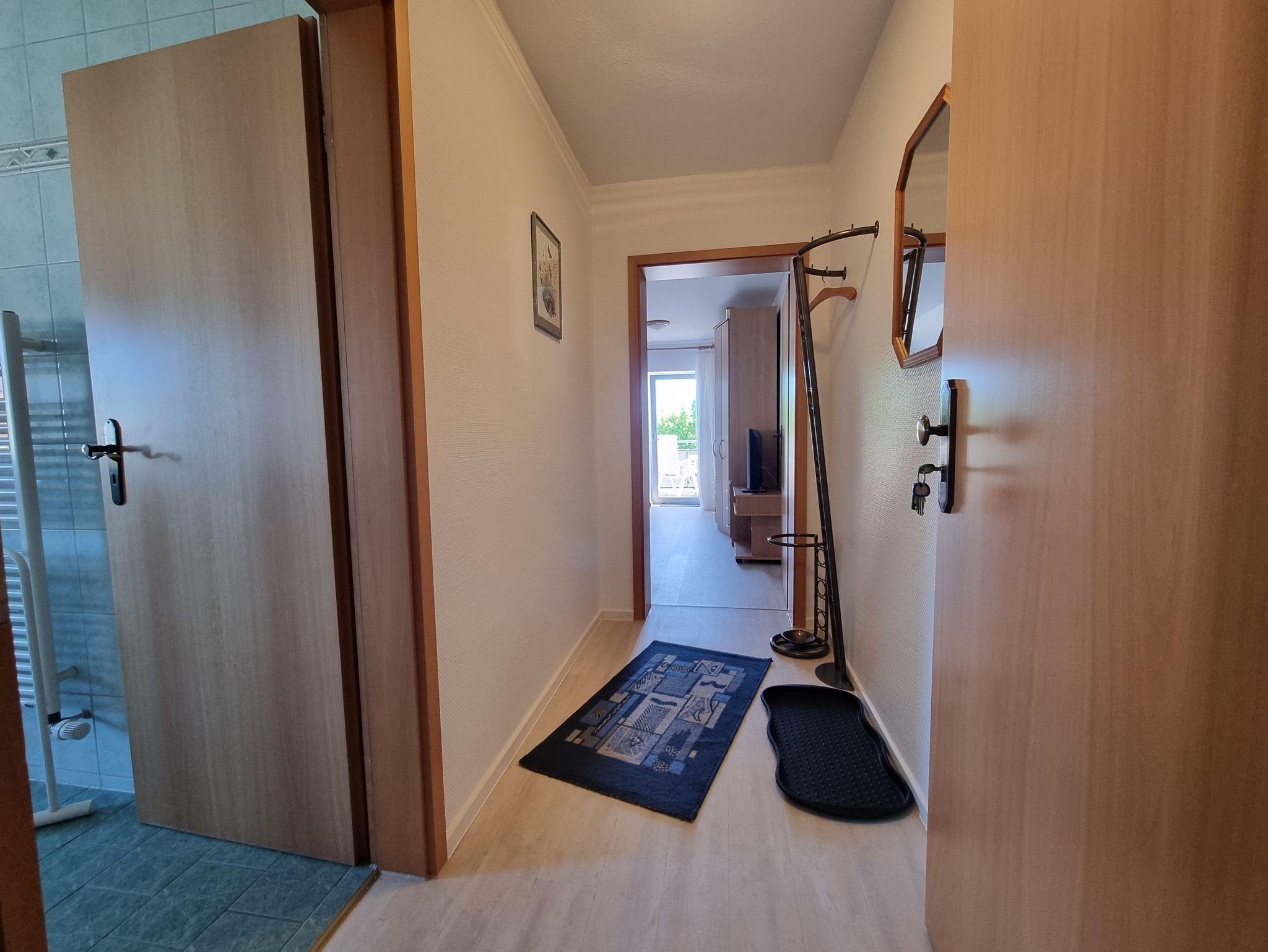 Die komplett ausgestattete Küchenzeile fügt sich harmonisch in den Wohnbereich ein und bietet alles für die tägliche Selbstversorgung. Ein modernes Tageslichtbad sowie eine Waschmaschine sorgen für zusätzlichen Komfort. Im Flur steht eine Garderobe zur Verfügung.