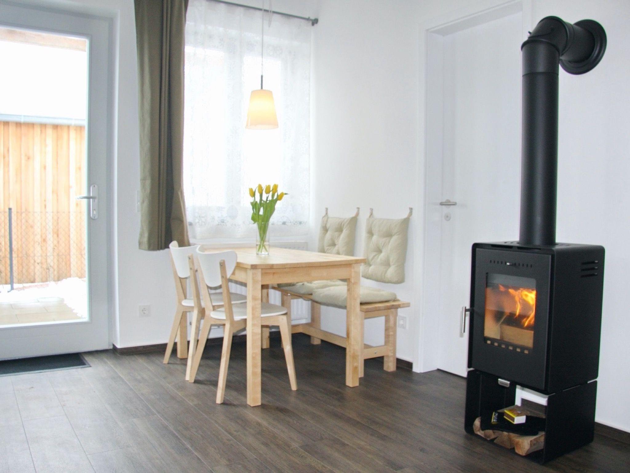 Ferienwohnung 1 bietet Platz für 4 Personen. Es gibt ein Wohnzimmer, zwei Schlafzimmer, Küche und Bad. Betreten wird die Ferienwohnung über den Wohn- und Essbereich. Vorgelagert befindet sich hier eine sonnige Terrasse. Das Wohnzimmer ist mit Couch und Kamin zum Ausruhen gerüstet. An das Wohnzimmer grenzt die offene Küche. Ein Schlafzimmer ist mit einem Doppelbett, das andere mit einem Doppelstockbett ausgestattet.