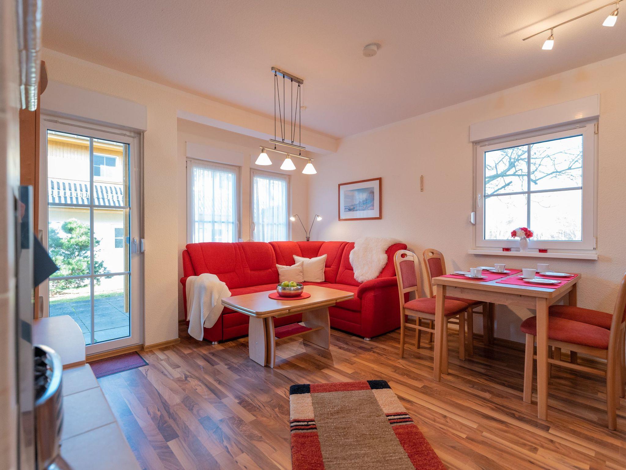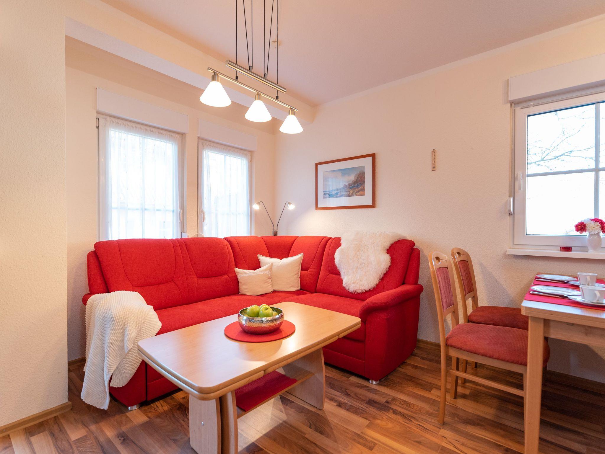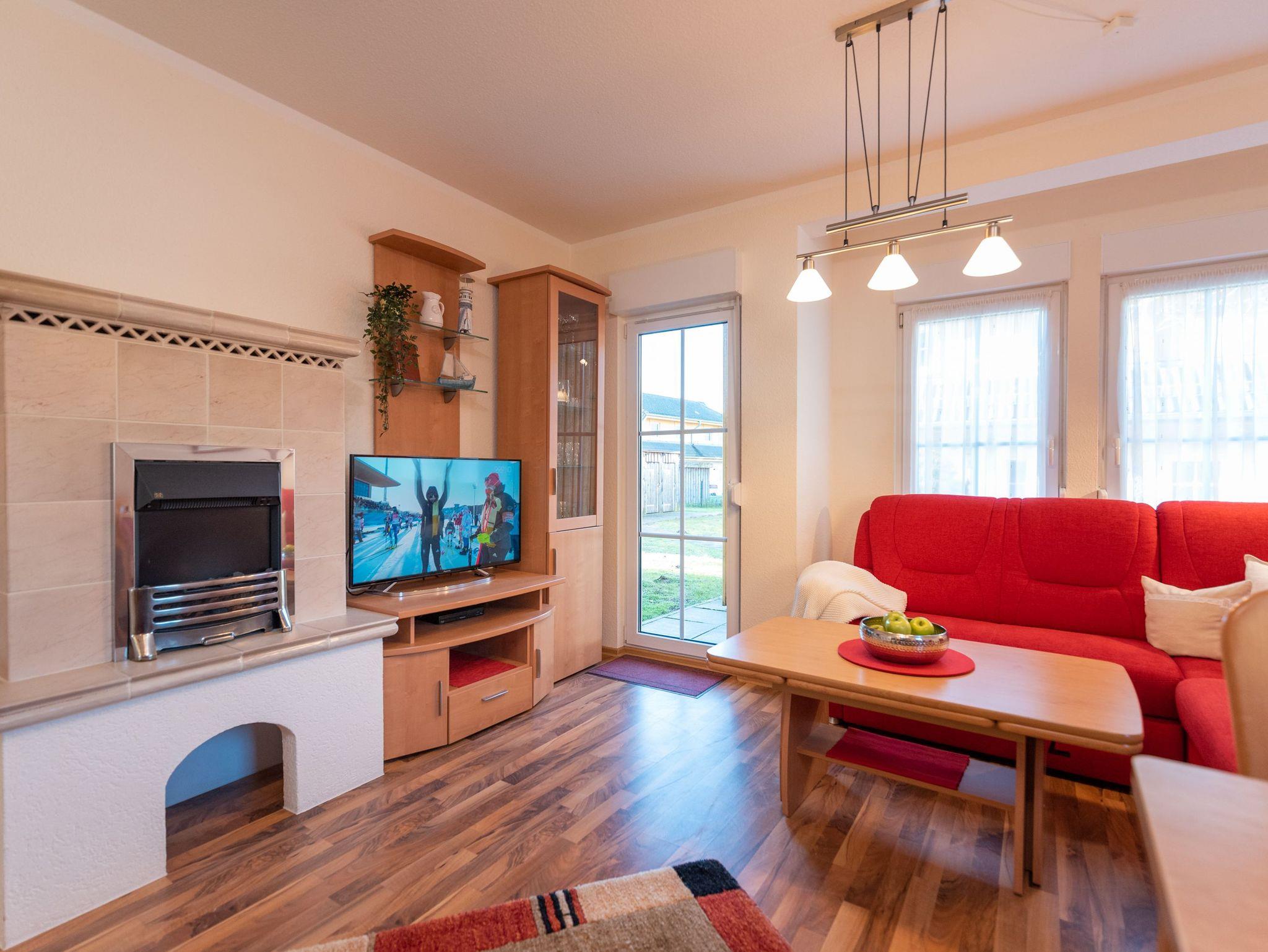 • Wohnraum: Bietet eine geräumige, neue Eck-Couch und einen Esstisch für vier Personen. Ein Elektro-Kamin sorgt für eine behagliche Atmosphäre, ergänzt durch modernes Entertainment mit Flachbild-TV, DVD-Player und Radio.