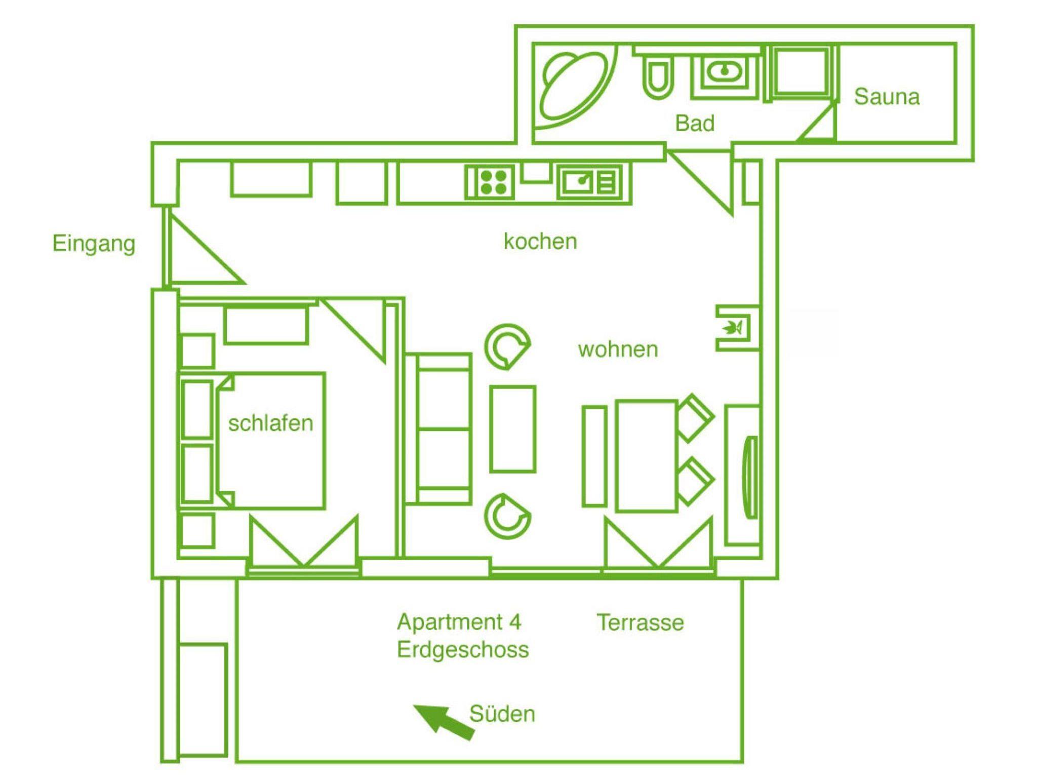 Dieses Apartment für bis zu 3 Personen heißt Sie herzlich willkommen! Auf Sie wartet ein gemütliches Schlafzimmer mit komfortablem Doppelbett und einem großem Wohn- und Kochbereich, der mit TV, Kamin und großem Esstisch keine Wünsche offenlässt. Im Wohnzimmer befindet sich mit der gemütlichen Couch eine Aufbettungsmöglichkeit. Die Küche ist für alle Bedürfnisse ausgestattet: Backofen, Ceran- Kochfeld, Geschirrspüler und Kühl-Gefrierkombination. Das große Bad ist mit einer Whirlpool- Badewanne, einer Dusche und einer Sauna ausgestattet. Die Wohnung hat eine ruhige Terrasse zur Rückseite des Hauses mit zahlreichen Sitzmöglichkeiten.