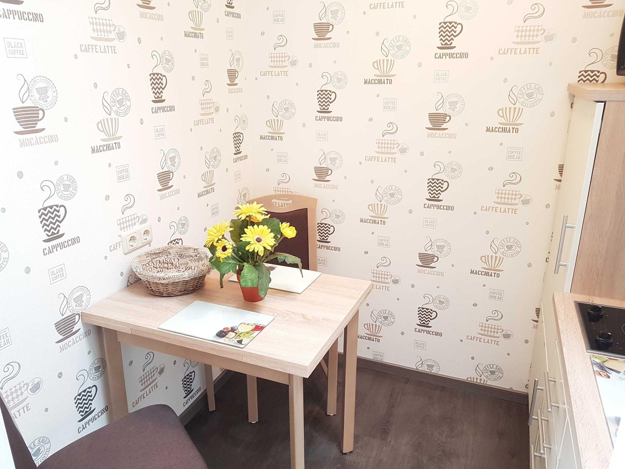 • Küche mit 2 Stühlen u. Tisch, Mini-Backofen, 2 Kochfelder, Dunstabzugshaube, Kühlschrank mit Gefrierfach, Kaffeemaschine, Toaster, Wasserkocher und div. Haushaltsutensilien