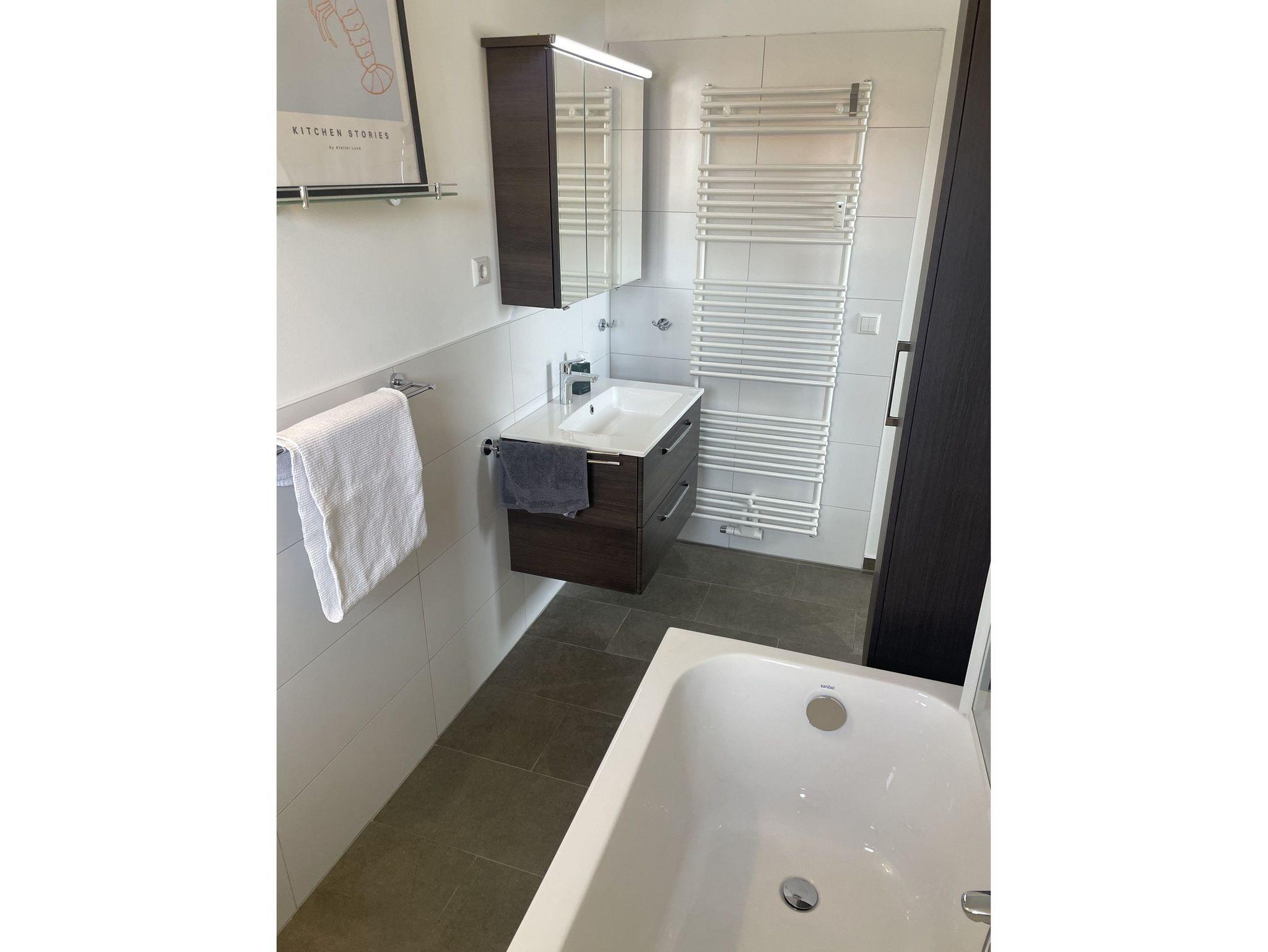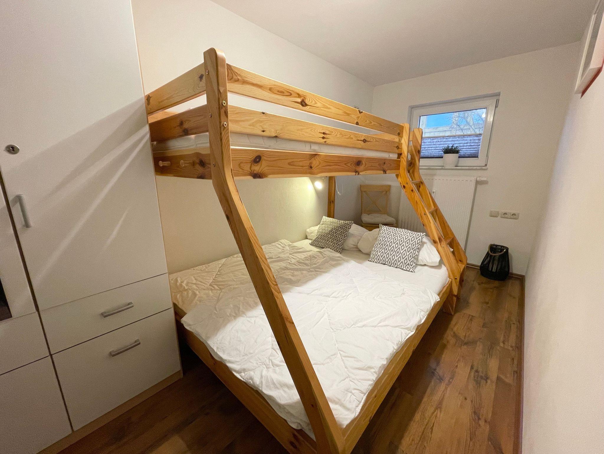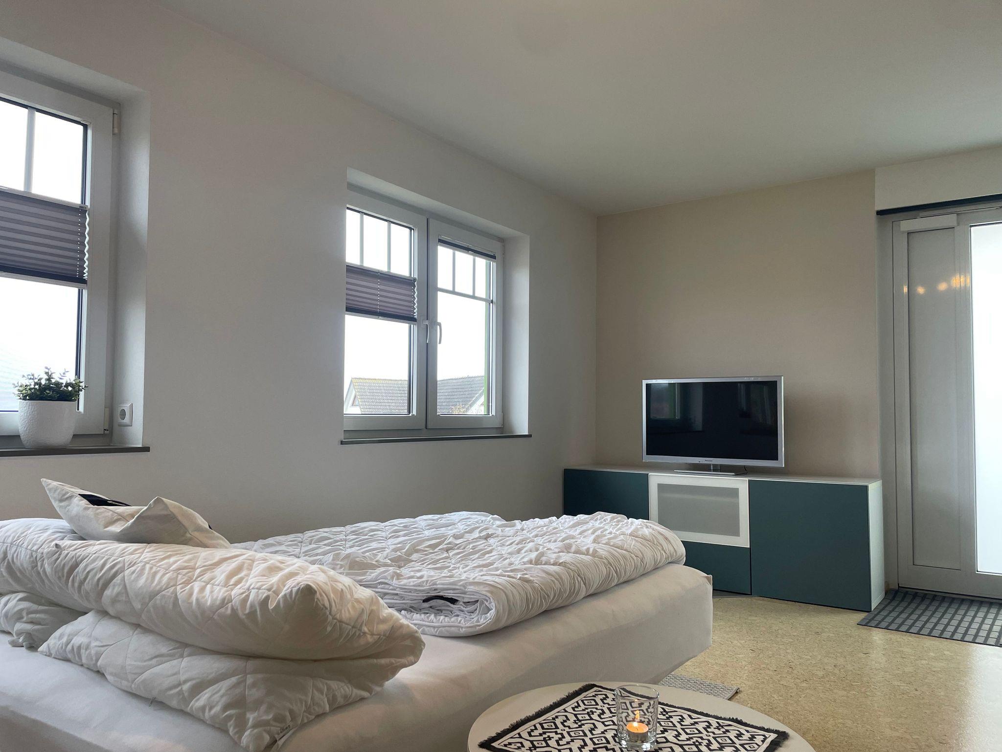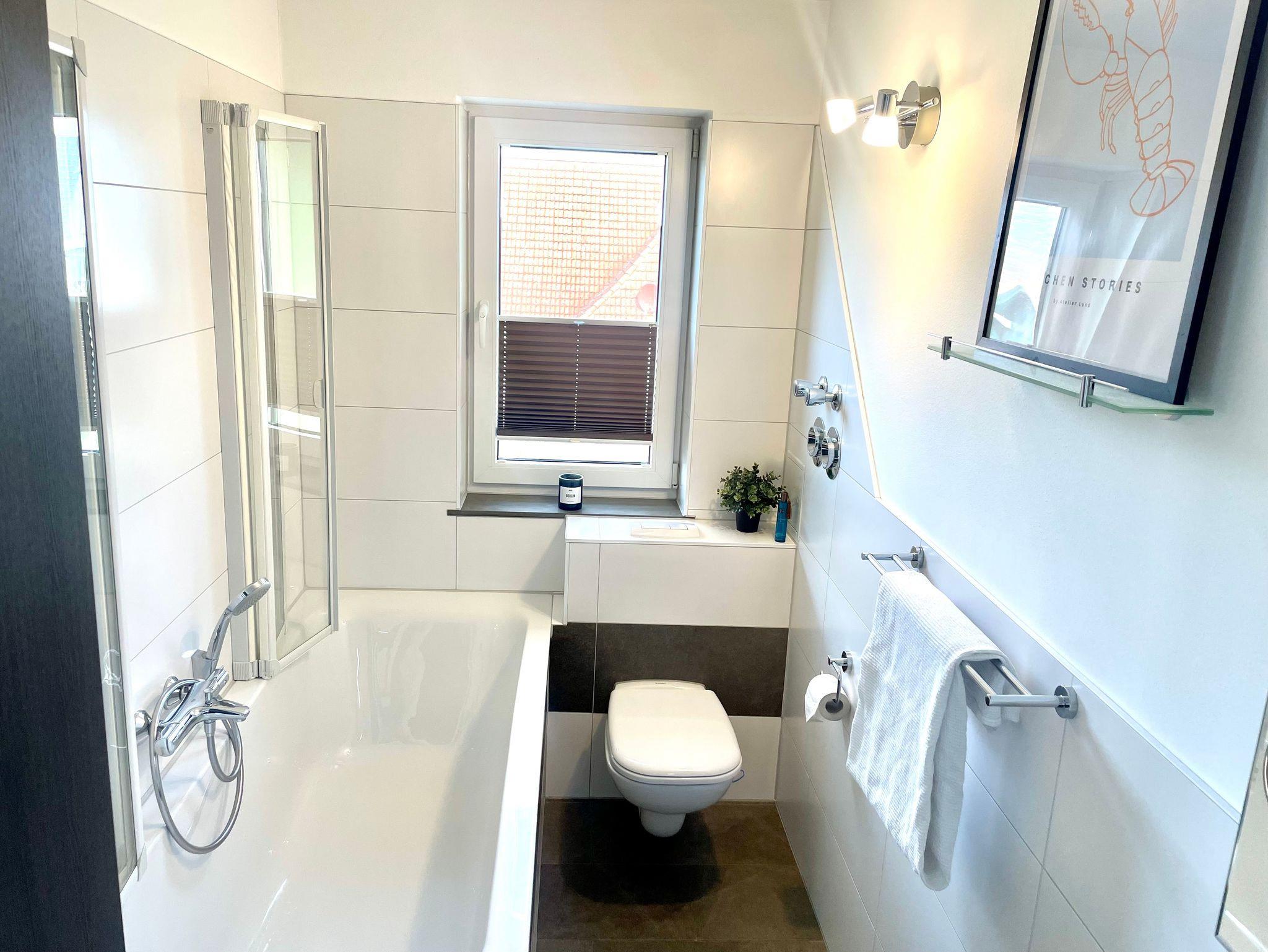 Die helle, mit Liebe zum Detail eingerichtete 1-Raum-Ferienwohnung erreichen Sie über einen separaten Zugang über die Treppe, direkt über die große Dachterrasse. Sie ist ausgestattet mit einer gemütlichen Schlafcouch (1,40x2,00m Liegefläche), Fernseher und einem Essplatz für 2 Personen. Die offene Einbauküche verfügt über einen Backofen, Herd, Kühlschrank mit Gefrierfach, Toaster, Wasserkocher, Kaffeemaschine und Spülmaschine. Das Badezimmer ist mit einer Badewanne mit Duschfunktion ausgestattet. Dort gibt es eine Fußbodenheizung.