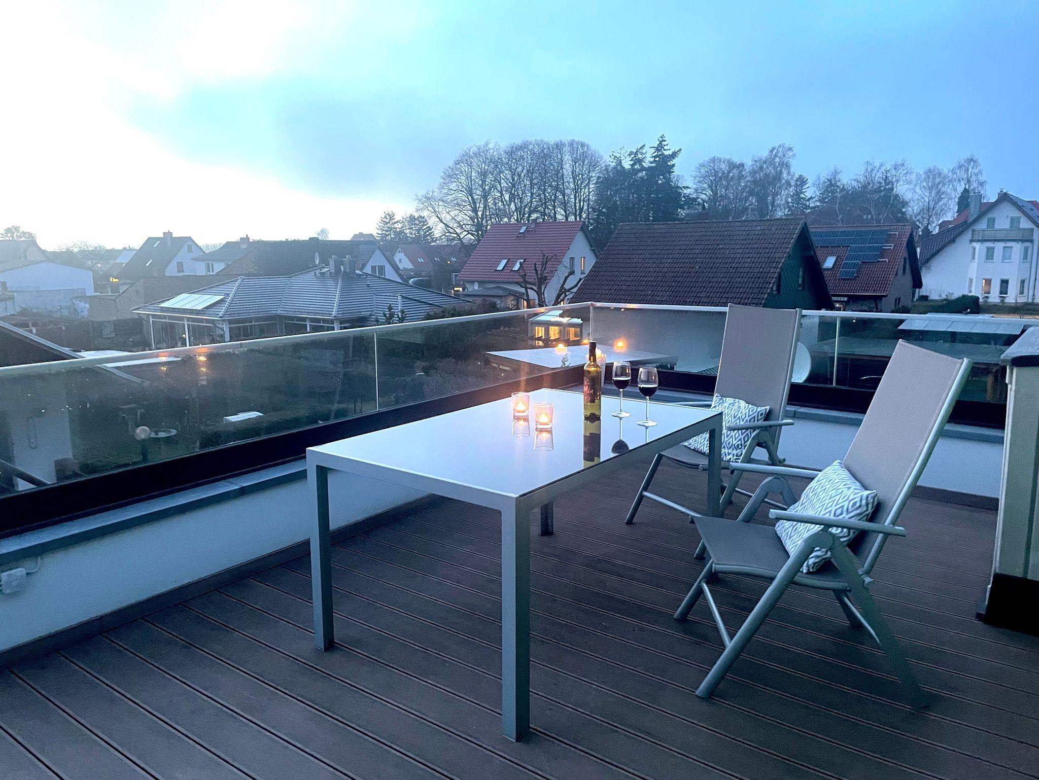 Die sonnige, 18 qm große Dachterrasse ist perfekt für ein Frühstück in der Sonne, entspannte Stunden oder einen romantischen Abend bei Sonnenuntergang.