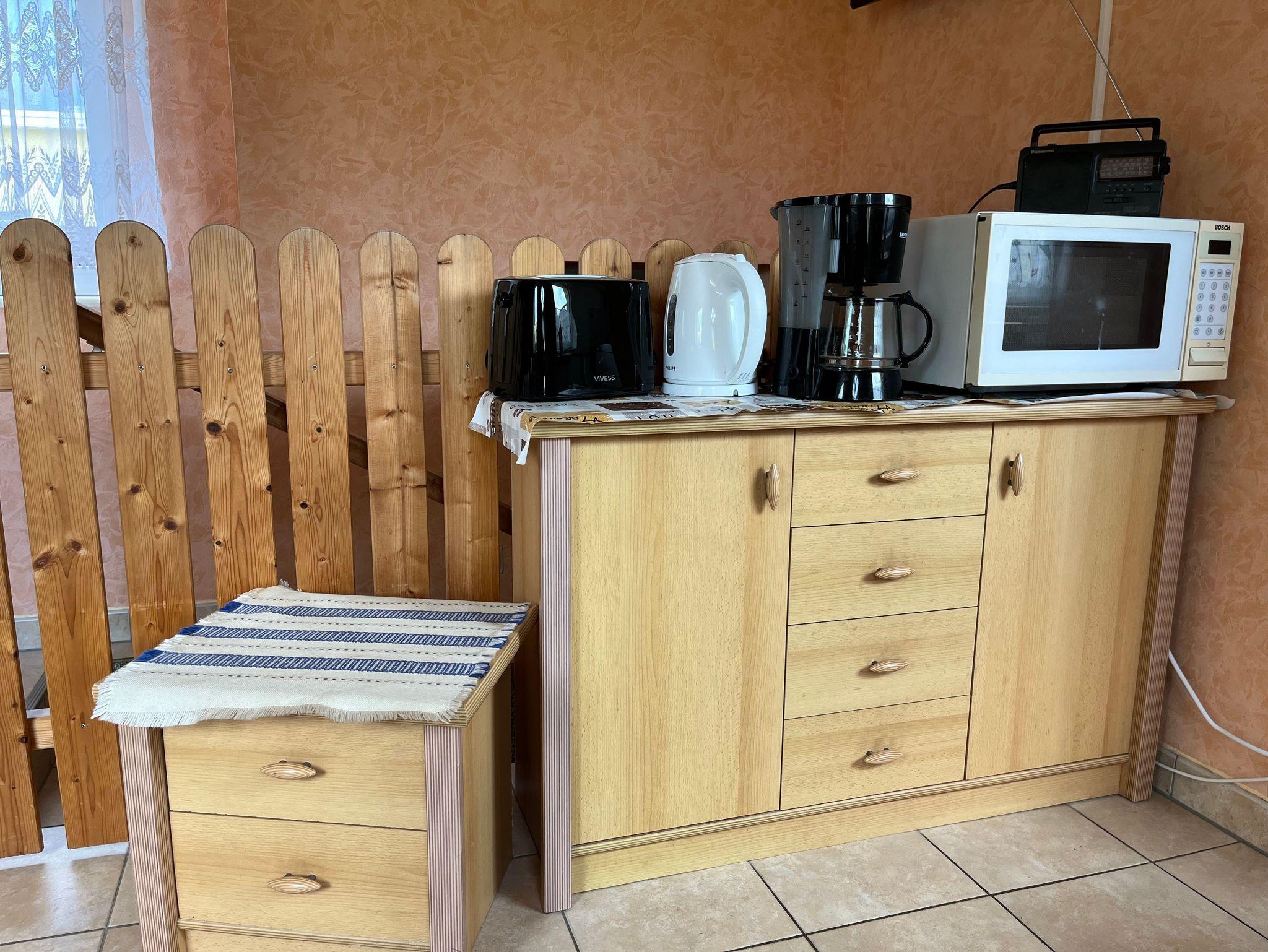 2-Raum-Ferienwohnung im Erdgeschoß, einfach und zweckmäig eingerichtet. Wohnzimmer mit kleine Kochnische mit 2-Plattenherd, Kühlschrank, Mikrowelle, Toaster, Wasserkocher und Kaffeemaschine. 1 Schlafzimmer im Souterrain mit Doppelbett. Bad mit Dusche und WC. Terrasse direkt an der Wohnung mit Gartenmöbel.