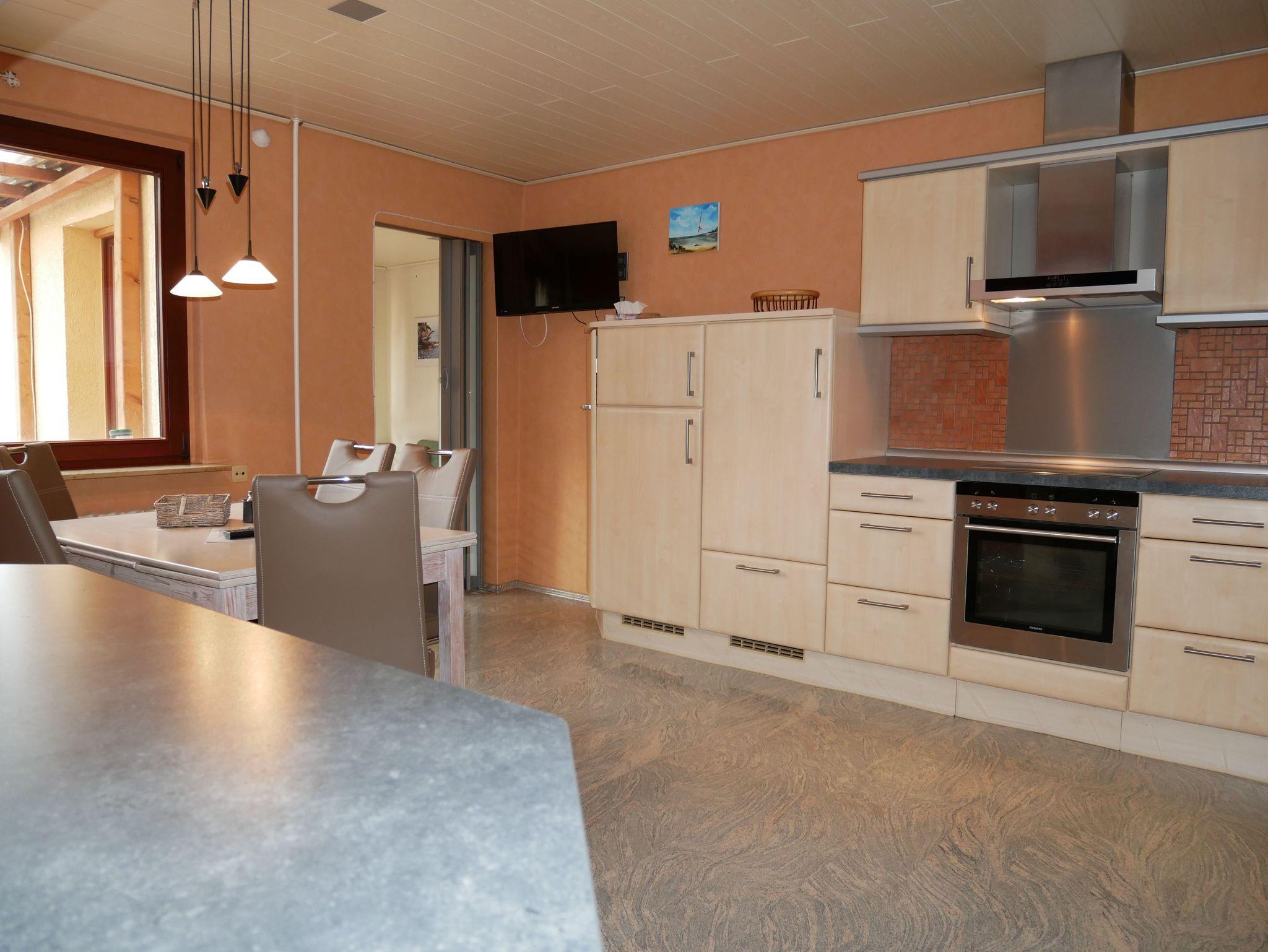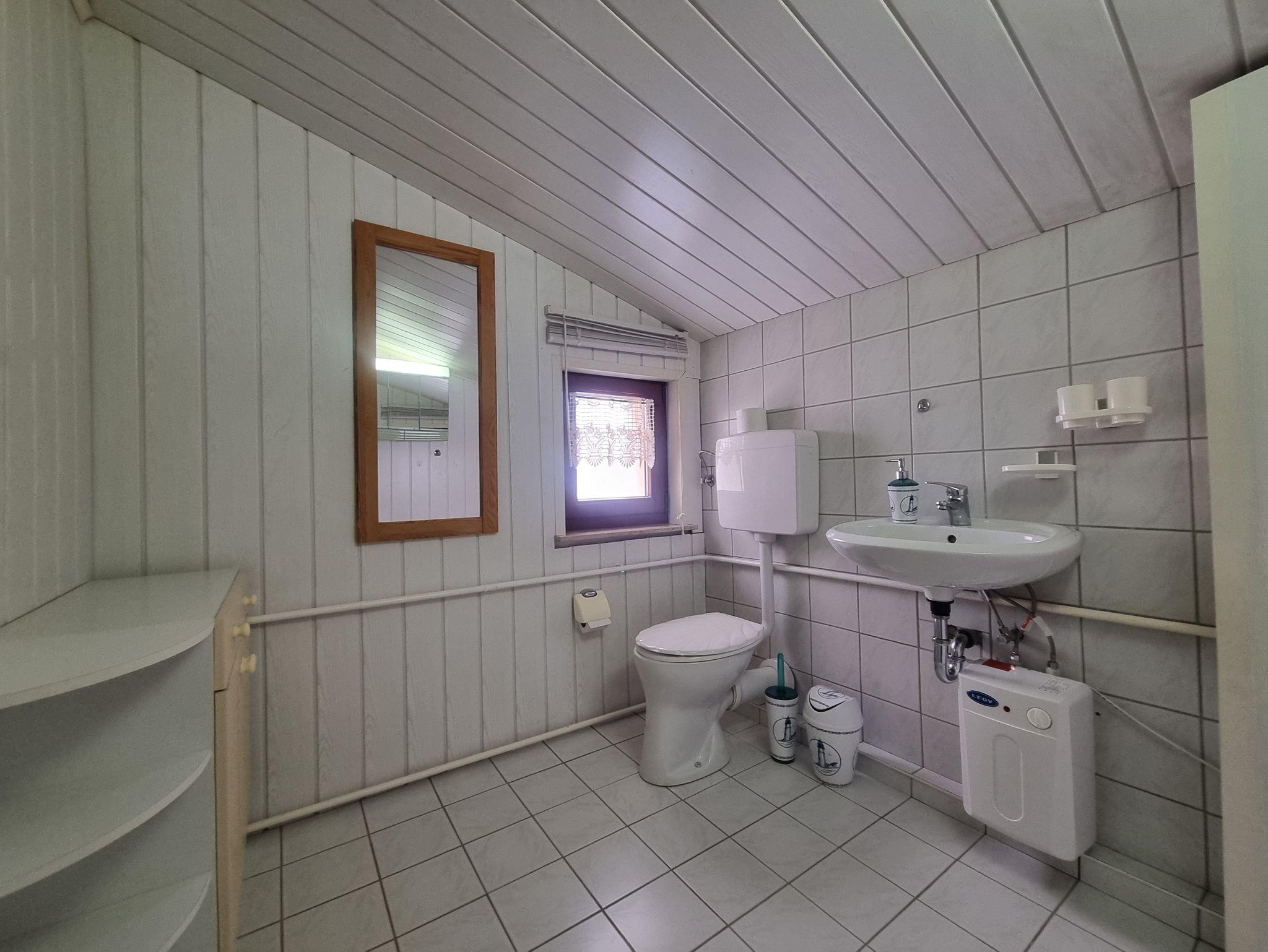 Im Erdgeschoß erwartet Sie eine große, voll ausgestattete Küche mit Cerankochfeld, Backofen, Kühlschrank mit Gefrierfach, Spülmaschine, Wasserkocher, Toaster und Kaffeemaschine. Hier finden Sie auch einen großen Esstisch, an dem Sie gemeinsam Mahlzeiten genießen können. Für Unterhaltung sorgt ein Flat-TV. Angrenzend an die Küche befindet sich ein Vorbau mit einer Sitzecke, von der aus Sie auf die sonnige Terrasse gelangen ? perfekt für entspannte Stunden im Freien. Vor der Terrasse liegt ein kleiner Teich, der für eine ruhige Atmosphäre sorgt. Außerdem gibt es im Erdgeschoss ein Schlafzimmer mit Doppelbett, Kleiderschrank und Flat-TV sowie ein Tageslicht-Badezimmer mit Dusche, Badewanne, WC und Haartrockner.