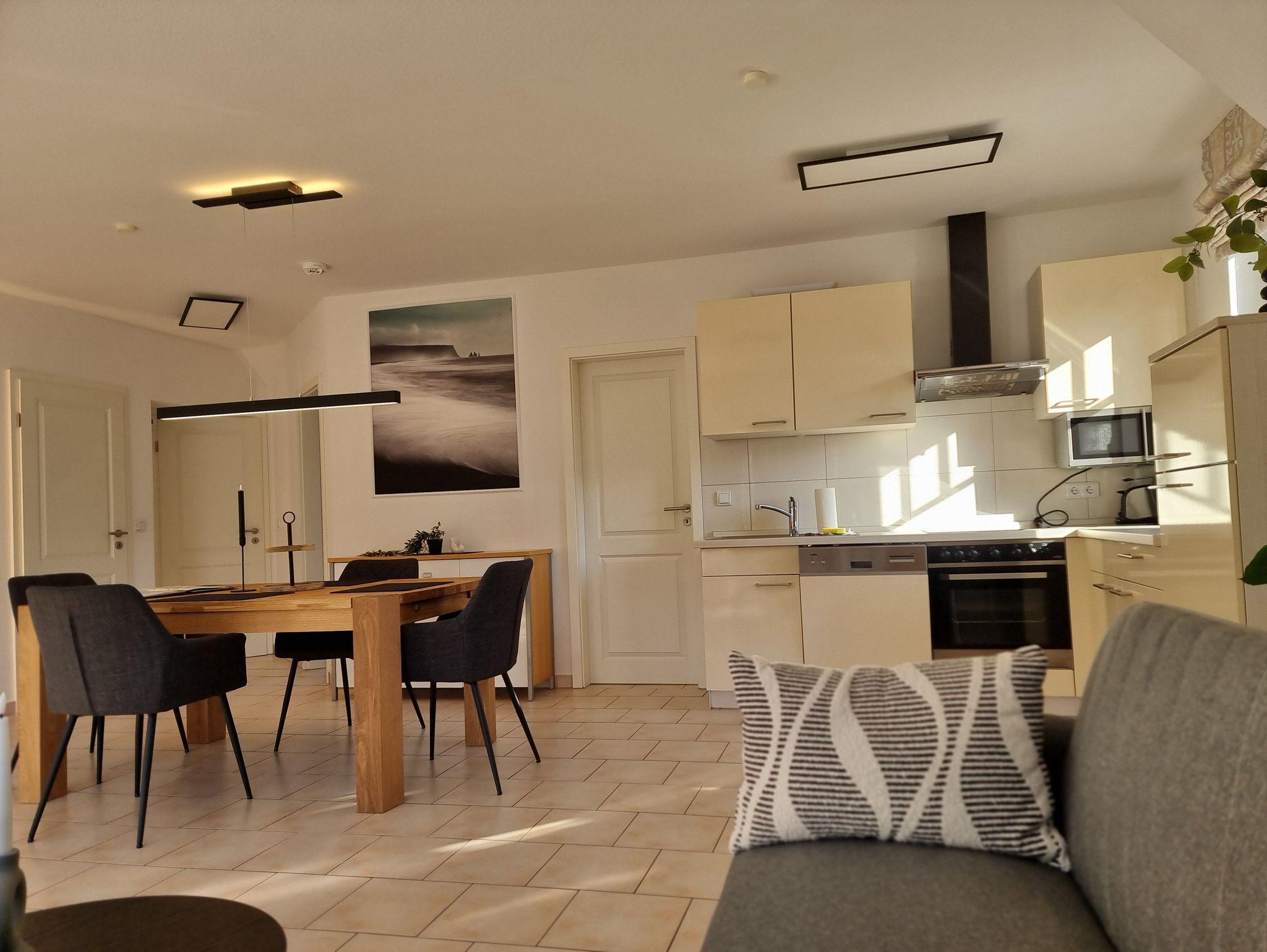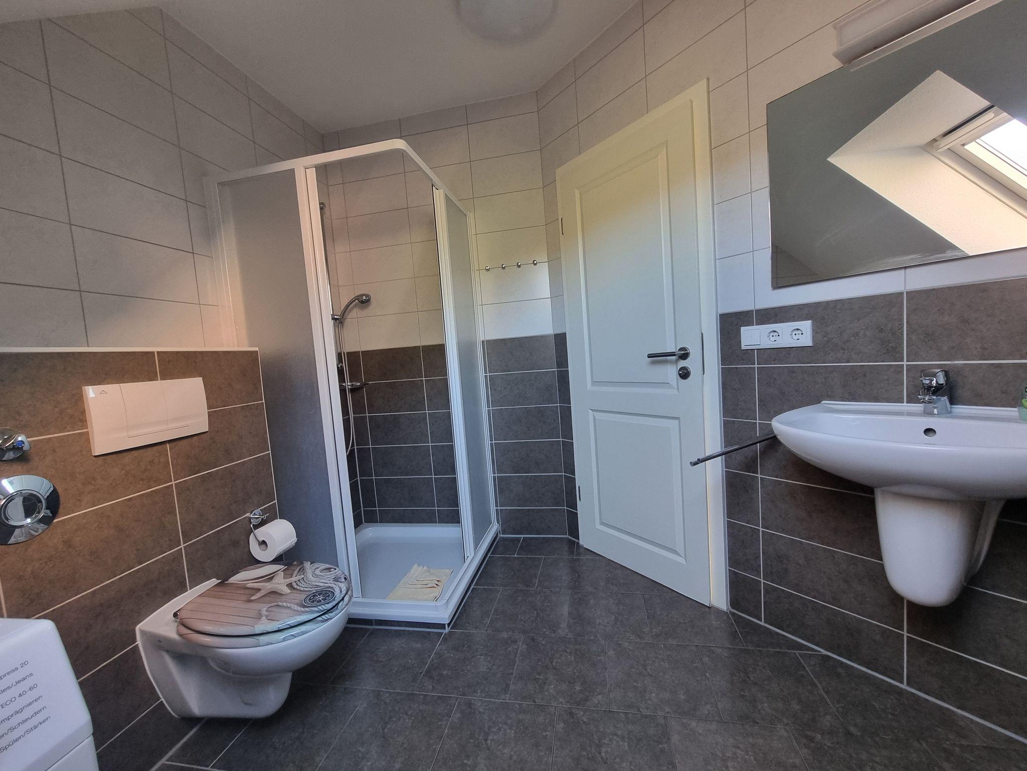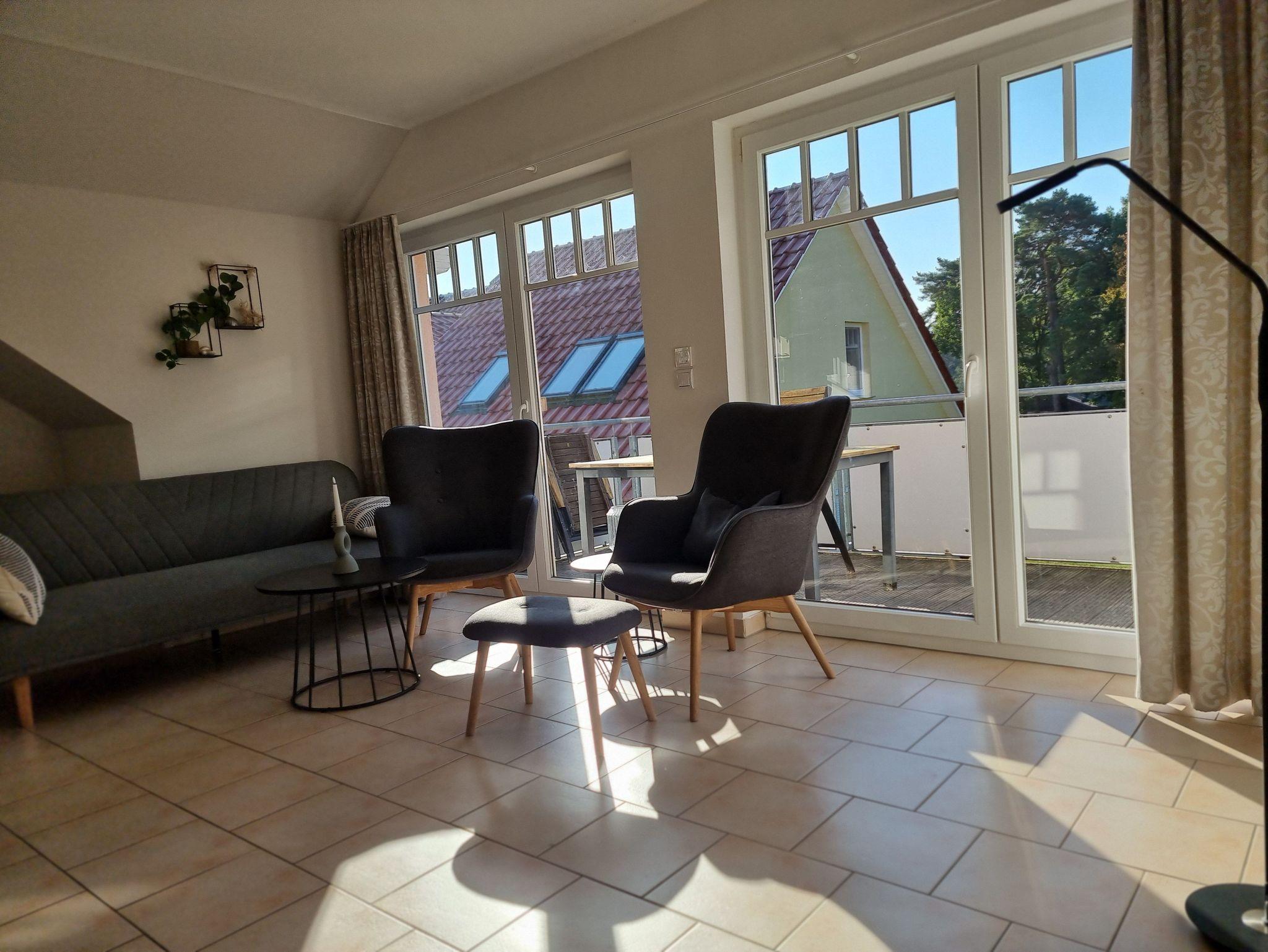 Die Ferienwohnung liegt im Dachgeschoß des Ferienhauses. Sie besteht aus Wohnzimmer, kompl. ausgestatteter Küche, Schlafzimmer und Tageslichtbad. Die Ausstattung der Einbauküche ist neuwertig funktional und qualitativ hochwertig unter anderem mit Toaster, Kaffeemaschine, Backofen mit Heißluft, Kochfeld, Geschirrspüler, Gefrierfach. Großer Südbalkon mit Blick auf den Küstenwald, große Spielwiese.