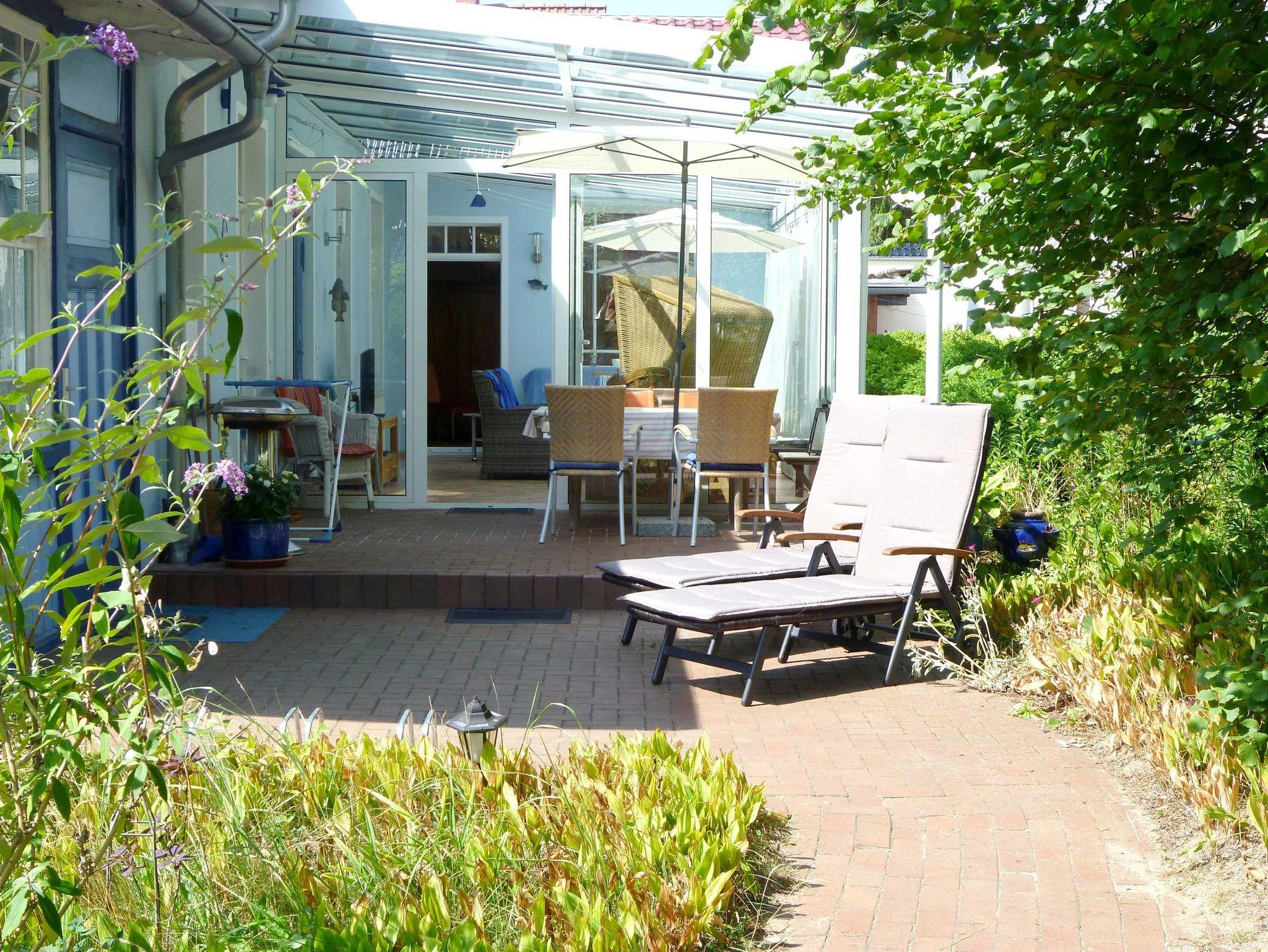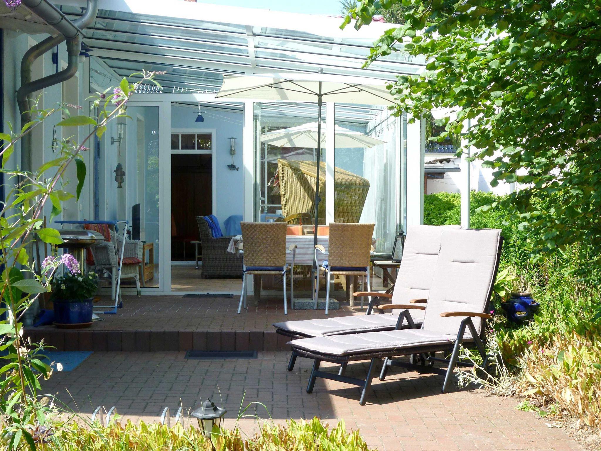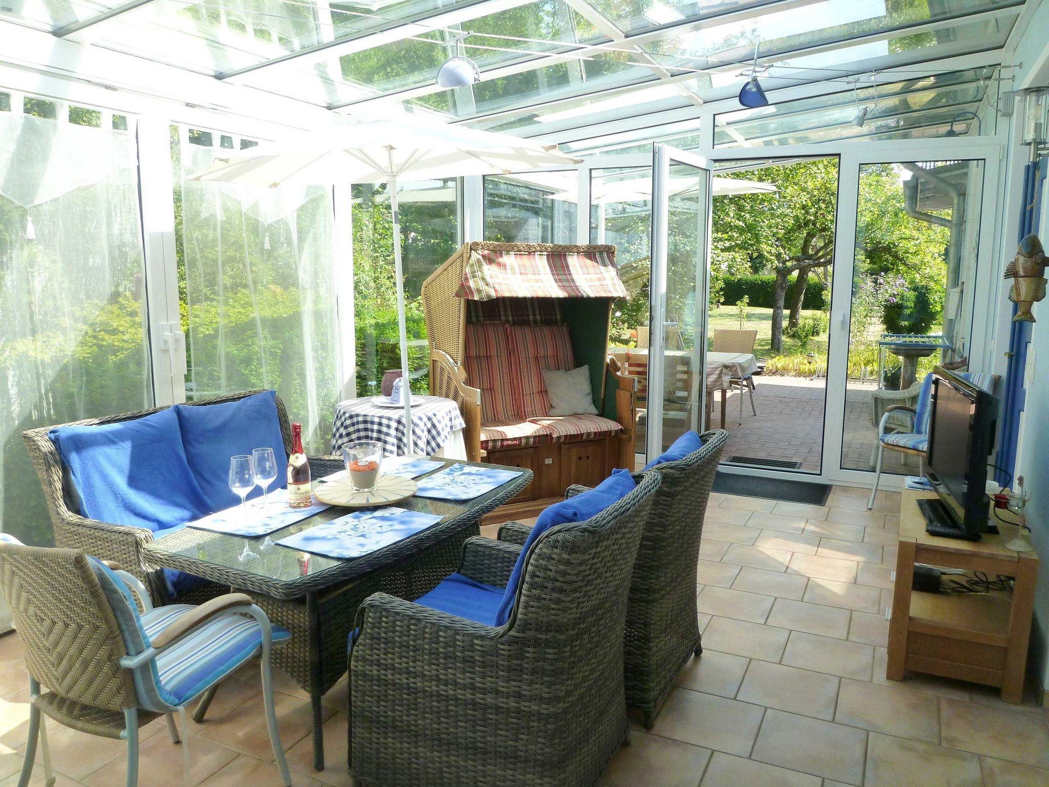 Für 2 bis 4 Personen, 92 m², 4 Zimmer, Küche, großer Wintergarten 26 m² mit 55 Fernseher (Smart-TV) - ein idealer, geschützter Platz bei jedem Wetter, Bad in maritimem Design mit Dusche/WC, exklusives Schlafzimmer in Ahorn mit Doppelbett. Zweites Schlafzimmer mit hochwertigem Doppelbett 1,80 m breit. Der Rahmen ist motorisch verstellbar und die Matratze verfügt über mehrere Liegezonen. Das Bett ist deshalb auch für Senioren geeignet. Hochwertiges Kinderbett 0,7 m x 1,4 m. Hochmoderne Küche mit Spülmaschine, großes Tiefkühlfach, Cerankochfeld. Möblierte und überdachte Terrasse nach Süden, direkter Zugang von der Küche, sehr geschützte Terrasse nach Westen. LCD-Fernseher im Wohnzimmer und Wintergarten (Sat-TV), Stereoanlage und DVD-Player, komfortable Ausstattung, hochwertige Miele Waschmaschine, Raumhöhe 2,90 m, Parkplatz auf dem Grundstück. Der große Wintergarten (zwei große Schiebetüren) ist nach Osten orientiert, deshalb ist die Raumtemperatur immer optimal.