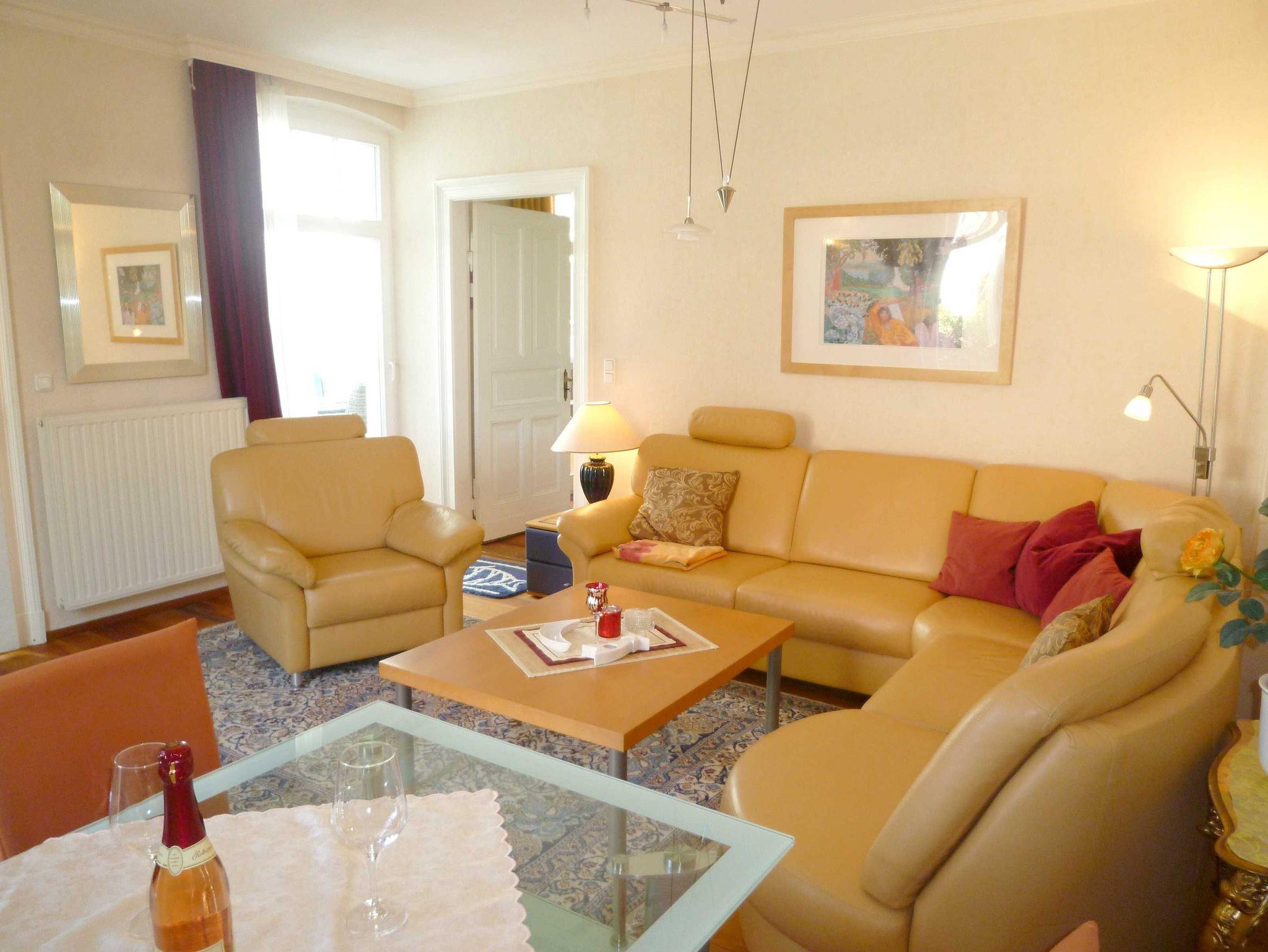 Das Highlight ist der sehr große Wohnwintergarten. Er ist nach Osten orientiert, deshalb ist die Raumtemperatur auch im Sommer immer ideal. Zwei große Schiebetüren lassen sich zum schönen alten Garten mit vielen Bäumen öffnen, deshalb lebt man mitten im Garten und kann die gesunde Seeluft genießen. Außerdem bietet er, weil er voll beheizbar ist, zu jeder Jahreszeit einen herrlichen Platz im Grünen. Die hochwertige Ausstattung wird durch einen Strandkorb und Fernseher komplettiert. Die schönen Wohnräume mit Stuckdecken sind alle vom Wintergarten aus begehbar.