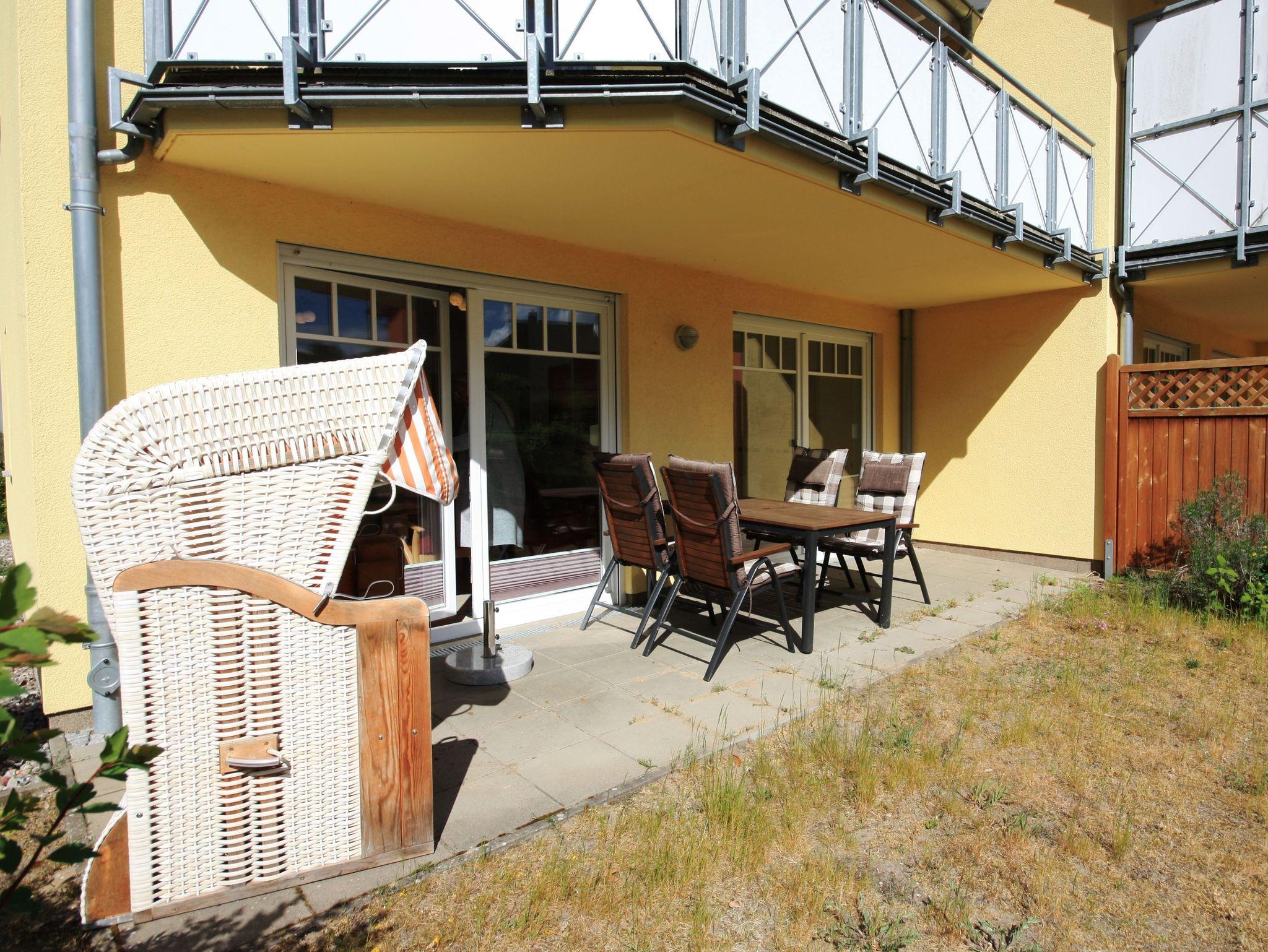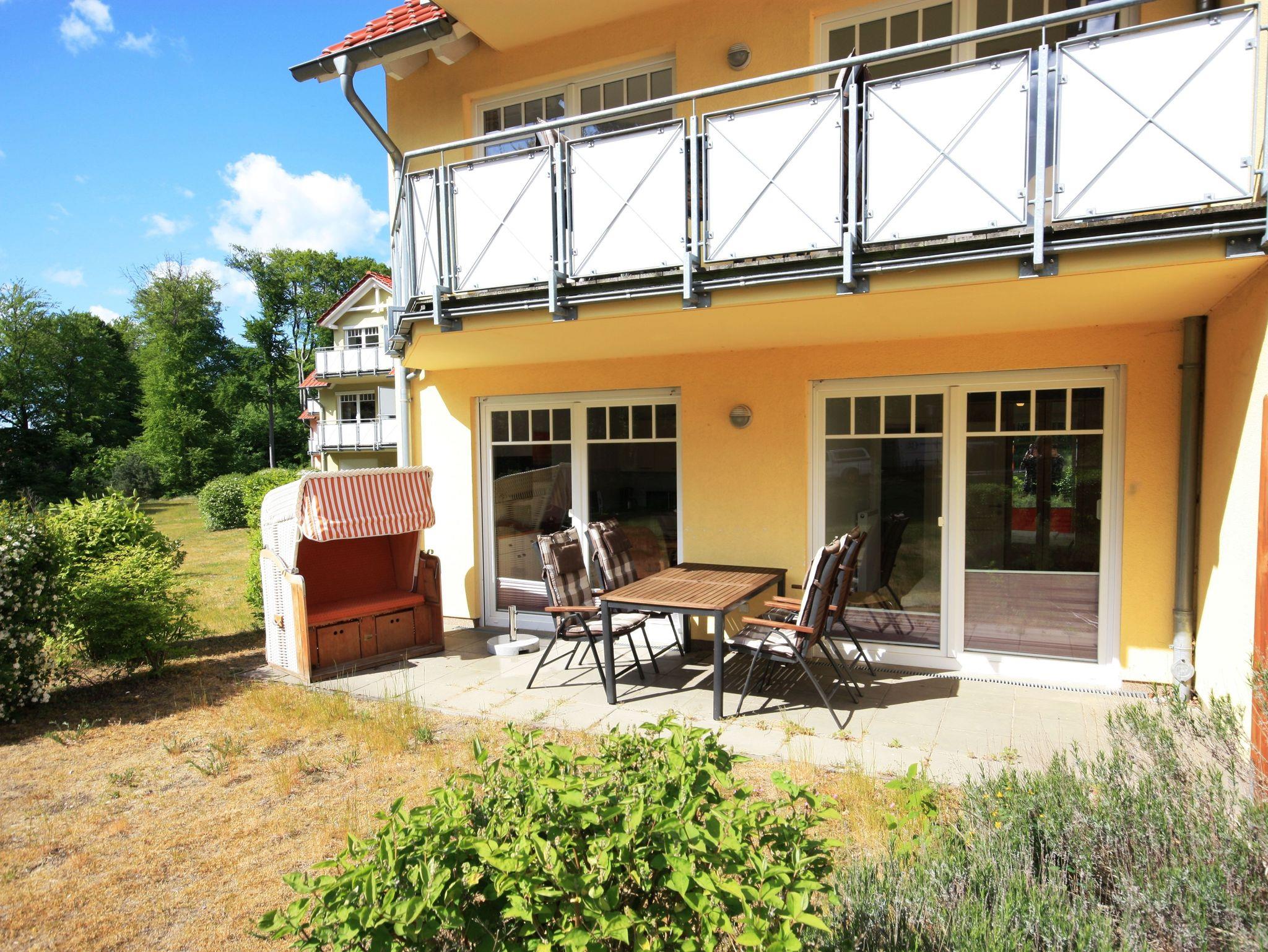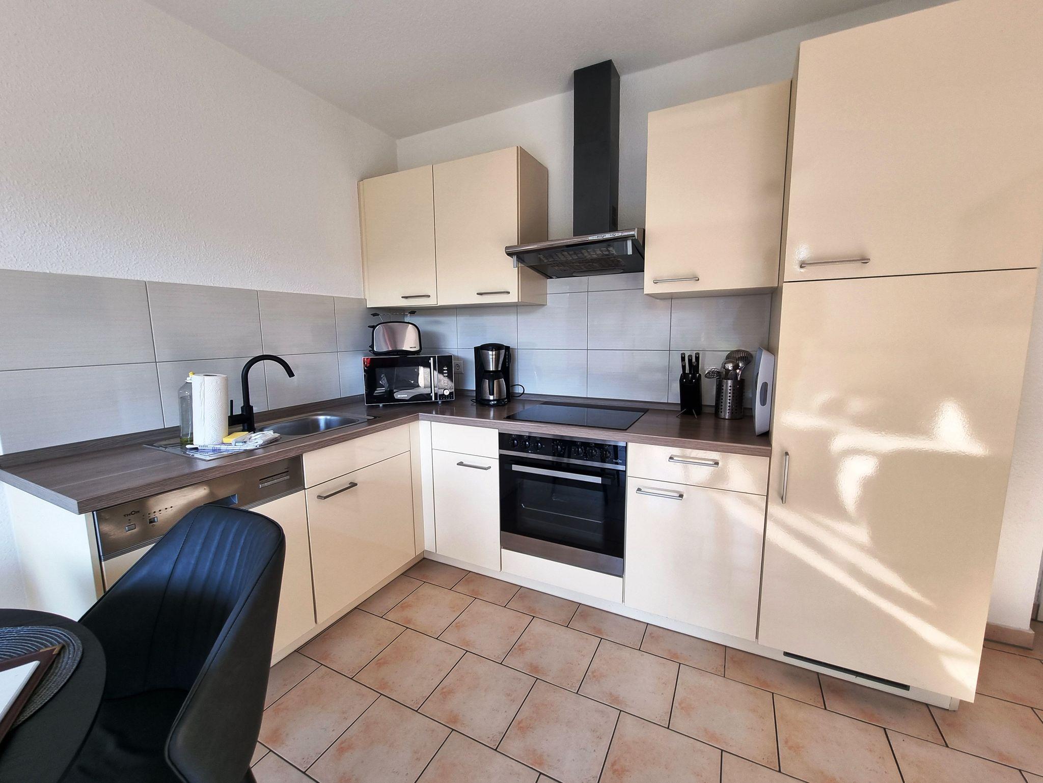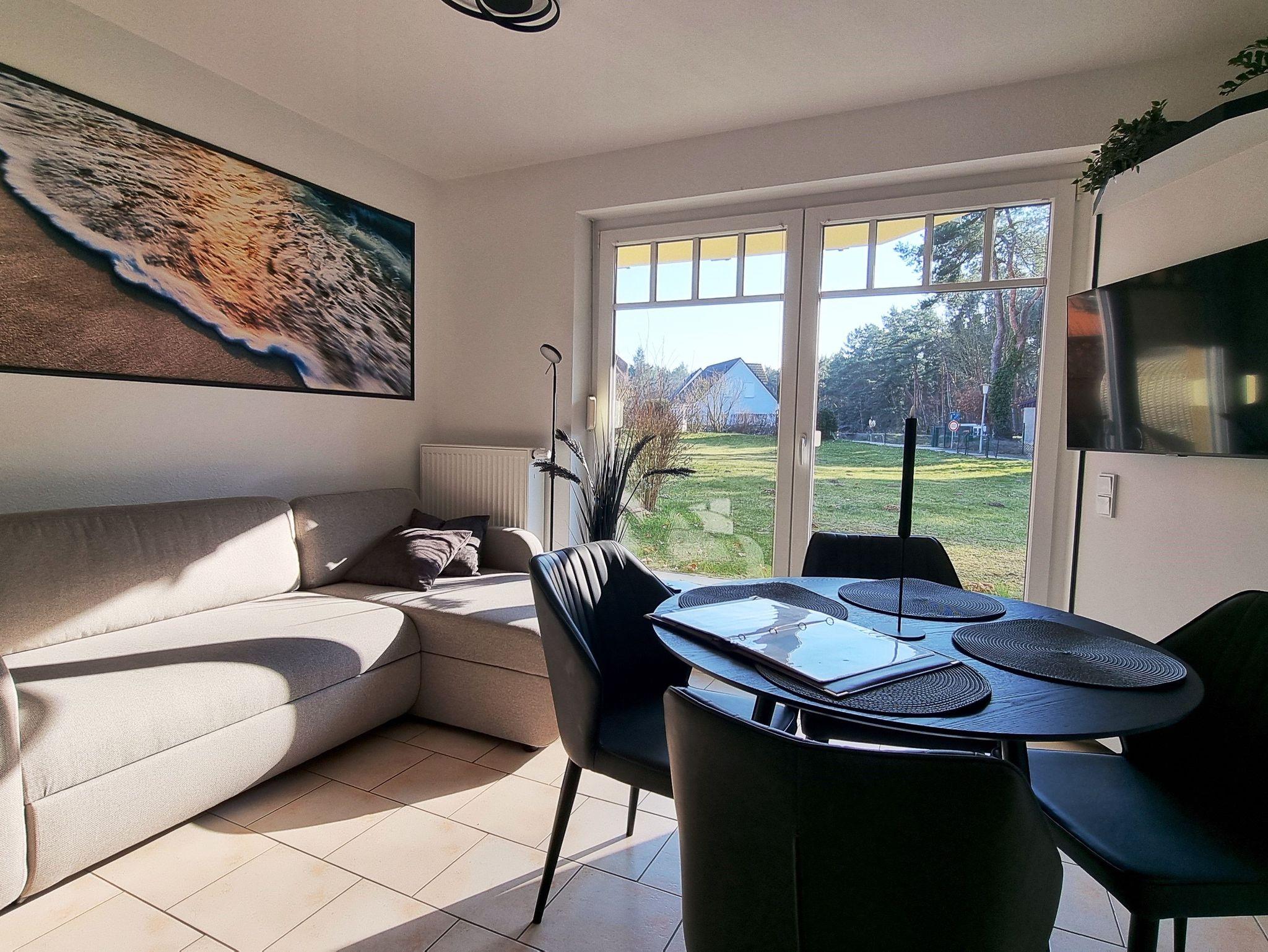 Die Ferienwohnung liegt im Erdgeschoß des Ferienhauses. Sie besteht aus Wohnzimmer, kompl. ausgestatteter Küche, Schlafzimmer und Tageslichtbad. Die Ausstattung der Einbauküche ist neuwertig funktional und qualitativ hochwertig unter anderem mit Toaster, Kaffeemaschine, Backofen mit Heißluft, Kochfeld, Geschirrspüler, Gefrierfach. Große Südterrasse mit Blick auf den Küstenwald, große Spielwiese.