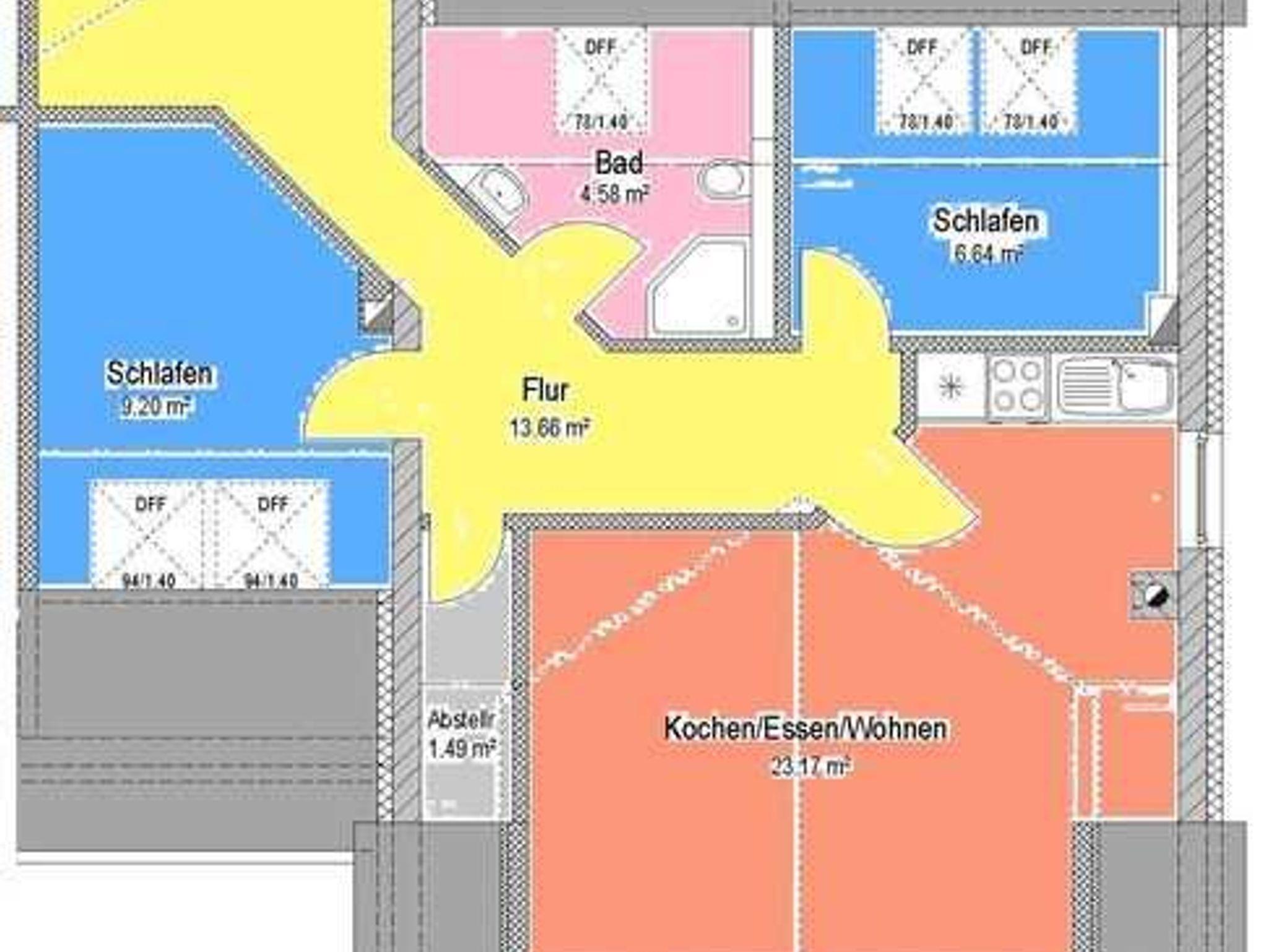 Die Wohnung (2016 renoviert) verfügt über ein Schlafzimmer mit Doppelbett und zusätzlichem 32''-Flachbildfernseher und ein Schlafzimmer mit Etagenbett. Die Wohnung ist ideal geeignet für Familien und Hundeliebhaber. In dieser Fewo ist ein Hund erlaubt.
