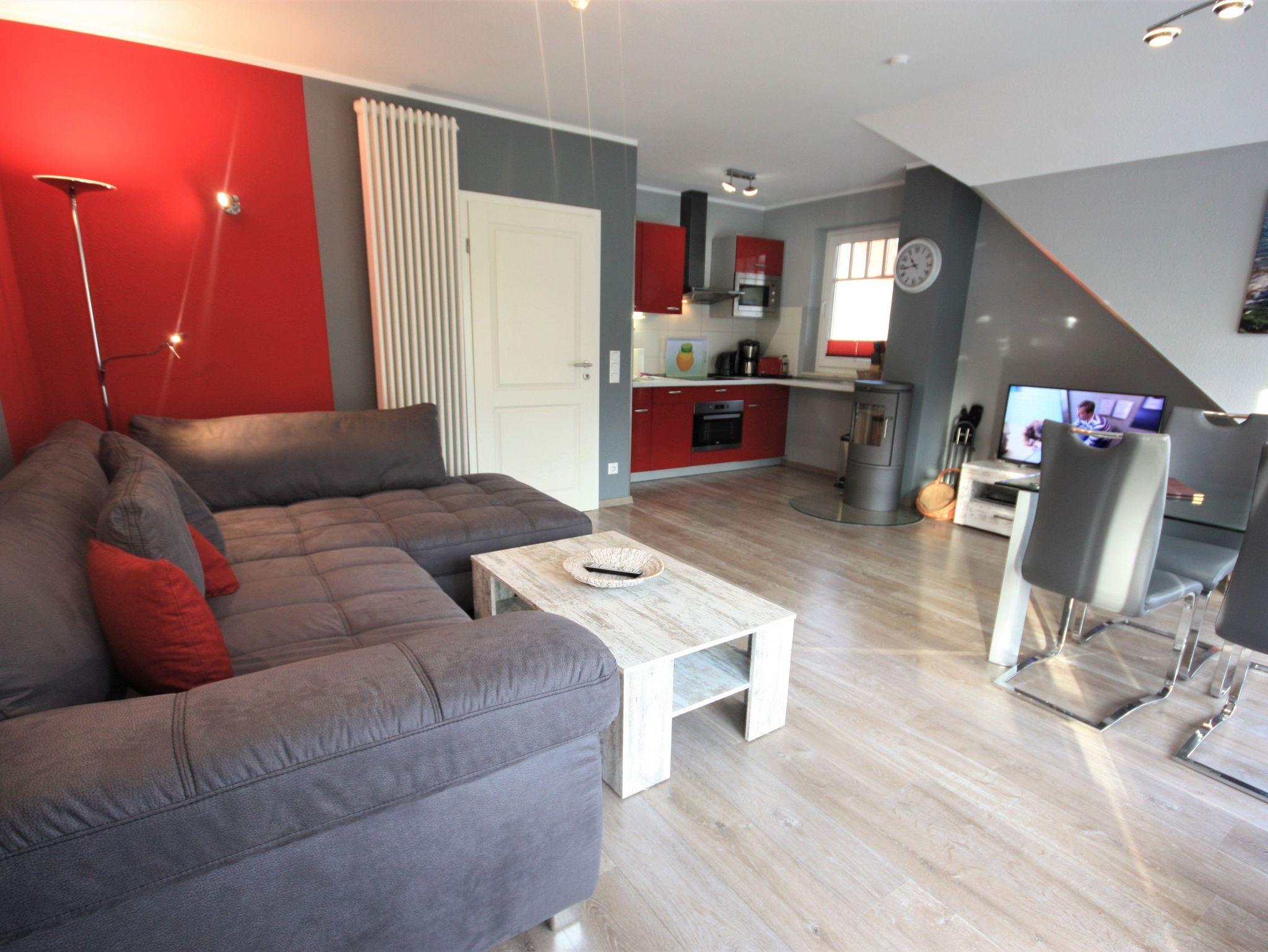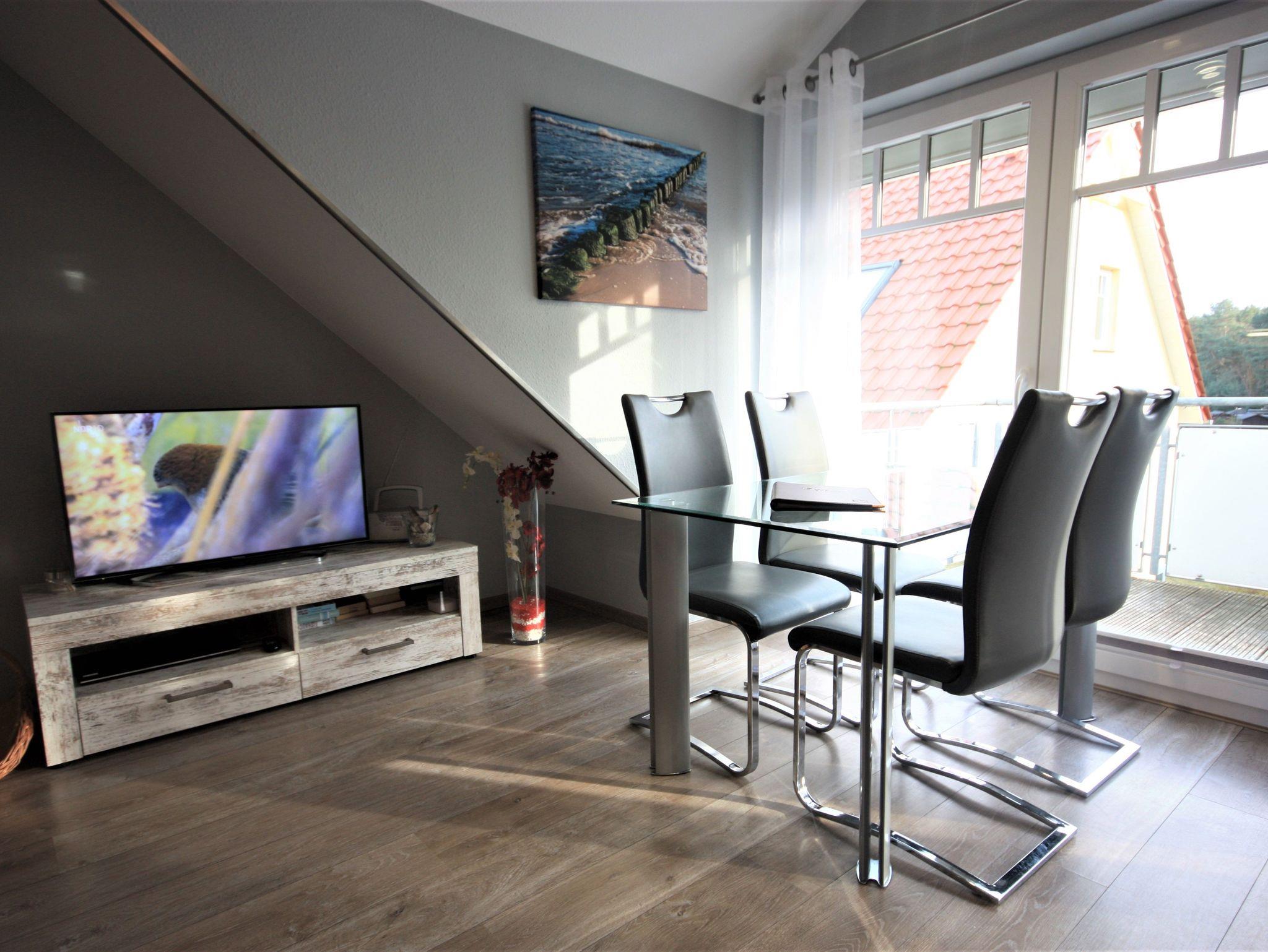 Die Ferienwohnung liegt im Dachgeschoß des Ferienhauses. Sie besteht aus Wohnzimmer, kompl. ausgestatteter Küche, Schlafzimmer und Tageslichtbad. Die Ausstattung der Einbauküche ist neuwertig funktional und qualitativ hochwertig unter anderem mit Toaster, Kaffeemaschine, Mikrowelle mit Heißluft, Kochfeld, Geschirrspüler, Gefrierfach. Großer Südbalkon mit Blick auf den Küstenwald, große Spielwiese, Grillplatz. Diese Ferienwohnung ist mit einem Echtholzkamin und WLAN ausgestattet.