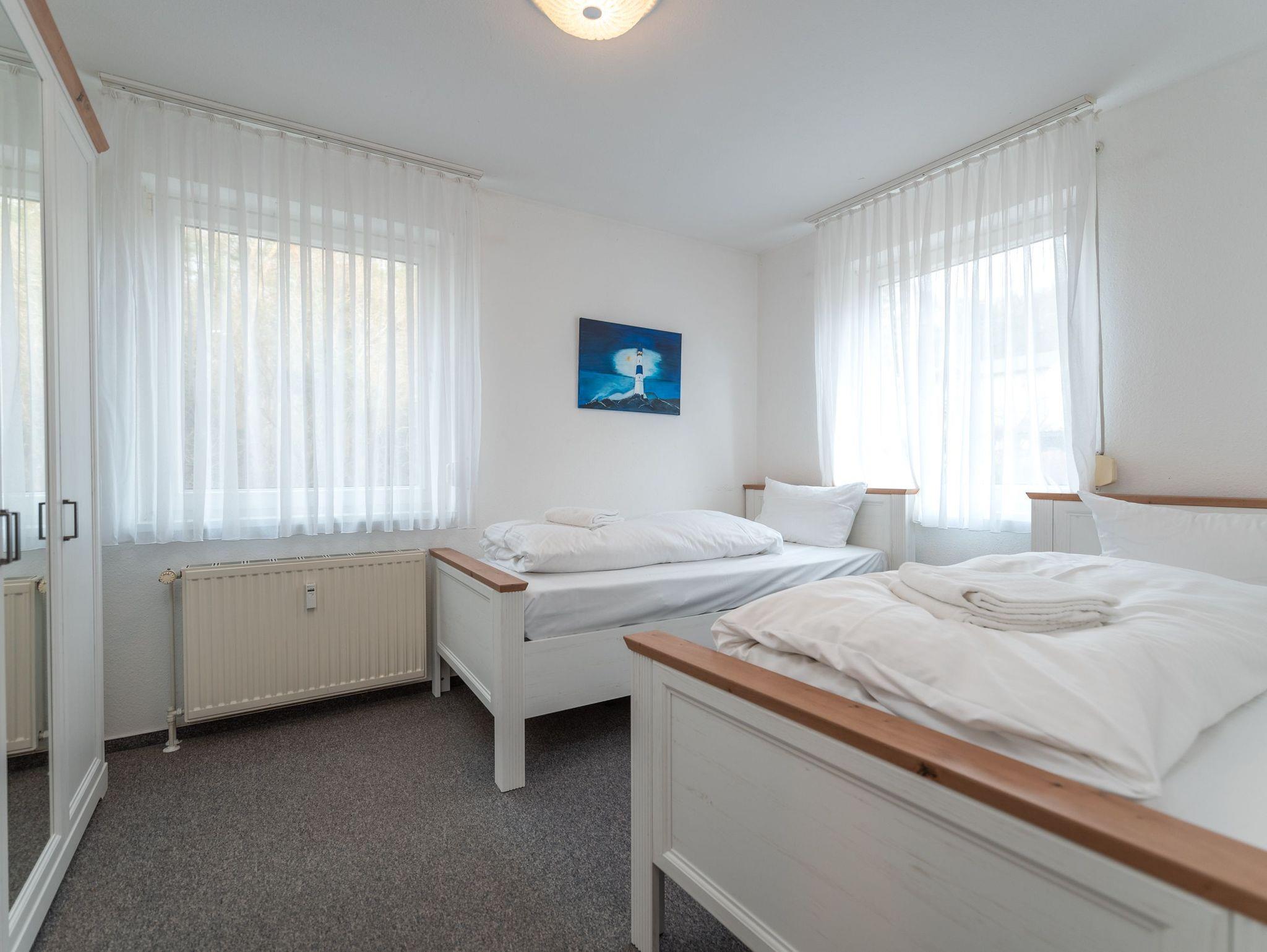 Die Wohnung ist ideal aufgeteilt in zwei behagliche Schlafzimmer, die ausreichend Platz für bis zu vier Personen und ein Baby bieten. Ein Schlafzimmer ist mit einem komfortablen Doppelbett ausgestattet, während das andere Zimmer zwei Einzelbetten bereithält, um den unterschiedlichen Bedürfnissen der Gäste gerecht zu werden.