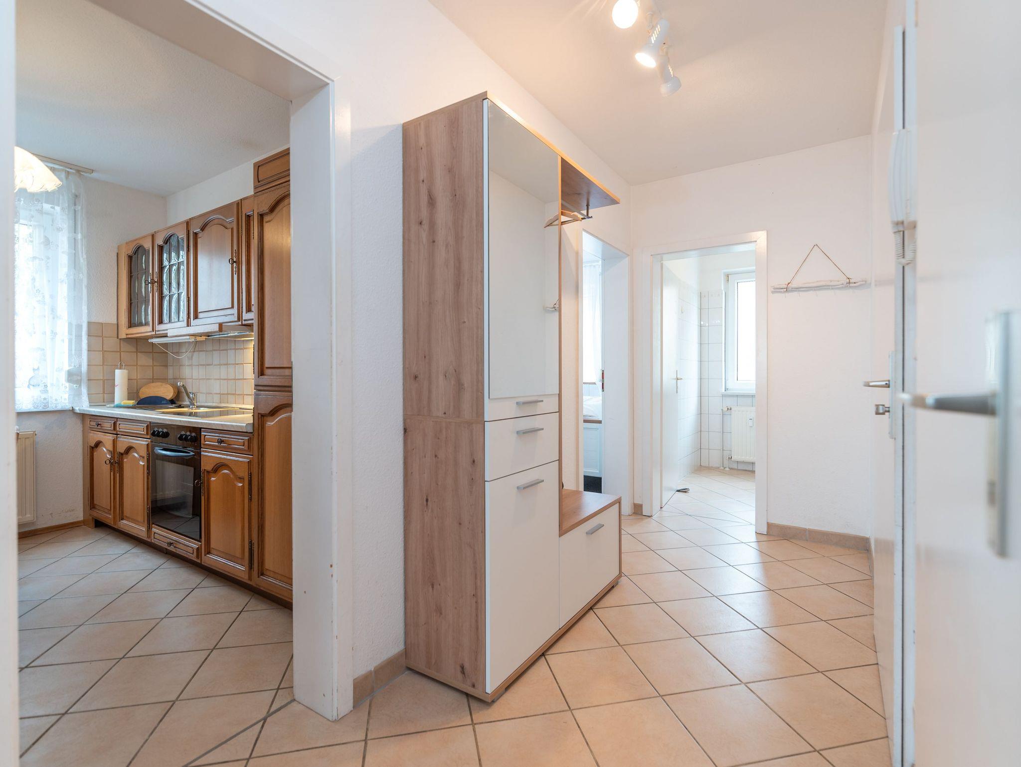 Das Wohnzimmer bildet das Herzstück der Wohnung und lädt mit seiner gemütlichen Couchecke und einem Fernseher zum Verweilen und Entspannen ein. Von hier aus haben Sie Zugang zum Balkon, der mit seiner ruhigen Atmosphäre zum Frühstücken im Freien oder einfach zum Genießen der frischen Seeluft einlädt.