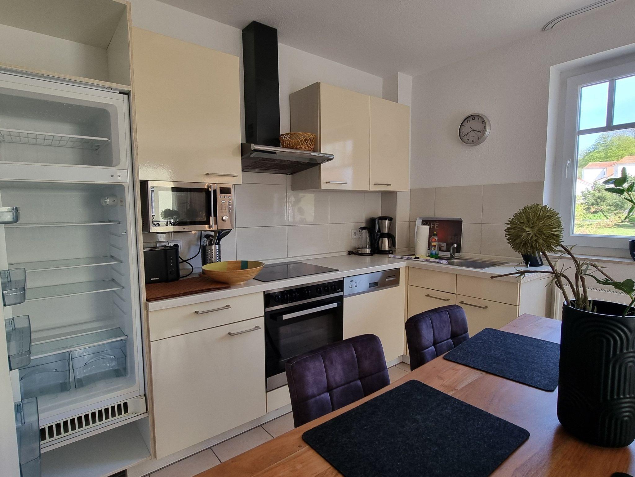Die Ferienwohnung liegt im Obergeschoß des Ferienhauses. Sie besteht aus Wohnzimmer, kompl. ausgestatteter Küche, Schlafzimmer und Tageslichtbad. Die Ausstattung der Einbauküche ist neuwertig funktional und qualitativ hochwertig unter anderem mit Toaster, Kaffeemaschine, Backofen mit Heißluft, Kochfeld, Geschirrspüler, Gefrierfach. Großer Südbalkon mit Blick auf den Küstenwald, große Spielwiese.