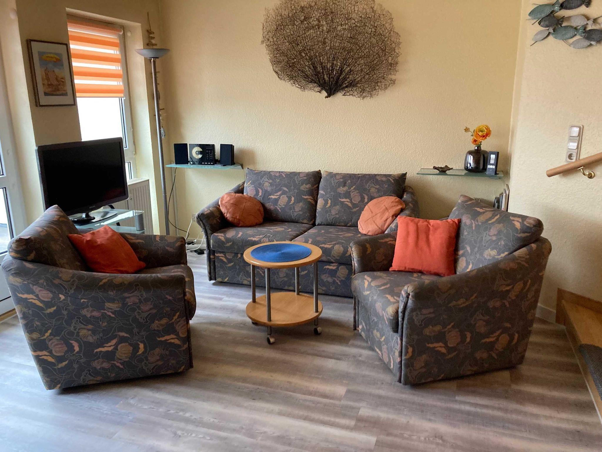 Die Ferienwohnung liegt im Dachgeschoss des Ferienhauses. Sie besteht aus Wohnzimmer mit Küchenzeile, Schlafzimmer und Tageslichtbad.