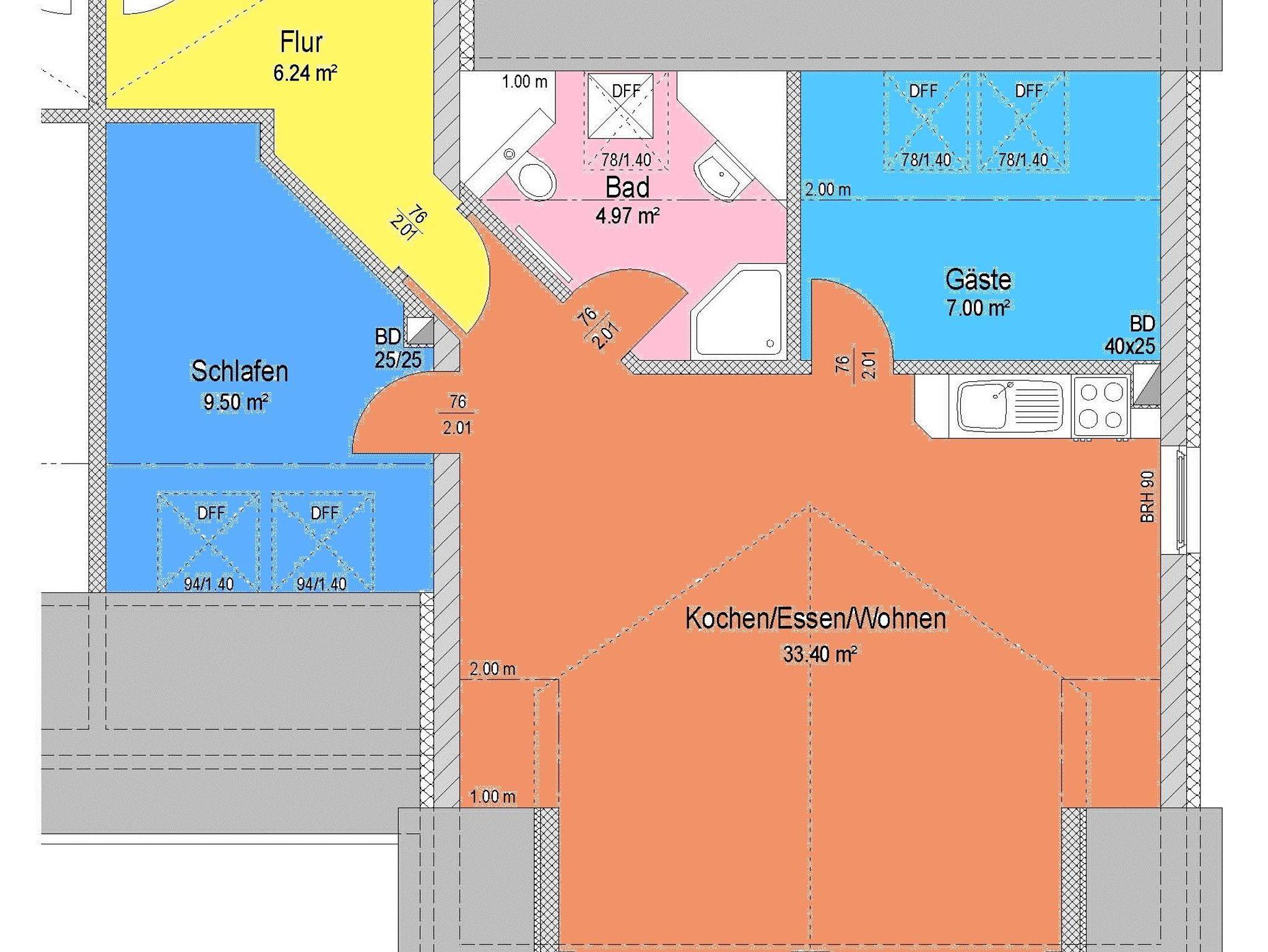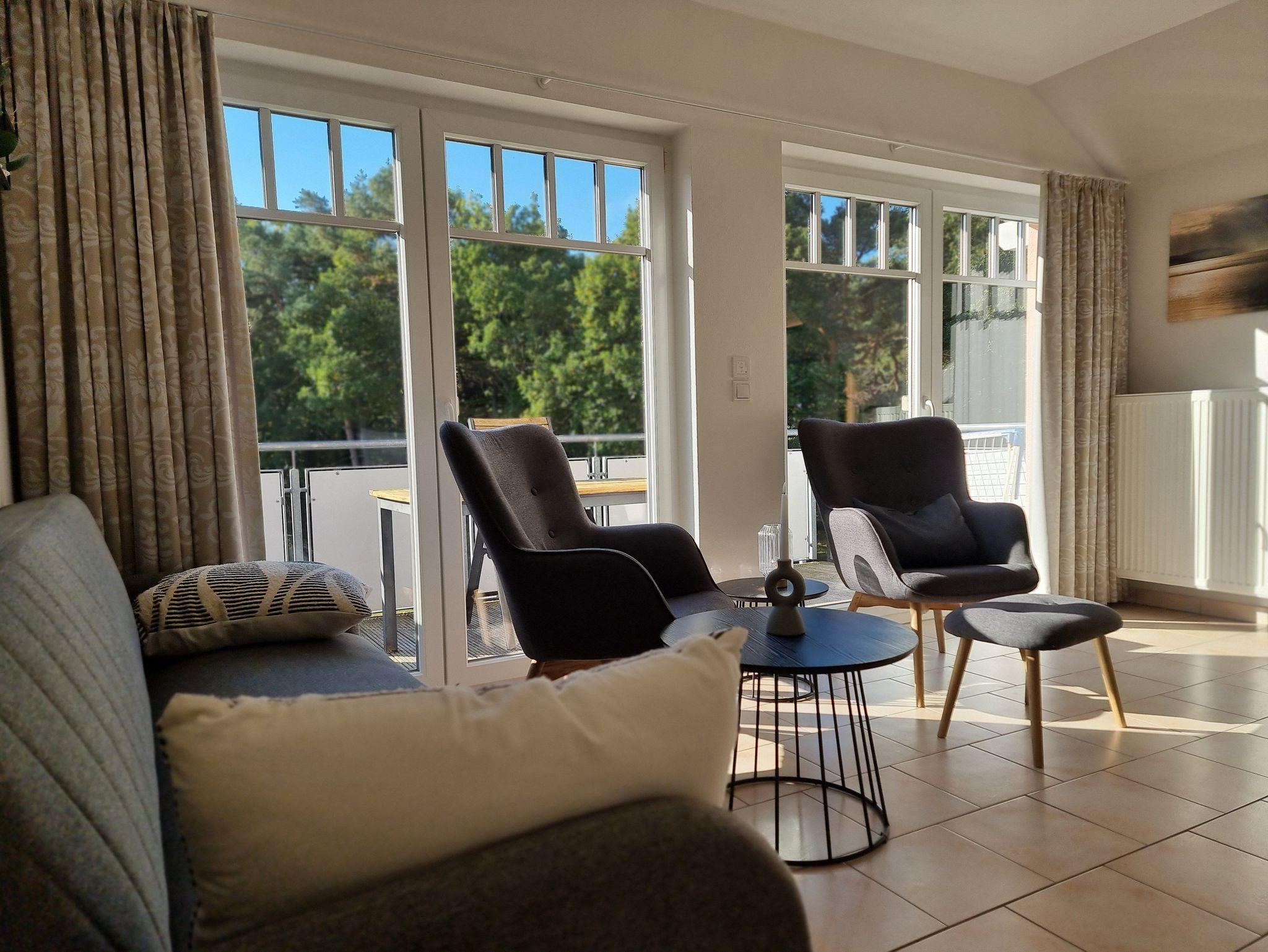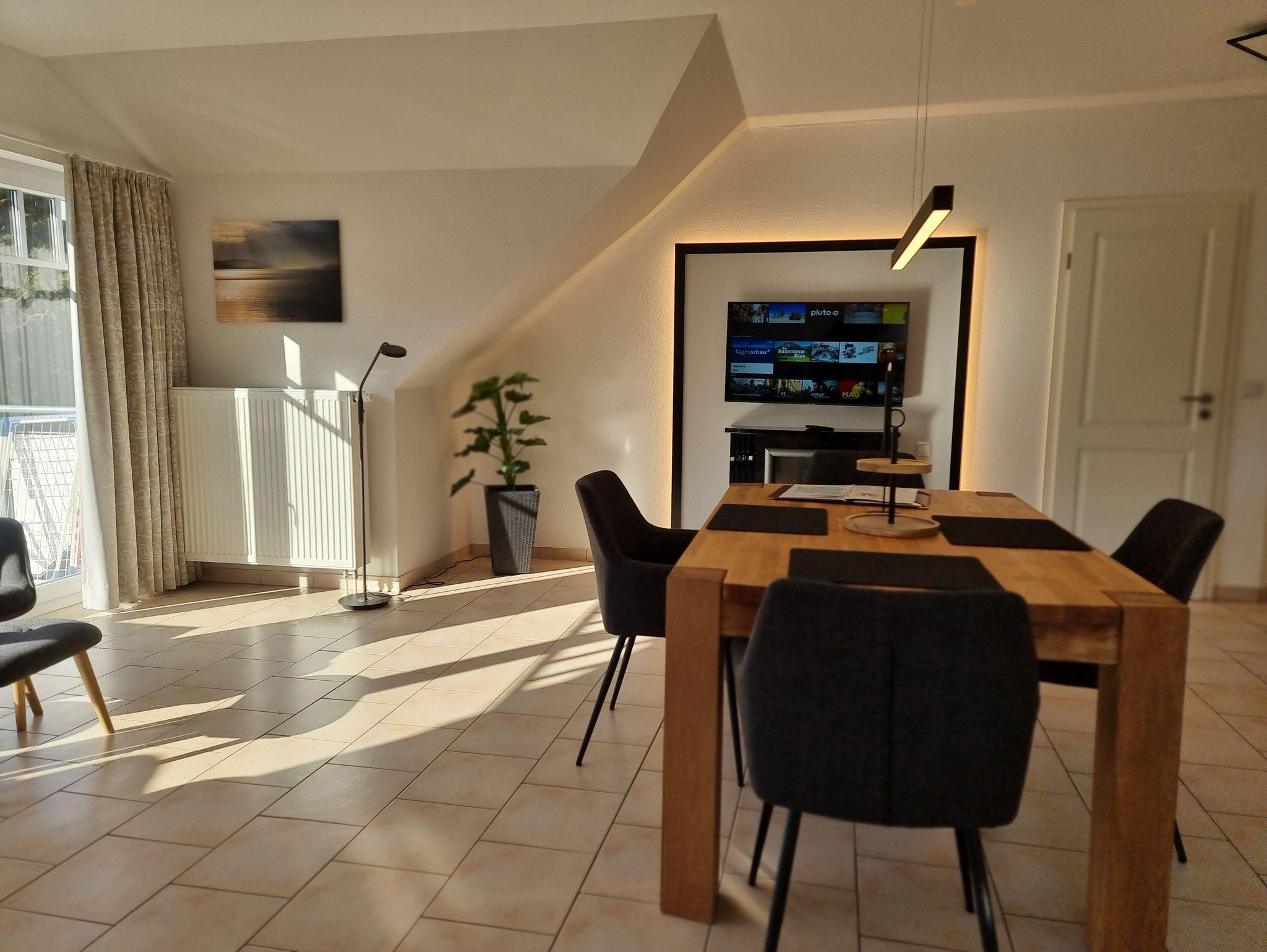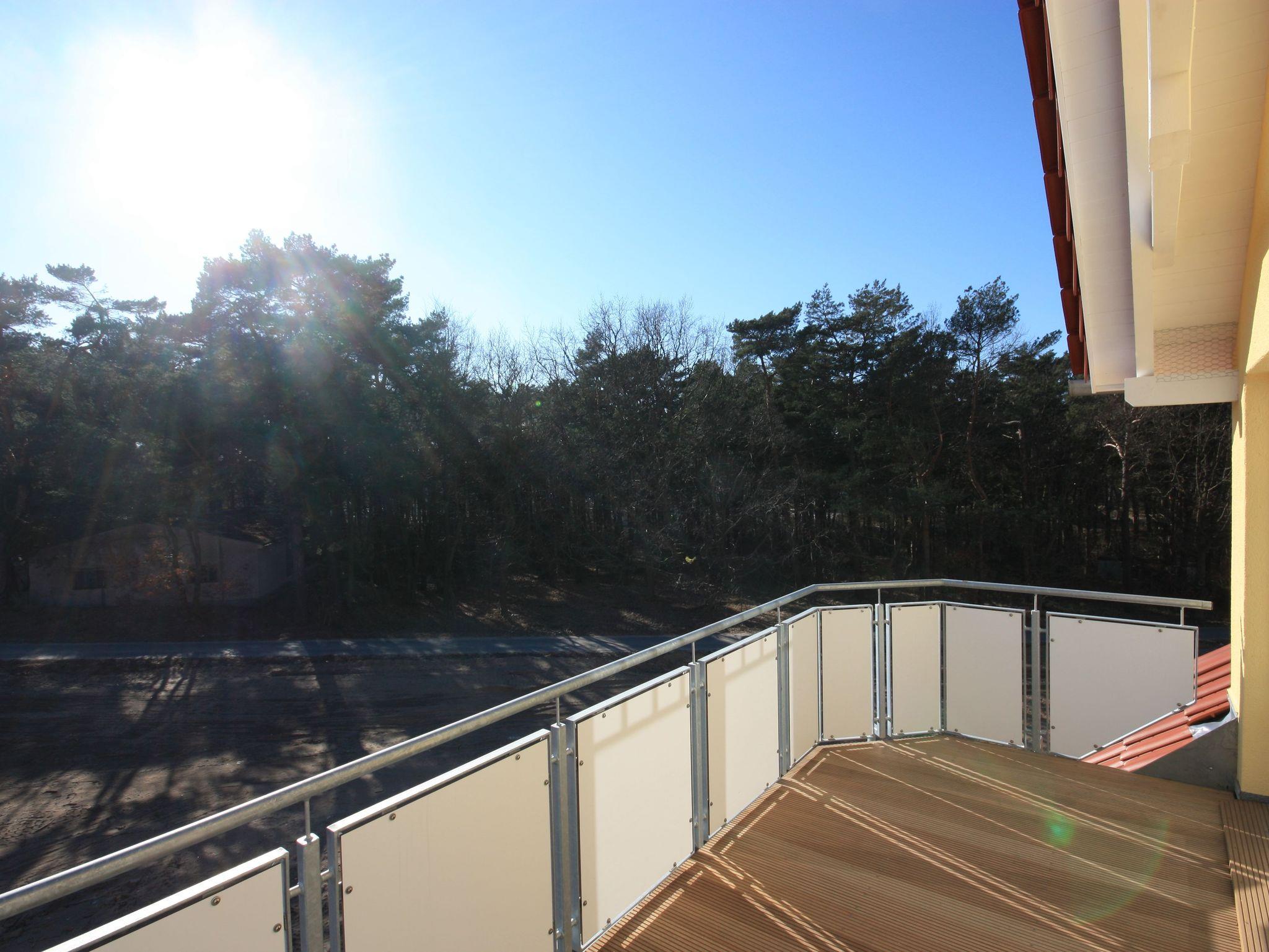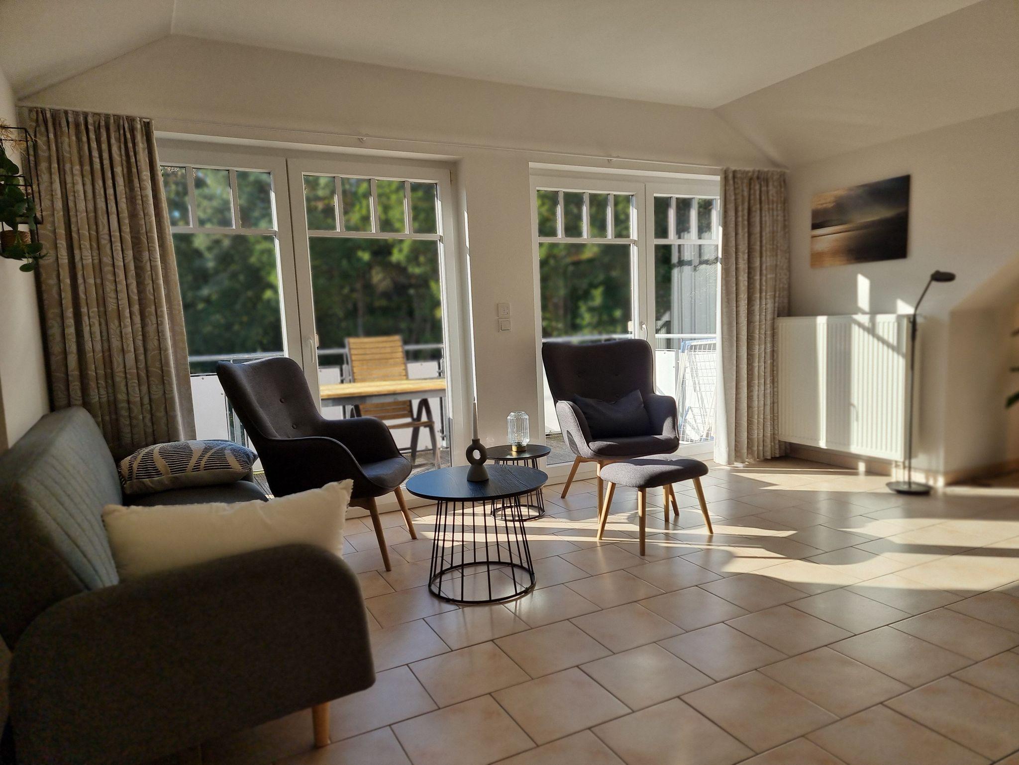 Die Ferienwohnung liegt im Dachgeschoß des Ferienhauses. Sie besteht aus Wohnzimmer, kompl. ausgestatteter Küche, Schlafzimmer und Tageslichtbad. Die Ausstattung der Einbauküche ist neuwertig funktional und qualitativ hochwertig unter anderem mit Toaster, Kaffeemaschine, Backofen mit Heißluft, Kochfeld, Geschirrspüler, Gefrierfach. Großer Südbalkon mit Blick auf den Küstenwald, große Spielwiese, Grillplatz.