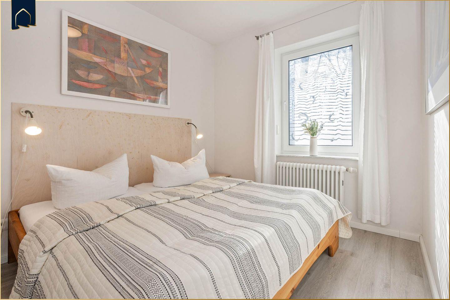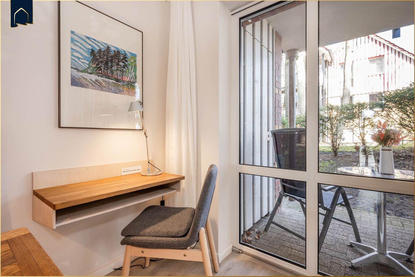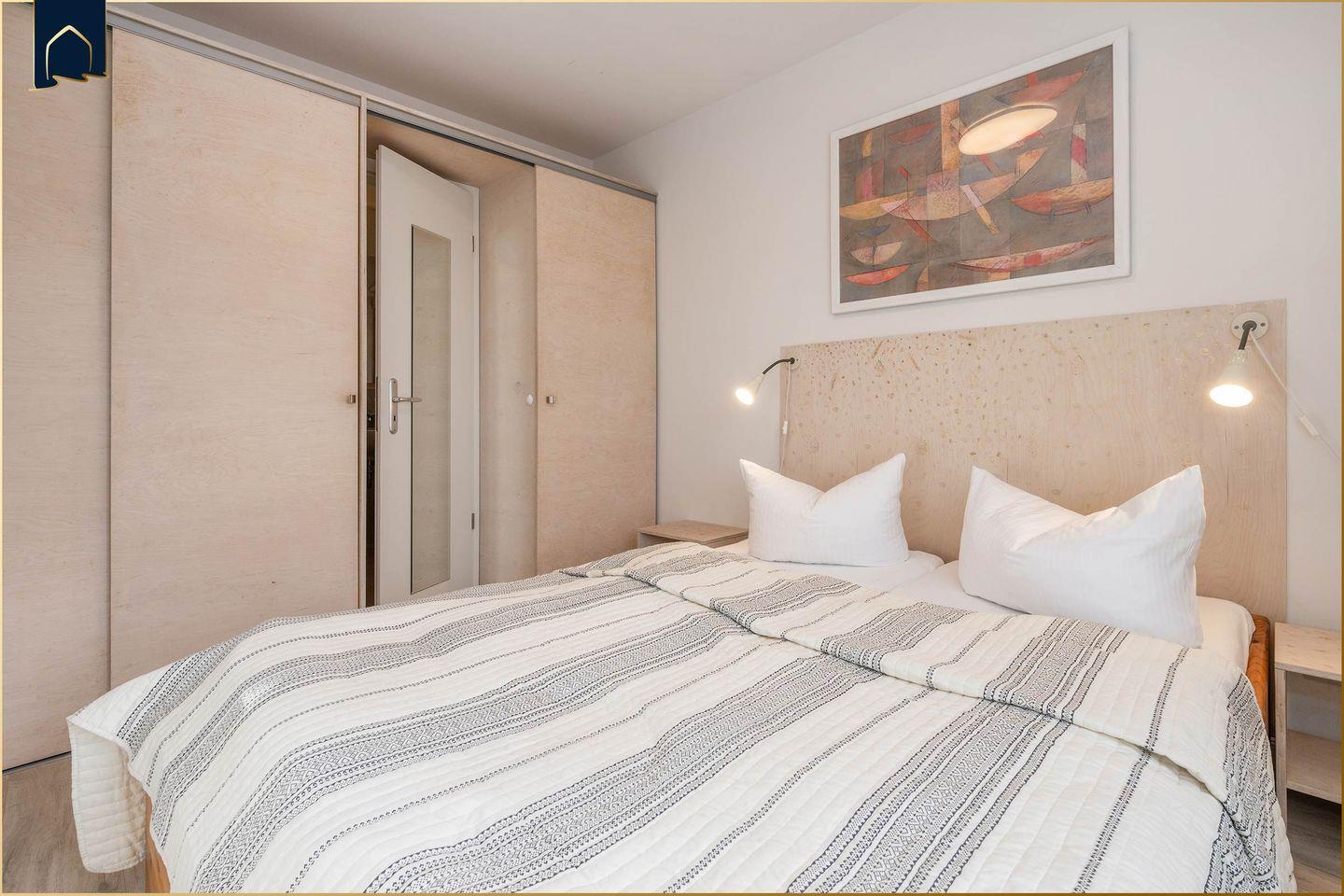 Im separaten Schlafzimmer sorgt ein bequemes Bett für erholsamen Schlaf, ergänzt durch praktische Möbel wie Kommode und Ganzkörperspiegel. Das moderne Badezimmer verfügt über Dusche, WC, Waschbecken, Haartrockner und Kosmetikspiegel. Der Zugang zur Terrasse mit Gartenmöbeln bietet Ihnen ein gemütliches Plätzchen für morgendlichen Kaffee oder laue Sommerabende. Für Unterhaltung sorgen Bücher, Spiele und DVDs. Ein privater Parkplatz steht direkt an der Unterkunft zur Verfügung, und auch Ihr vierbeiniger Begleiter ist herzlich willkommen.
